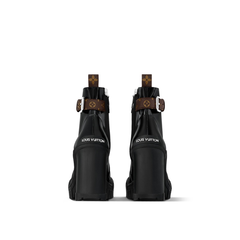 The Ruby ranger boot combines an upper in smooth calf leather with a sturdy block heel and chunky rubber outsole, giving it a distinctive, assertive silhouette. This model is complemented by refined details, including leather laces and a strap and back loop in iconic Monogram canvas. The heel bears a contrasting Louis Vuitton signature.