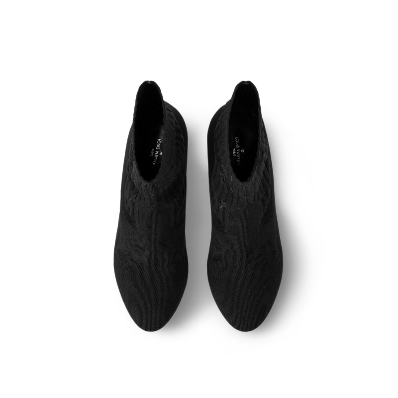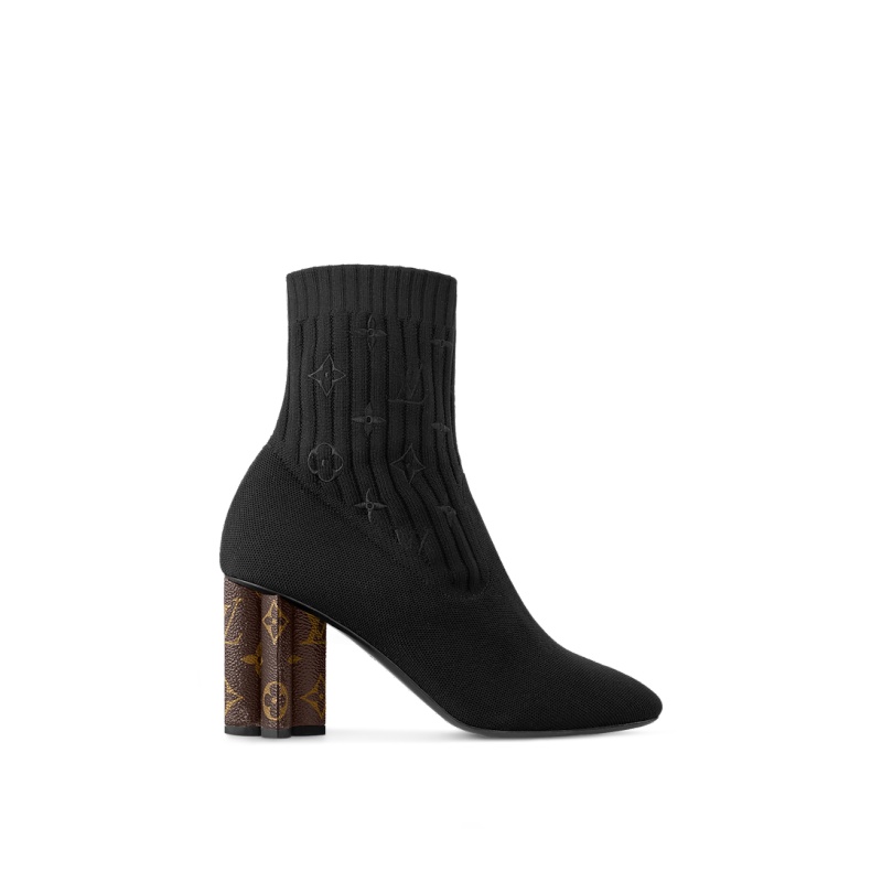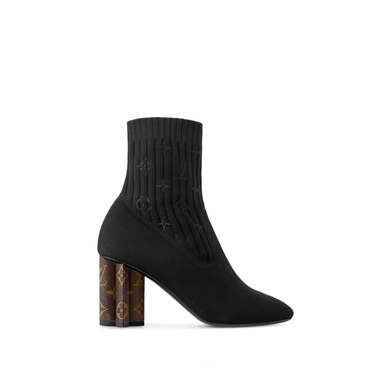 One of Louis Vuitton��s most emblematic styles, the Silhouette ankle boot is revisited in black stretch textile, which provides a second-skin fit. The signature of the Silhouette line is its heel, which is shaped like a Monogram Flower and covered in patent Monogram canvas. This model features a padded insock for enhanced comfort.