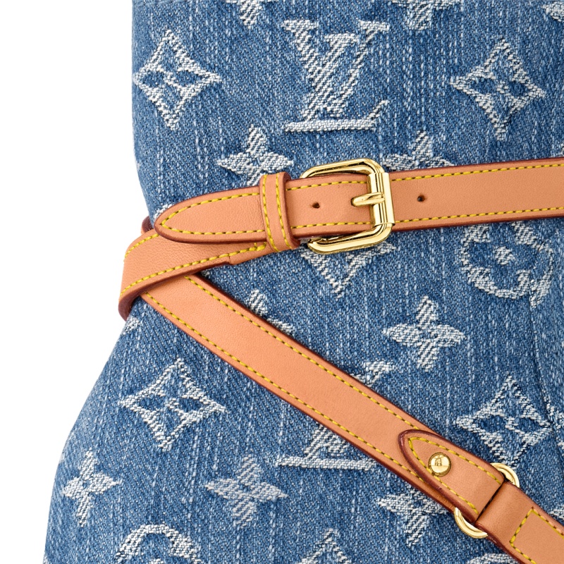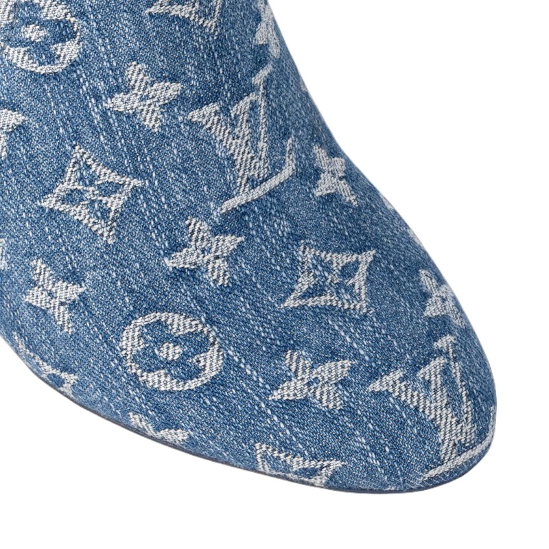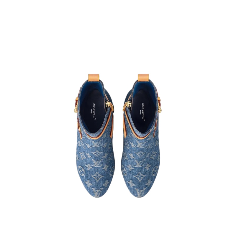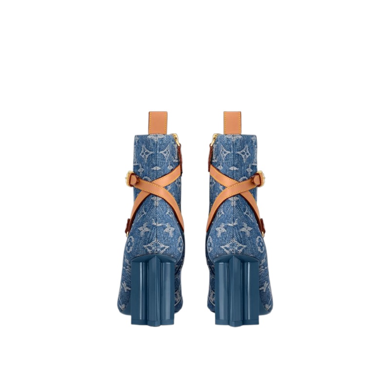 The iconic Silhouette ankle boot is revisited in bleached Monogram denim, coordinating with the season��s leather goods. A decorative strap in natural calf leather with a gold-tone stud and buckle nods to historic Louis Vuitton trunks. This model is notable for its Monogram Flower-shaped heel, which is color-matched to the upper.