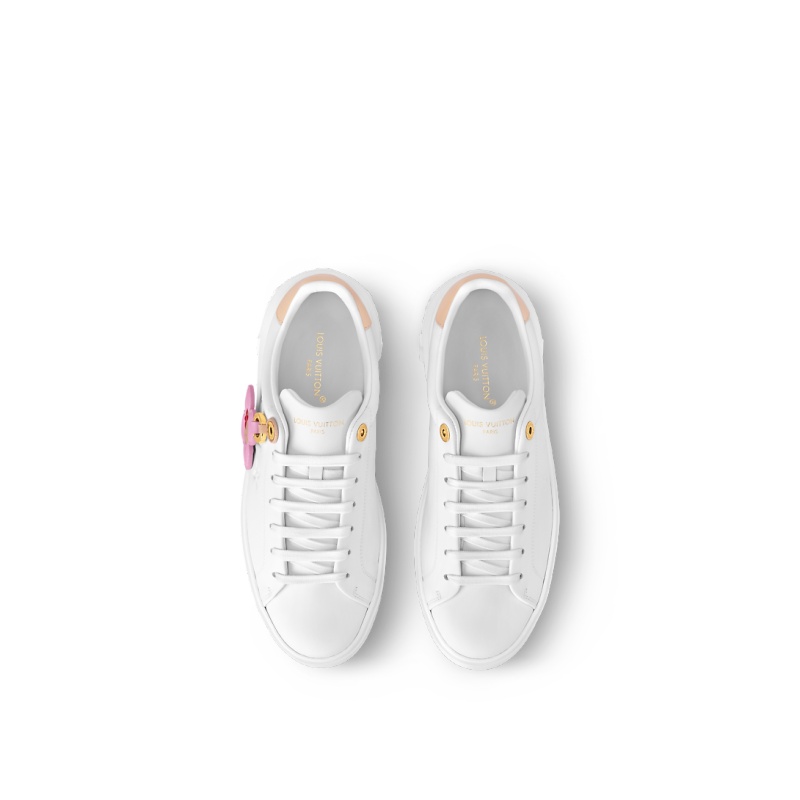 This refined interpretation of the Time Out sneaker comes in soft calf leather, which is discreetly embossed with the LV Initials and Monogram Flowers on the side. A pastel-colored charm featuring the Louis Vuitton Vivienne mascot hangs from an engraved, gold-toned ring. The back of the sneaker is trimmed with the House��s emblematic natural leather.