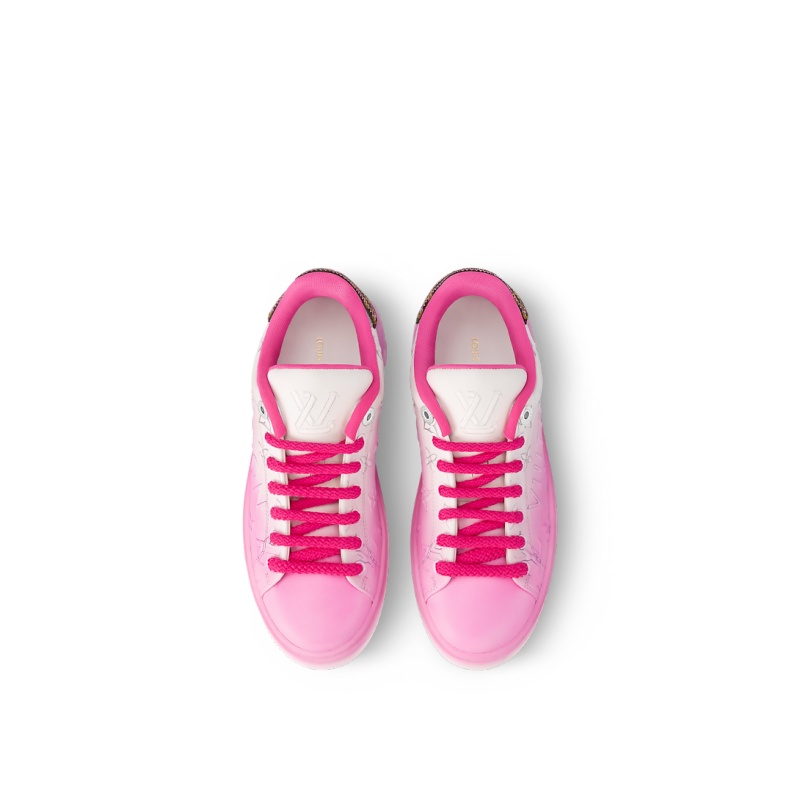 The emblematic Time Out sneaker is reworked this season in soft calf leather, which is debossed with a Monogram pattern with a color fading effect. This richly detailed design also features an oversized Vuitton signature on the side, a LV upcycling logo embroidered on a slightly padded tongue and a thick textile tone on tone laces. Its distinctive elevated, treaded rubber outsole is decorated with a 3-D pattern of Monogram Flowers.