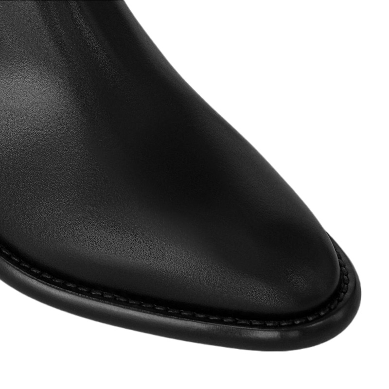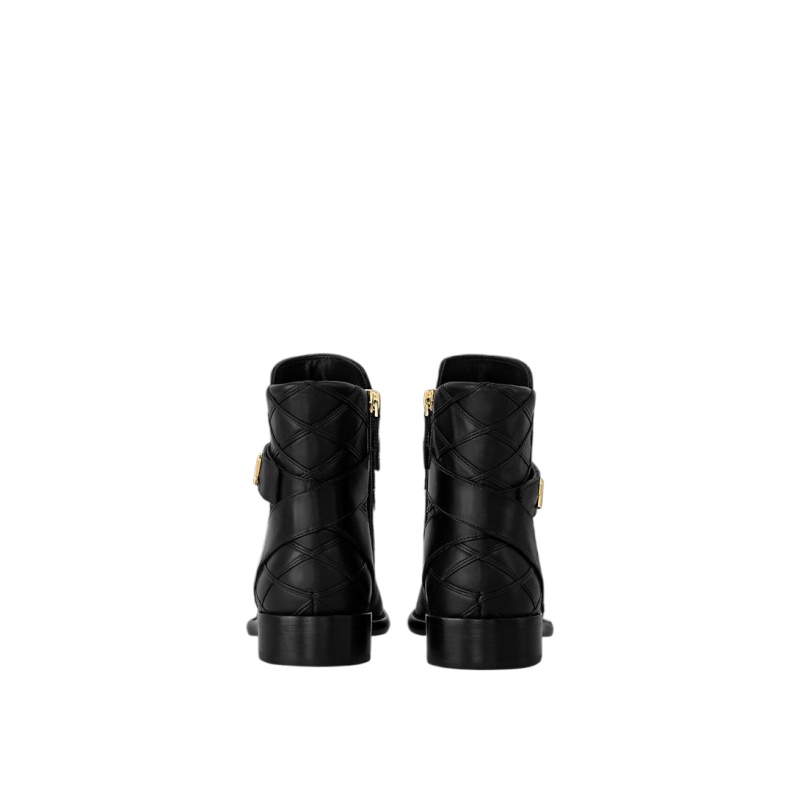 The Westside ankle boot is revisited this season in soft lambskin partially decorated with a crisscross pattern of leather ribbons evoking the Malletage lining of Louis Vuitton trunks. This elegant, equestrian-inspired style also features a strap with a gold-tone LV Twist accessory referencing the clasp of the iconic Twist bag.