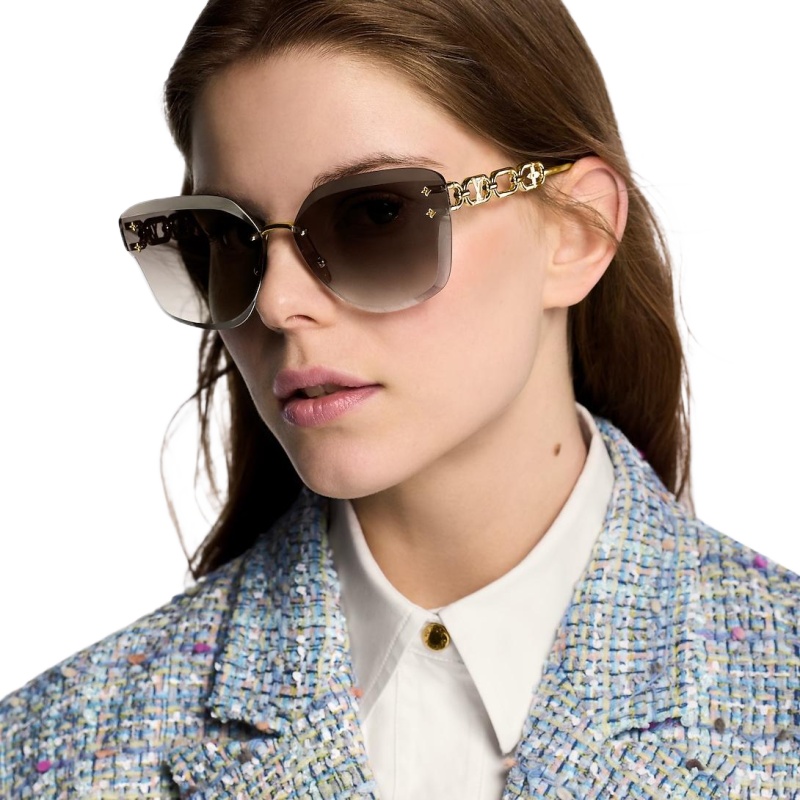 Delicate rimless lenses combine with bold chain-effect temples to give the LV Jewel Cat Eye sunglasses their unique look. Classic House signatures are revealed in subtle details throughout this pair. The iconic LV Initials are incorporated into the chain link design while hand-polished Monogram Flower studs adorn the smoky gradient lenses.