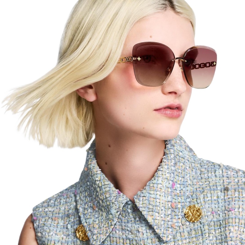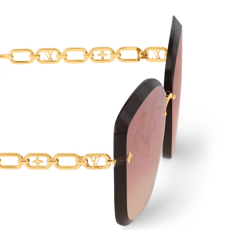The precious LV Jewel Round Cat Eye sunglasses offer a glamorous way to wear the Louis Vuitton signature. Their rimless design features slim chain temples in radiant gold-toned metal with the LV Initials and Monogram Flowers embedded in the links. Monogram Flower studs on the faceted hand-polished lenses add an extra House touch.