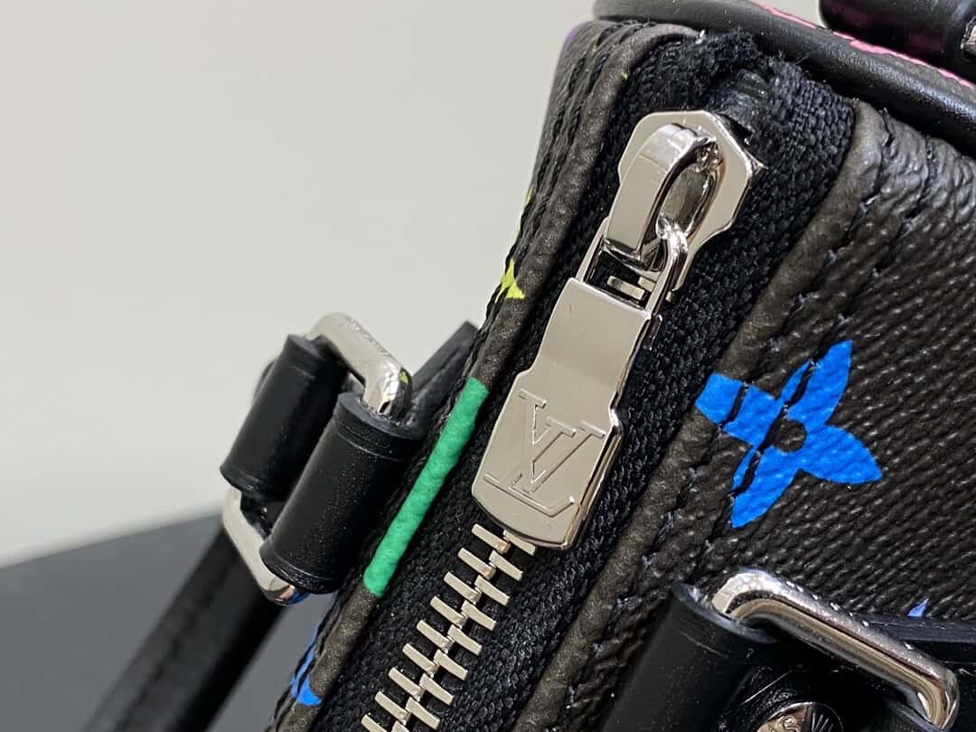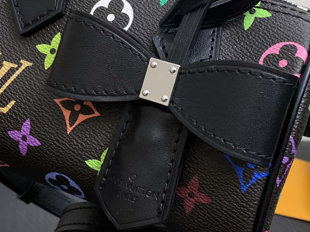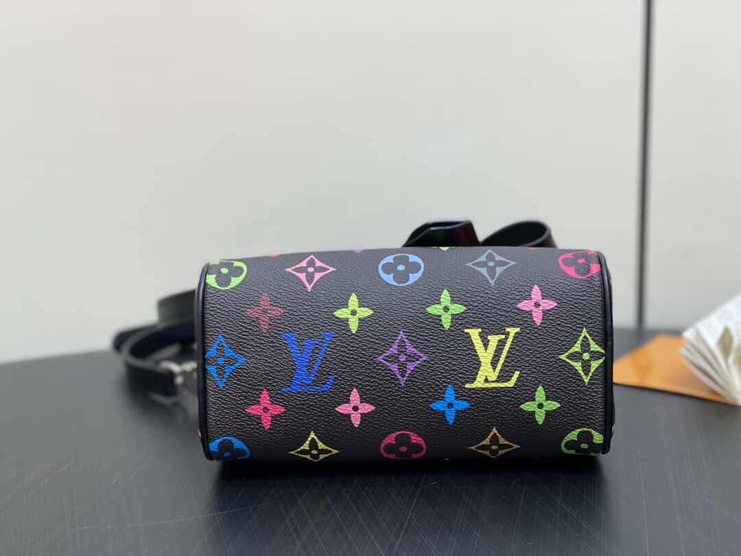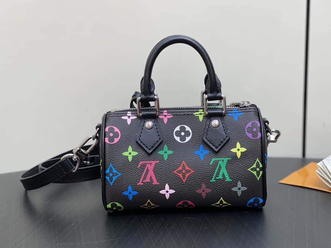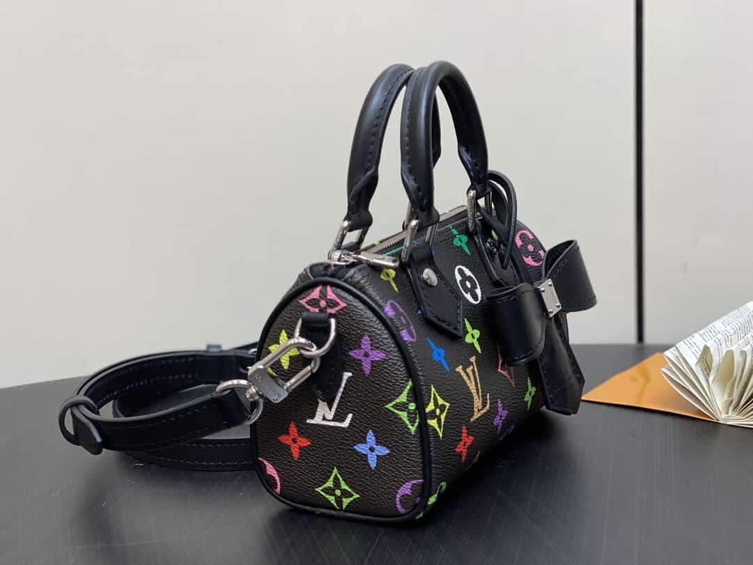 The scaled-down Nano Speedy makes a playful statement in Monogram coated canvas, which has been reworked in upbeat tones as part of the re-edition of the Louis Vuitton x Murakami collection. Natural cowhide leather trims add a timeless touch, as do two Toron top handles and a gleaming golden padlock in homage to the House’s travel heritage. Complete with a removable, adjustable strap and an exclusive LV x TM keybell.