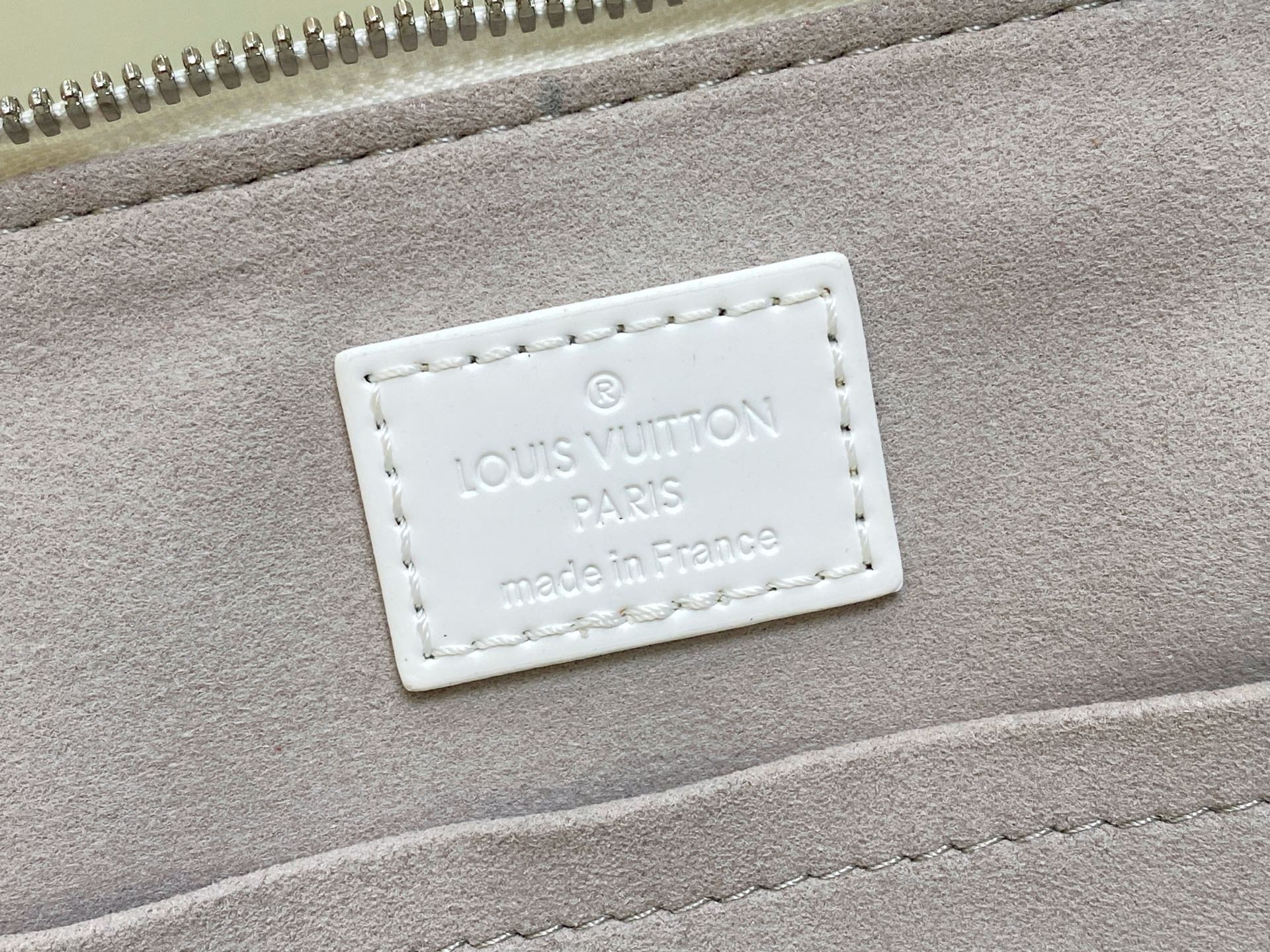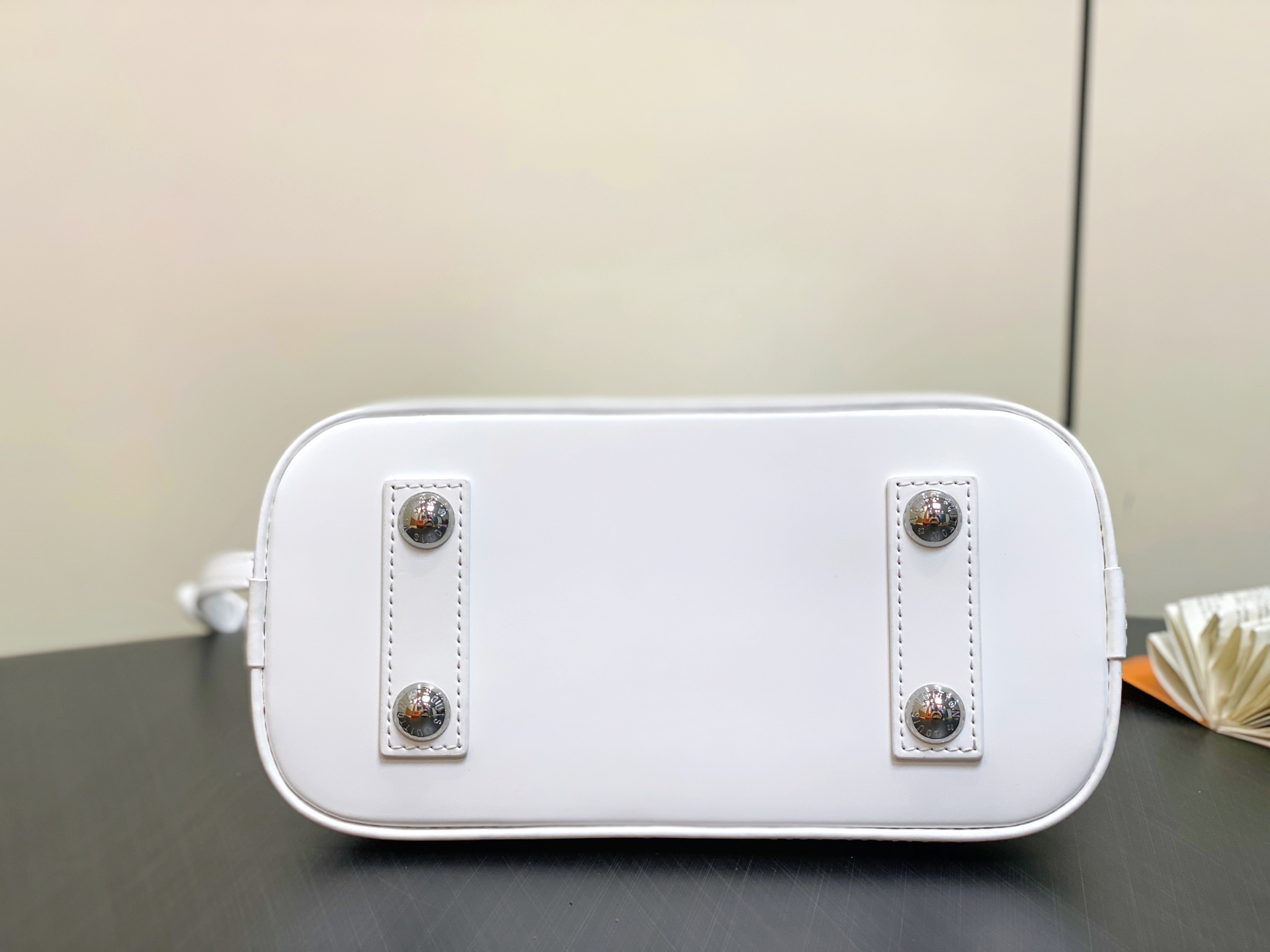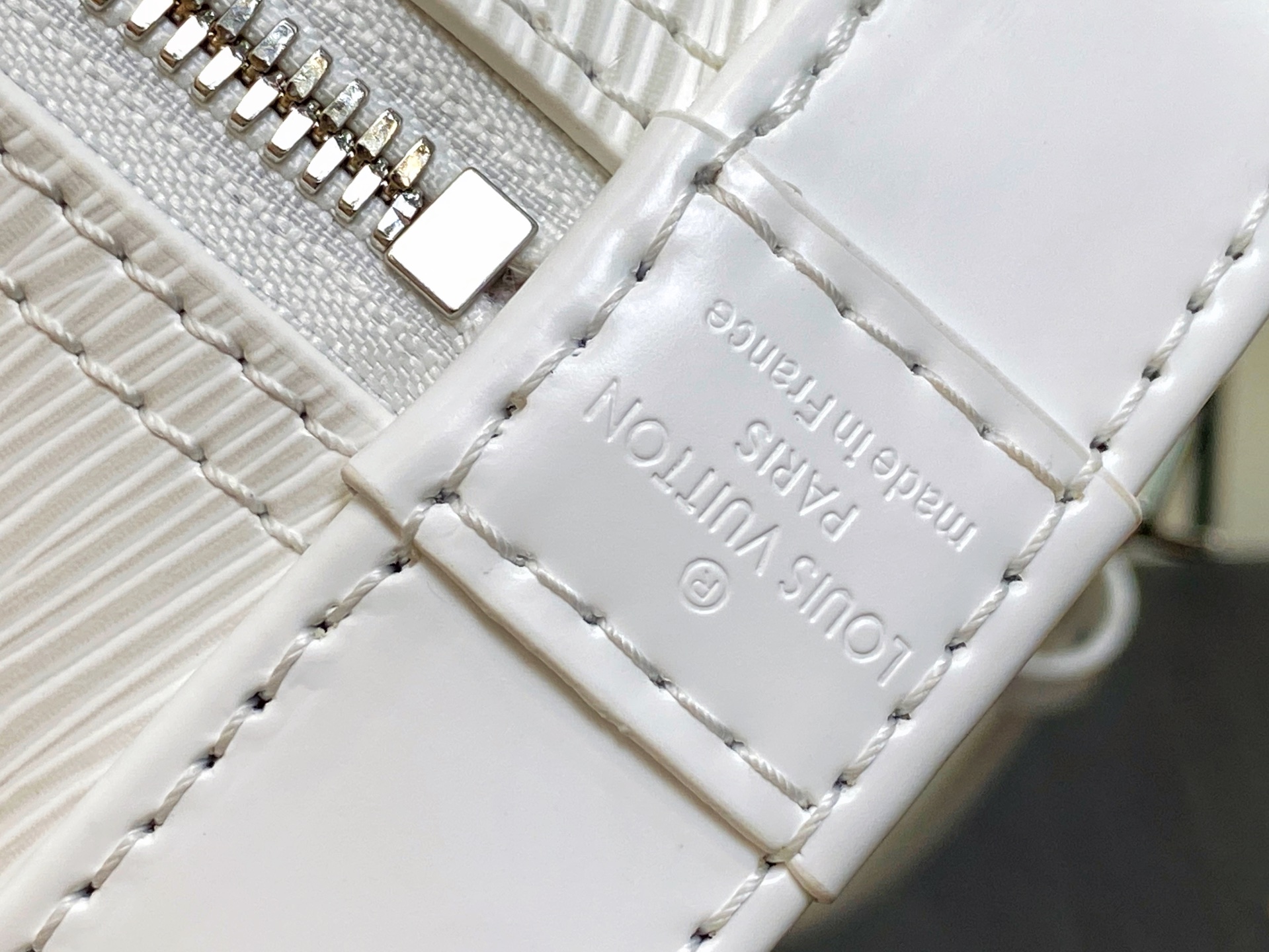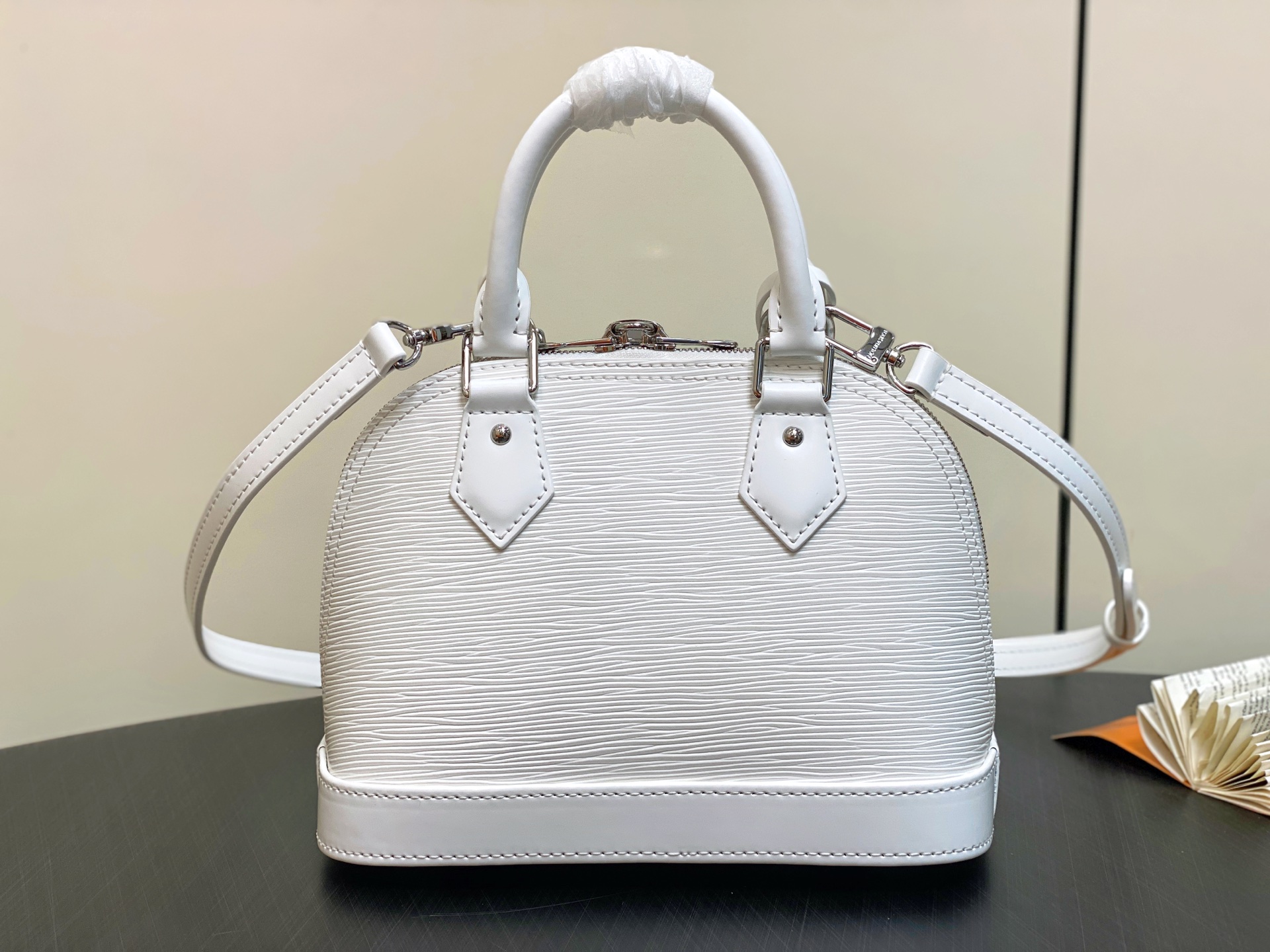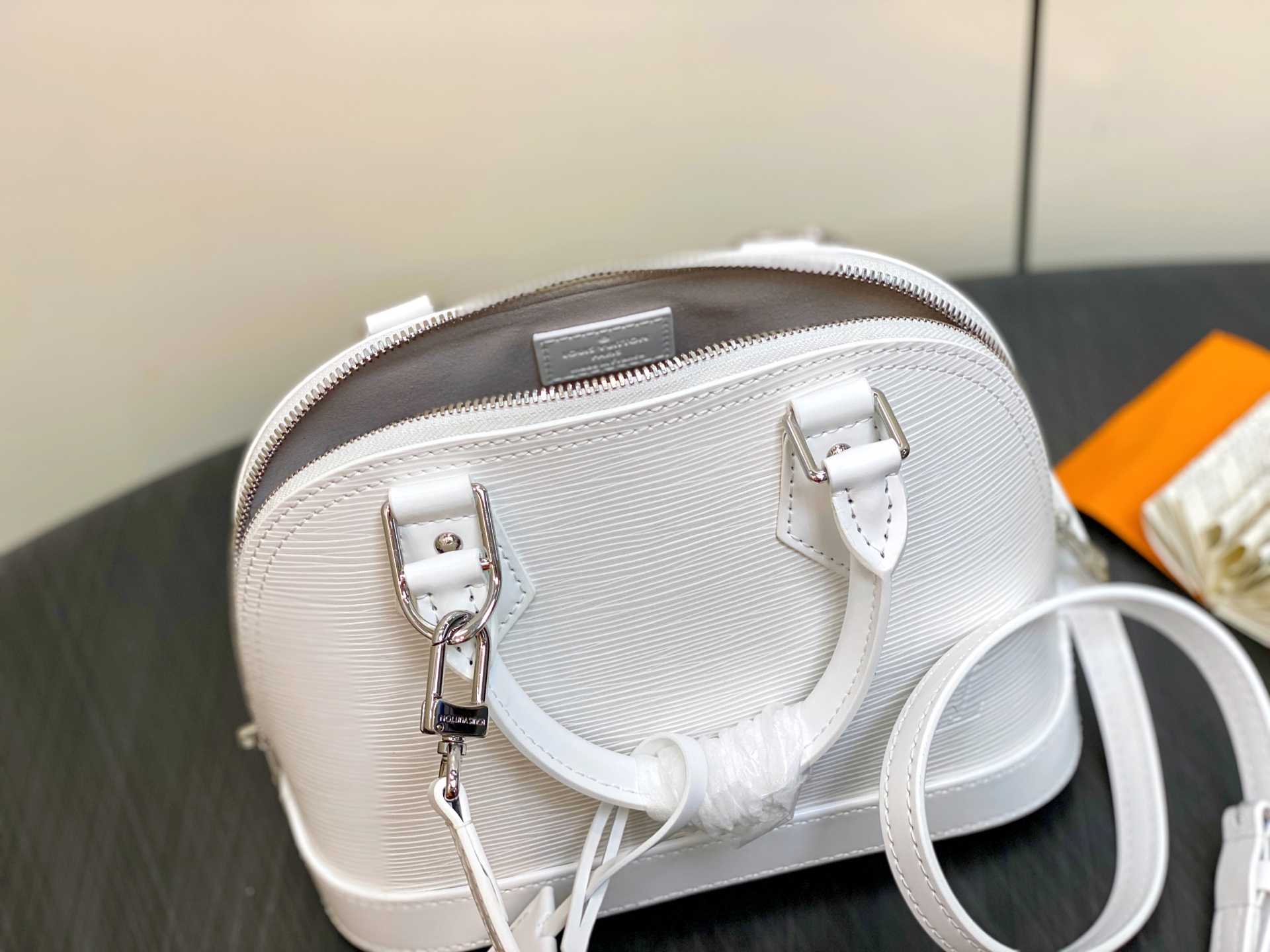 This Alma BB handbag is made from grained Epi leather with silver-color hardware. Classic House details such as the padlock and key bell elevate its Art Deco design. The simple microfiber-lined interior includes a flat pocket to keep things organized. The two top handles and removable and adjustable leather strap give carry options.