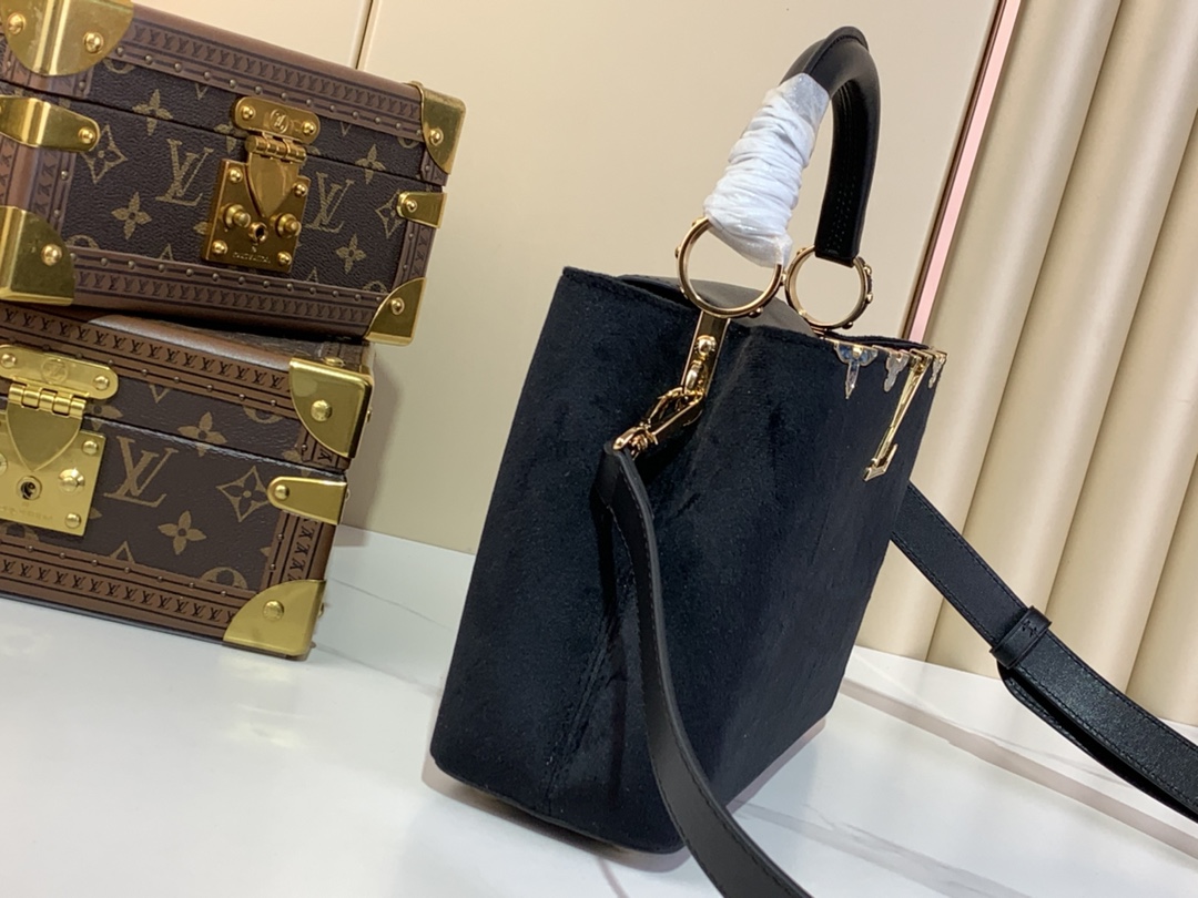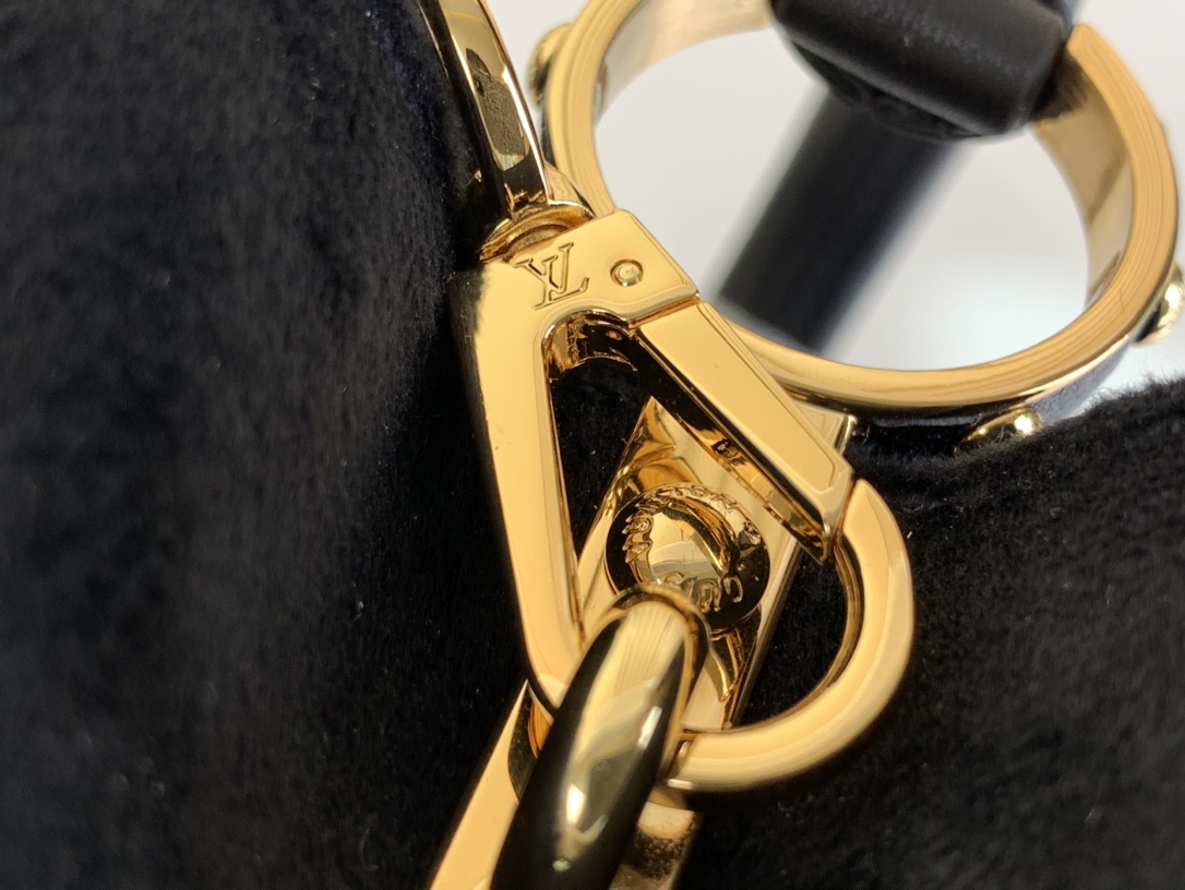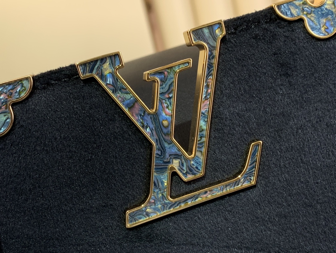 Perfect for elegant soirées, this plush velvet edition of the iconic Capucines BB is part of the House’s Flower Crown story. It is embellished with a colored abalone shell Flower Crown and LV signature, and opens to reveal an organized interior complete with multiple pockets to store evening essentials. Carry it by hand or attach the shoulder strap to wear it cross-body.