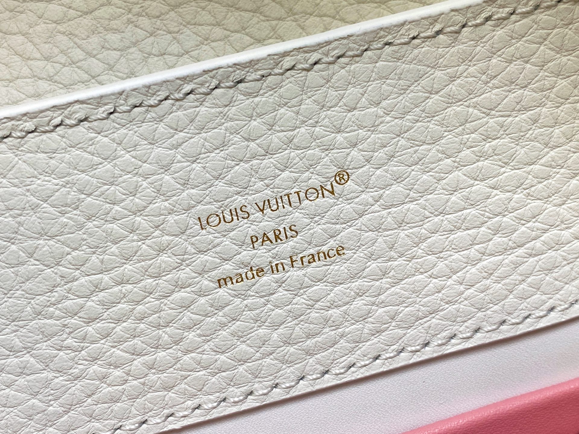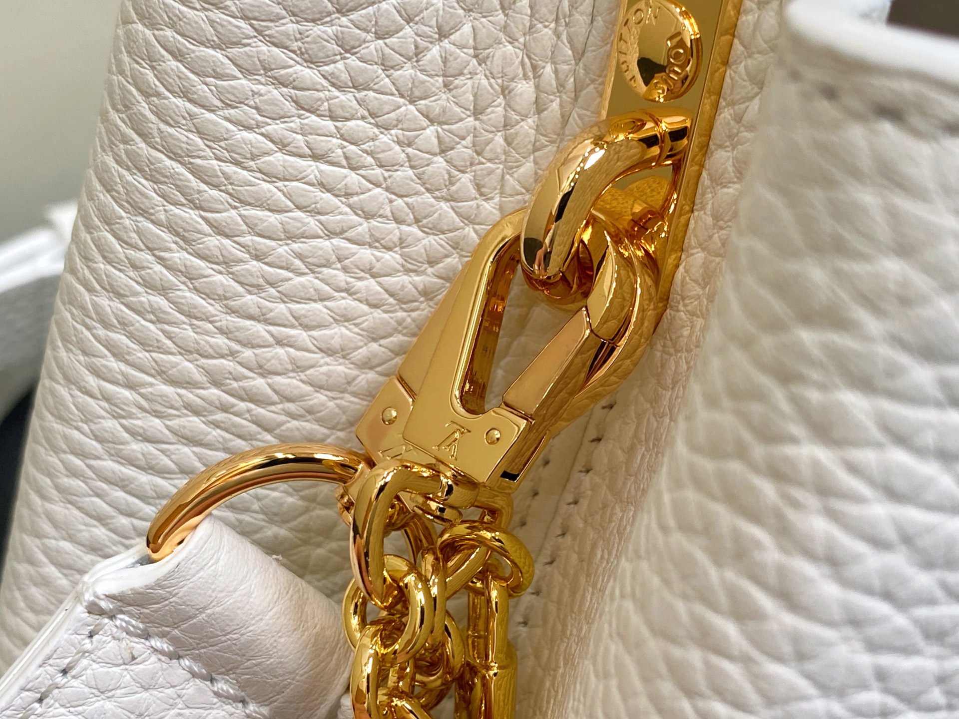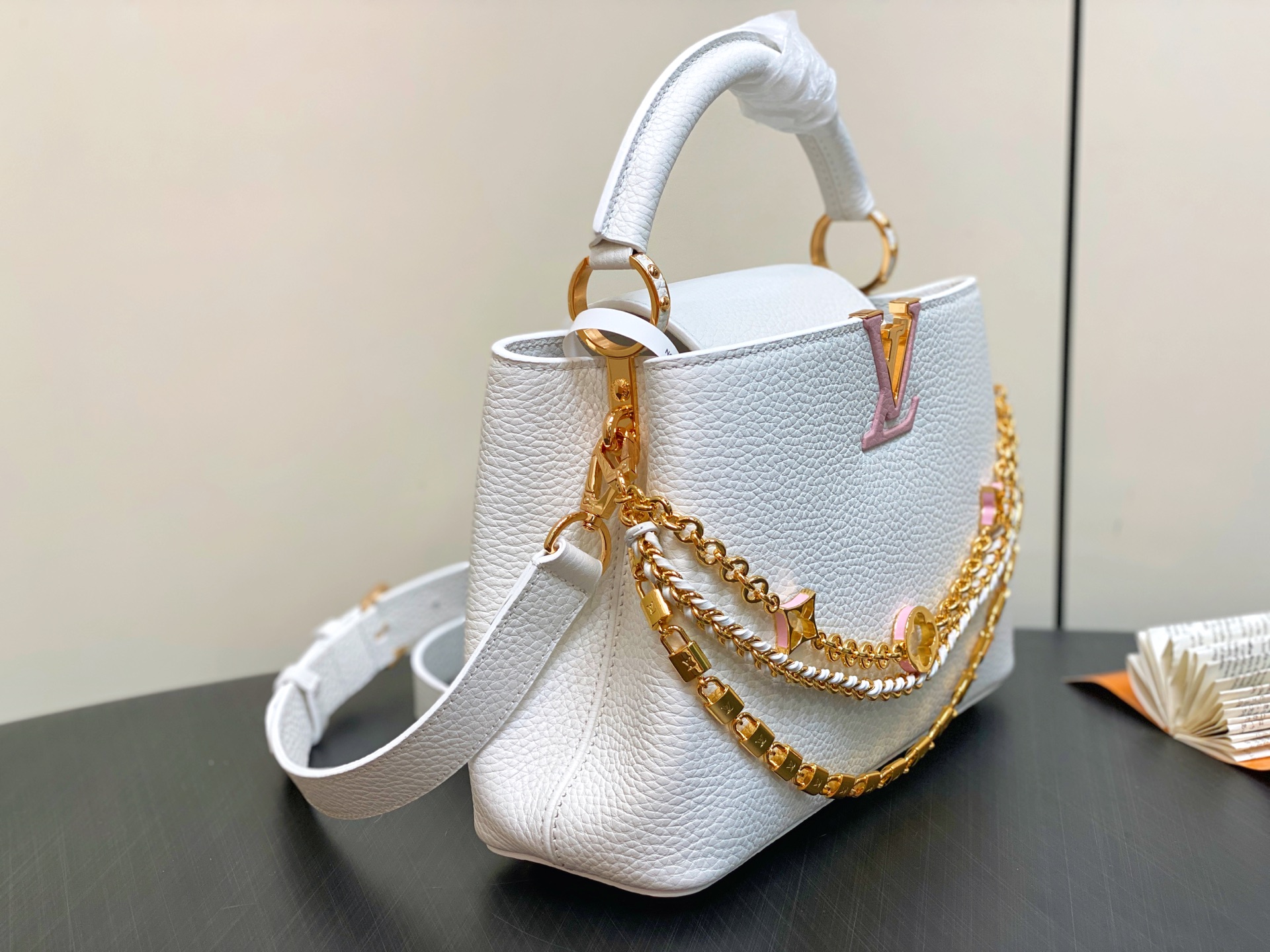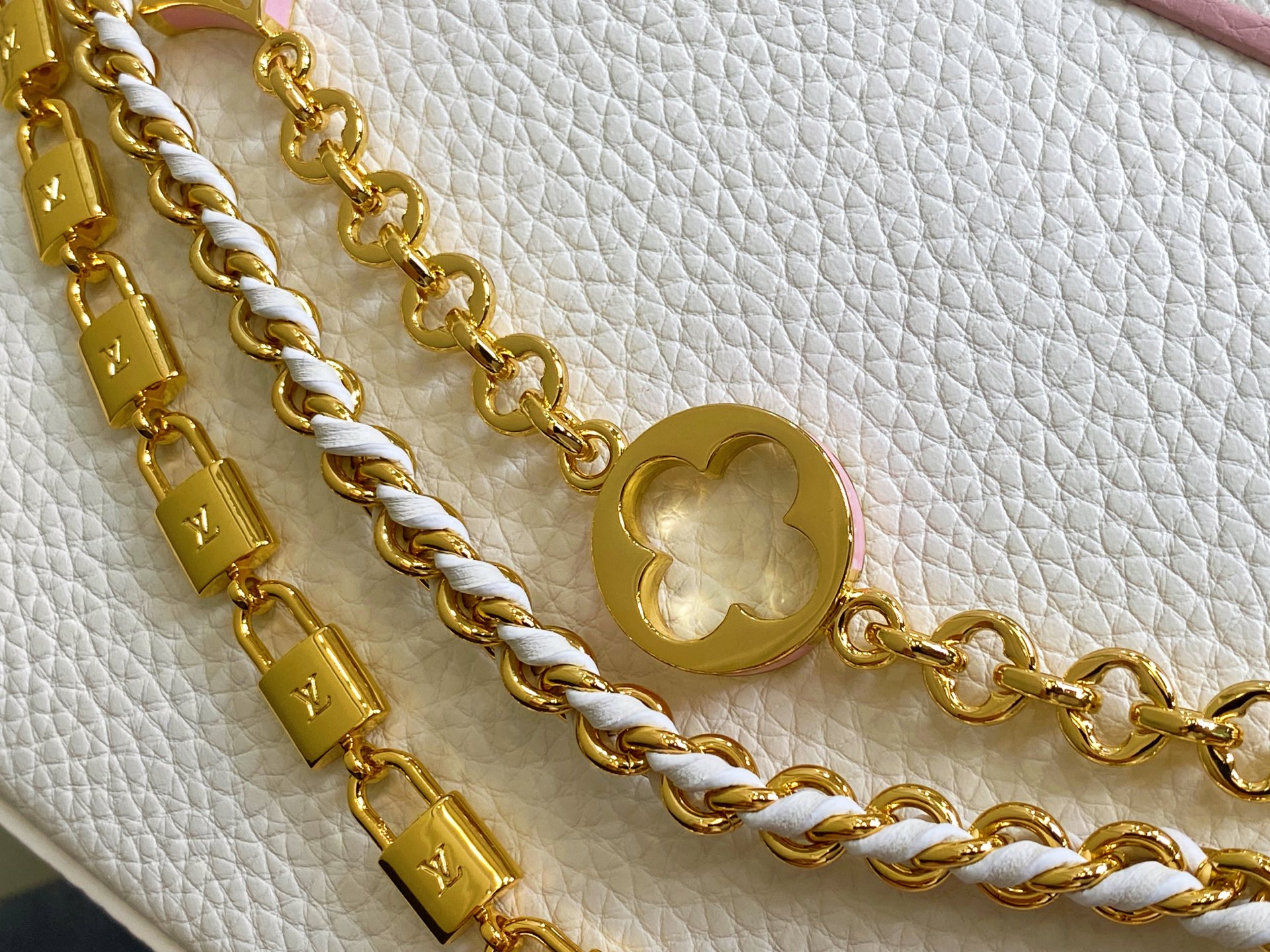 Part of the Trilogy line, this Capucines BB is the epitome of sophistication with its triple chain adornment. Look closely to notice the jewel-like chain details, including signature mini padlocks and enameled Monogram flowers. This double-carry style is crafted from iconic Taurillon leather and is accented with gold-toned hardware. It is fitted with multiple interior pockets and can be worn several ways.