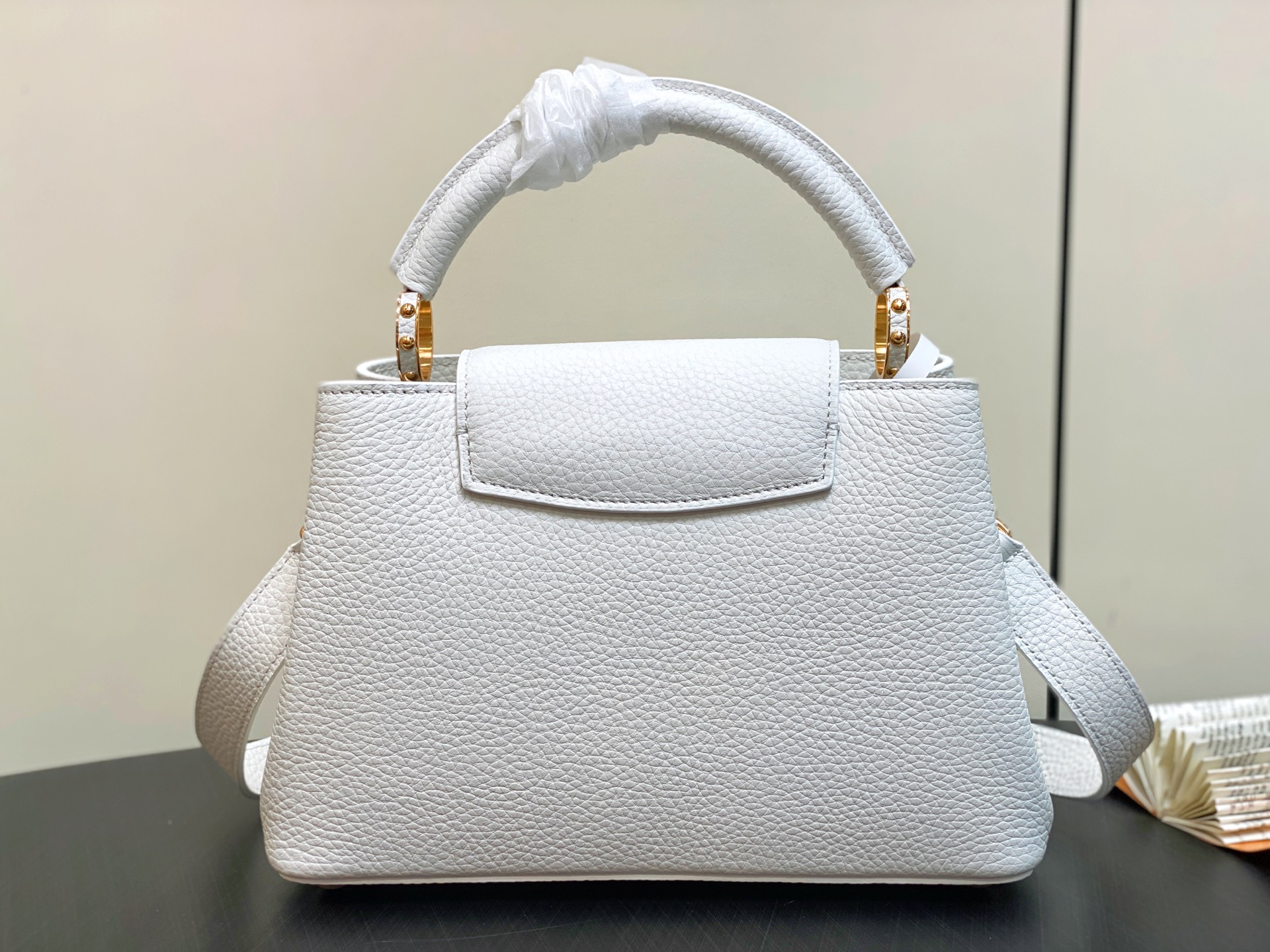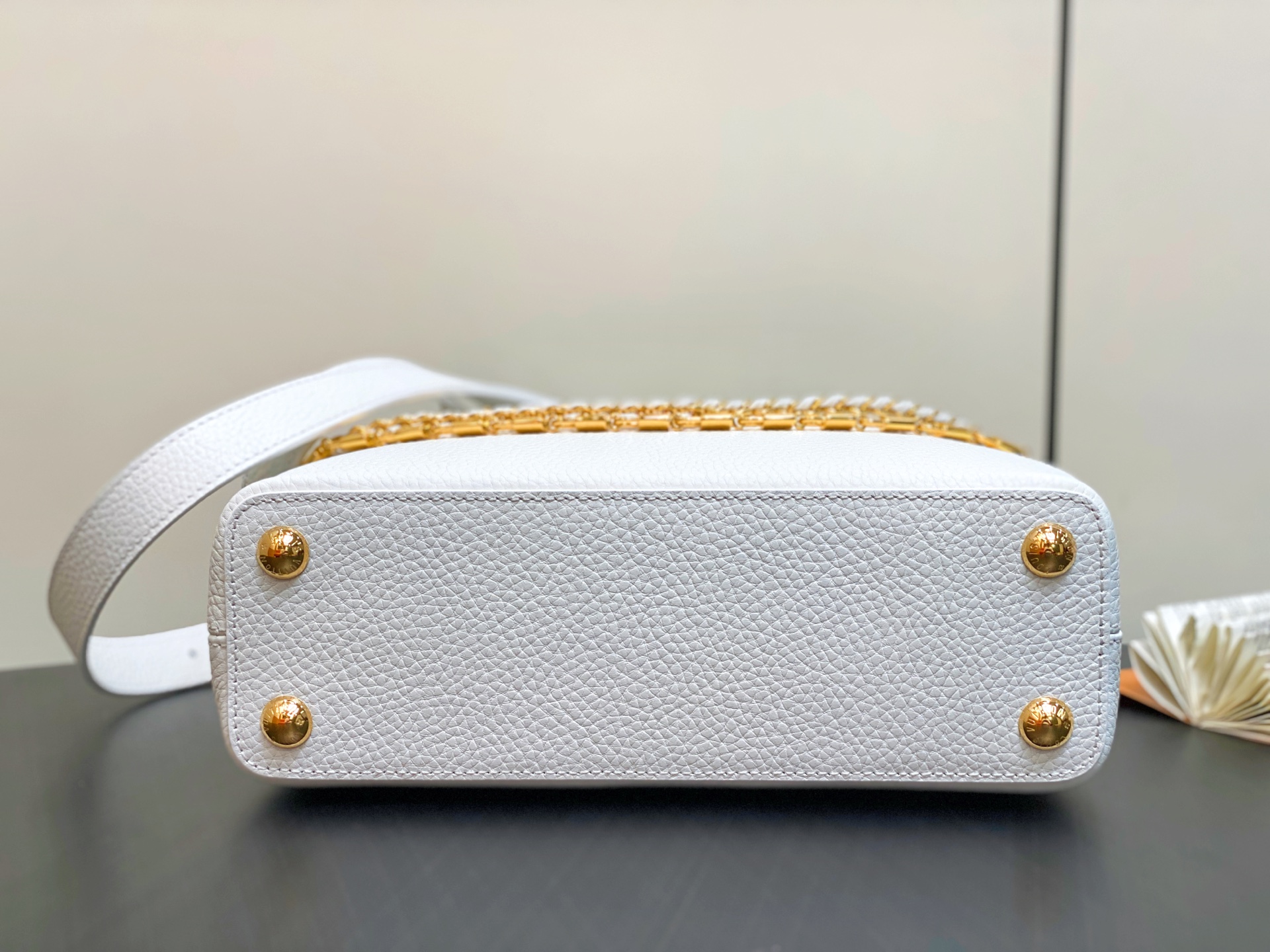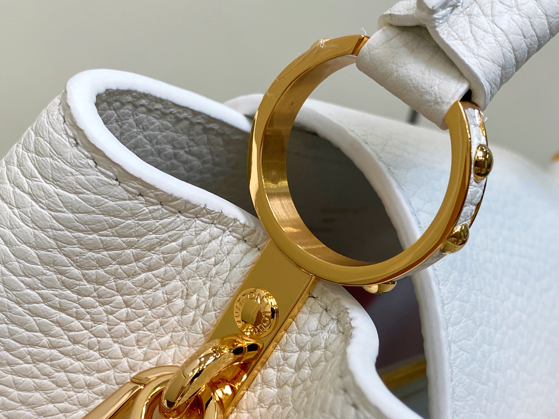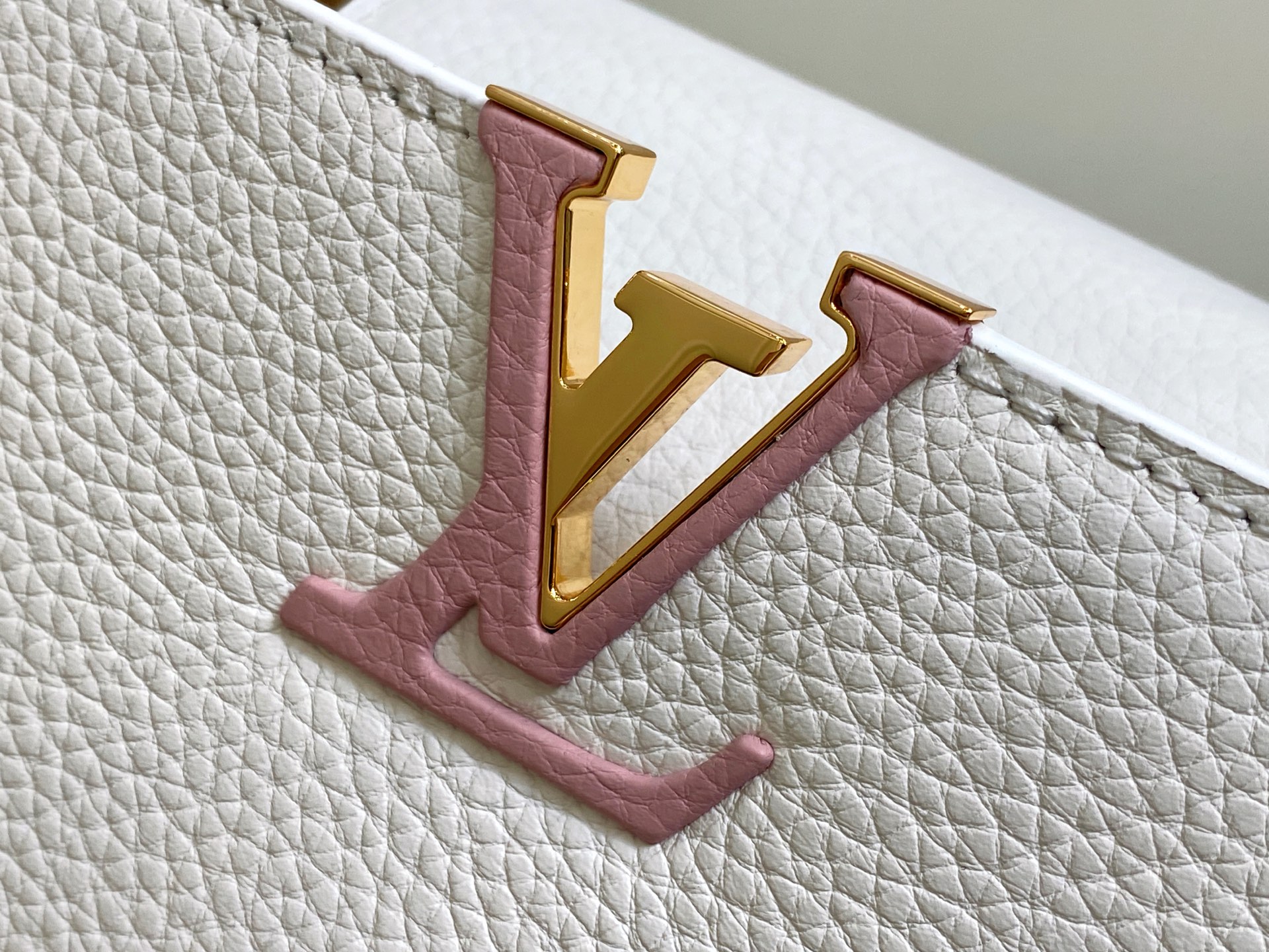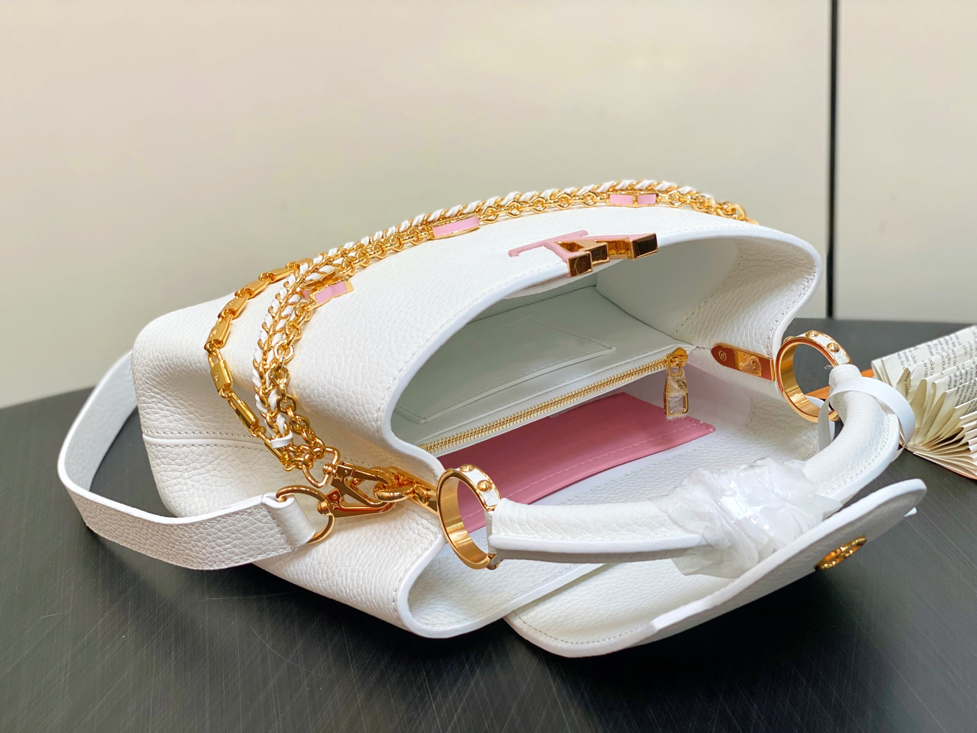 Part of the Trilogy line, this Capucines BB is the epitome of sophistication with its triple chain adornment. Look closely to notice the jewel-like chain details, including signature mini padlocks and enameled Monogram flowers. This double-carry style is crafted from iconic Taurillon leather and is accented with gold-toned hardware. It is fitted with multiple interior pockets and can be worn several ways.