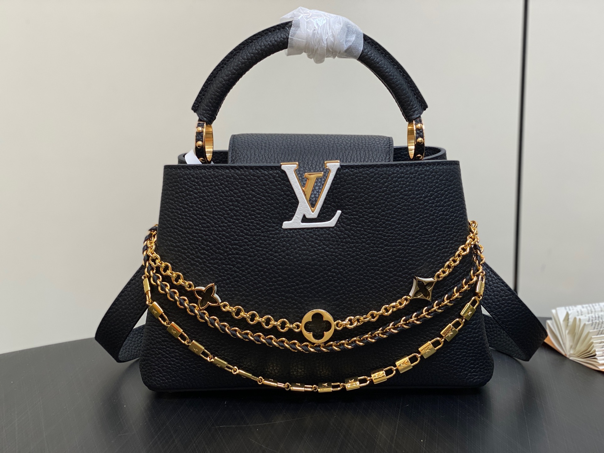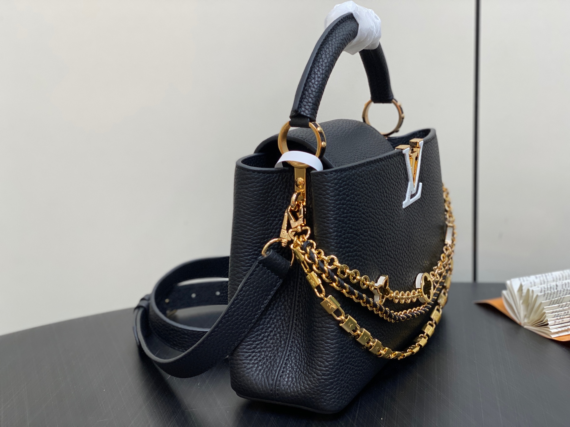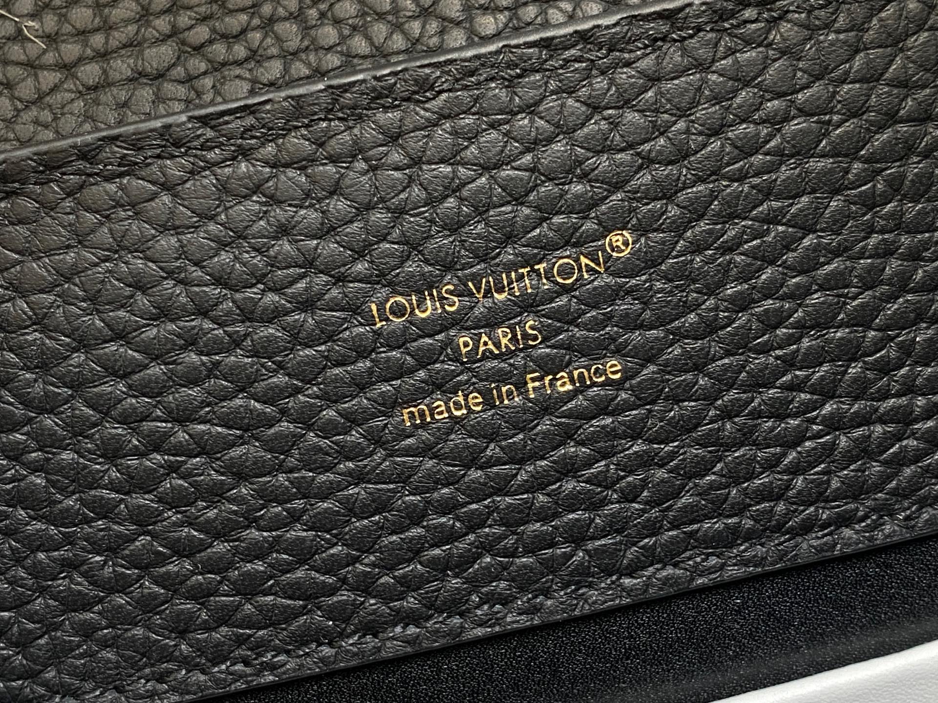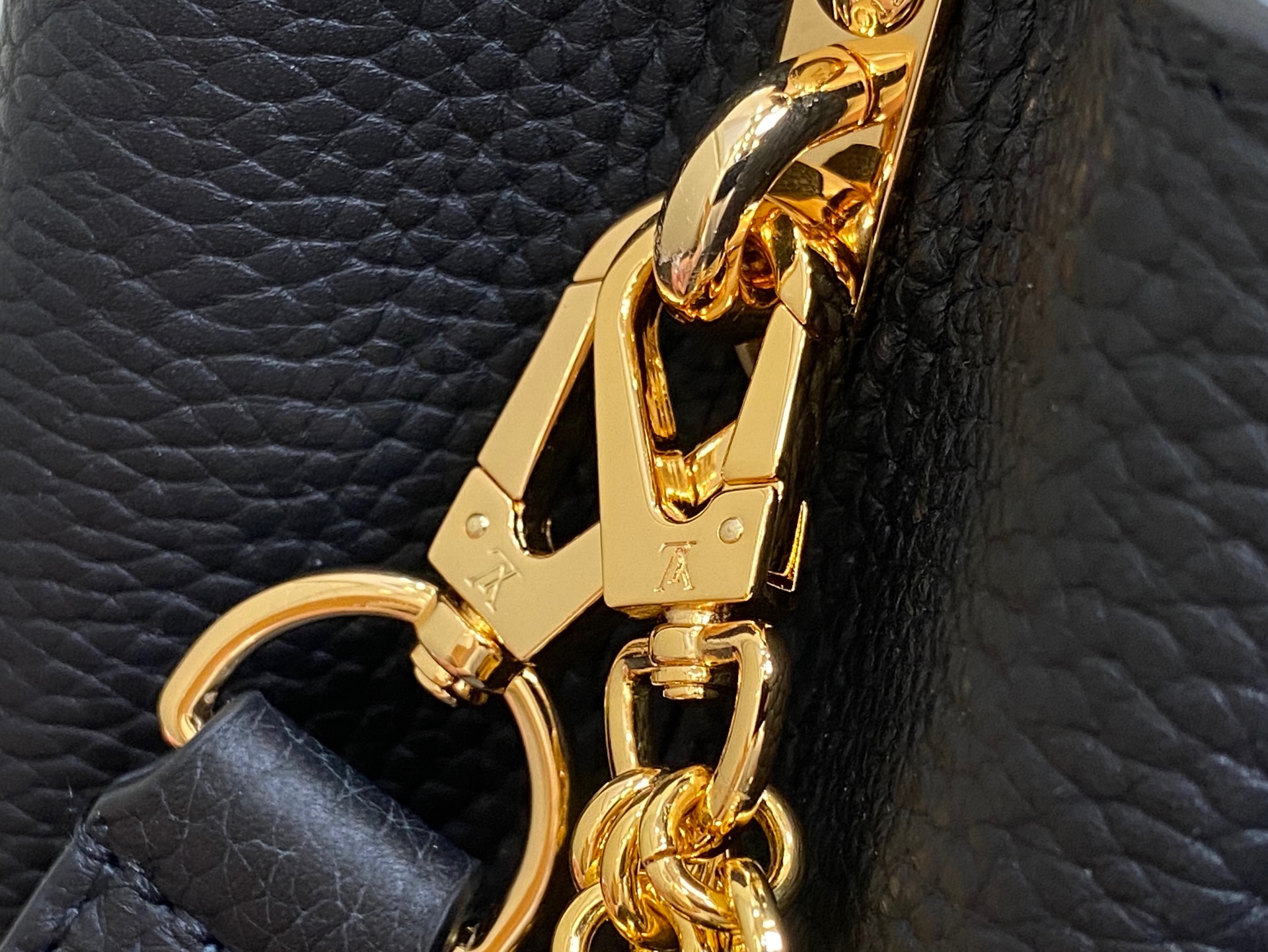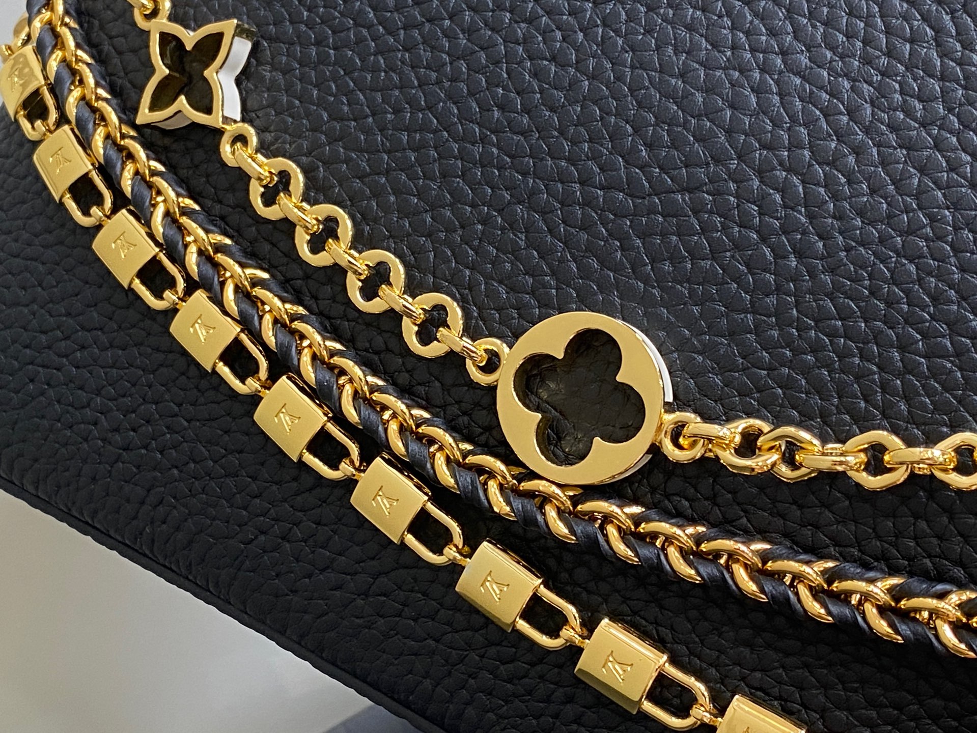 Part of the Trilogy line, this Capucines BB is the epitome of sophistication with its triple chain adornment. Look closely to notice the jewel-like chain details, including signature mini padlocks and enameled Monogram flowers. This double-carry style is crafted from iconic Taurillon leather and is accented with gold-toned hardware. It is fitted with multiple interior pockets and can be worn several ways.