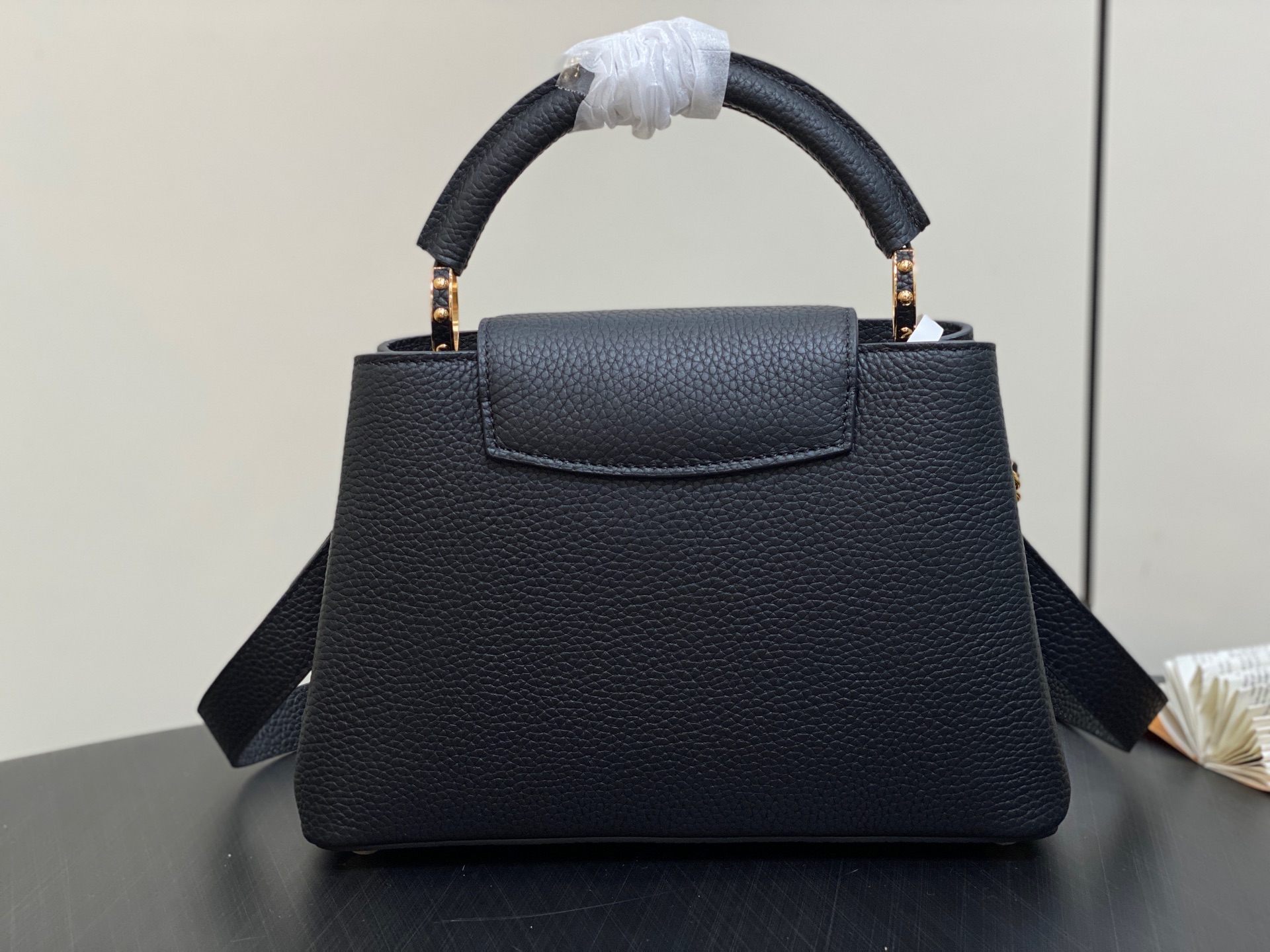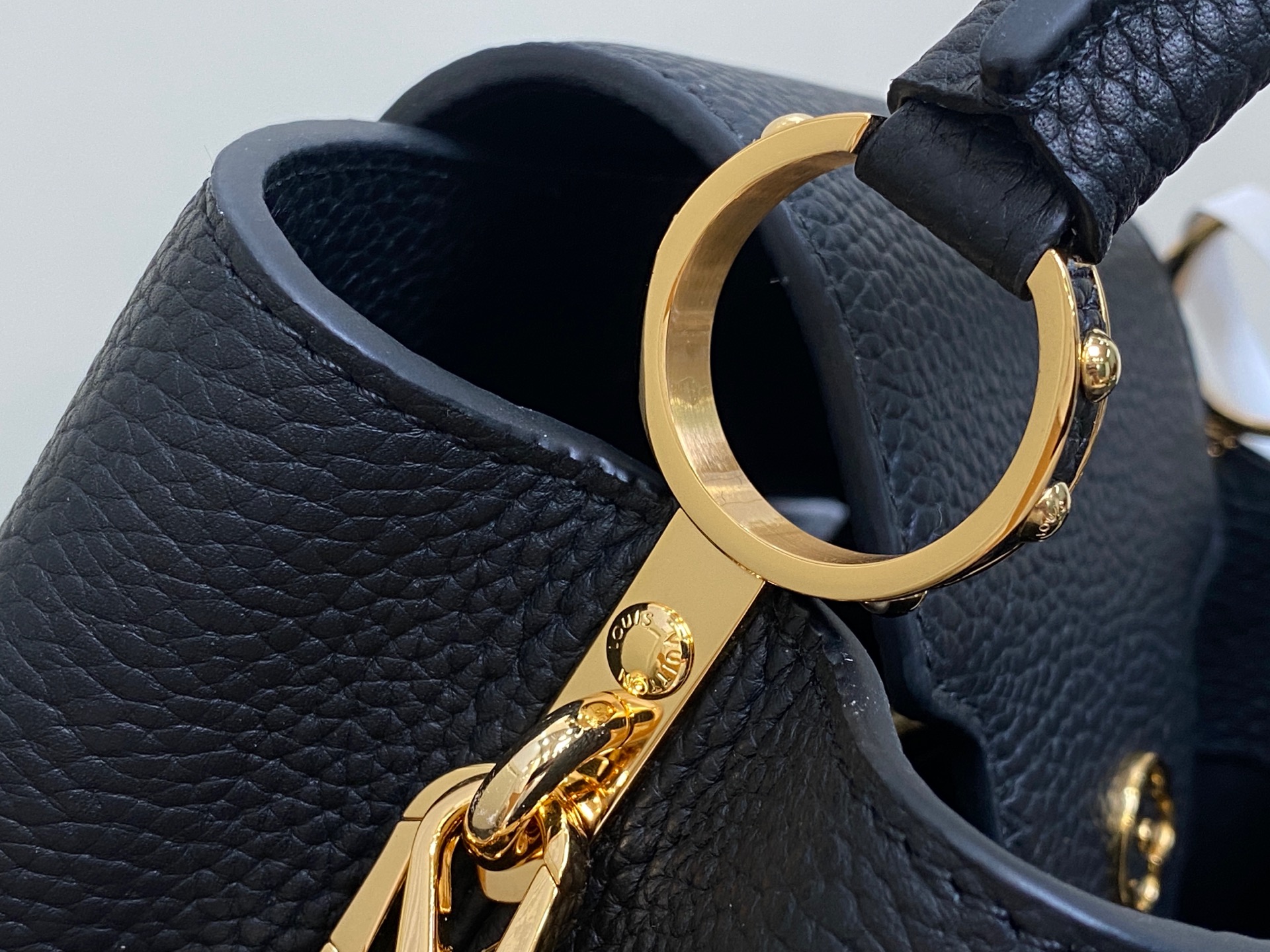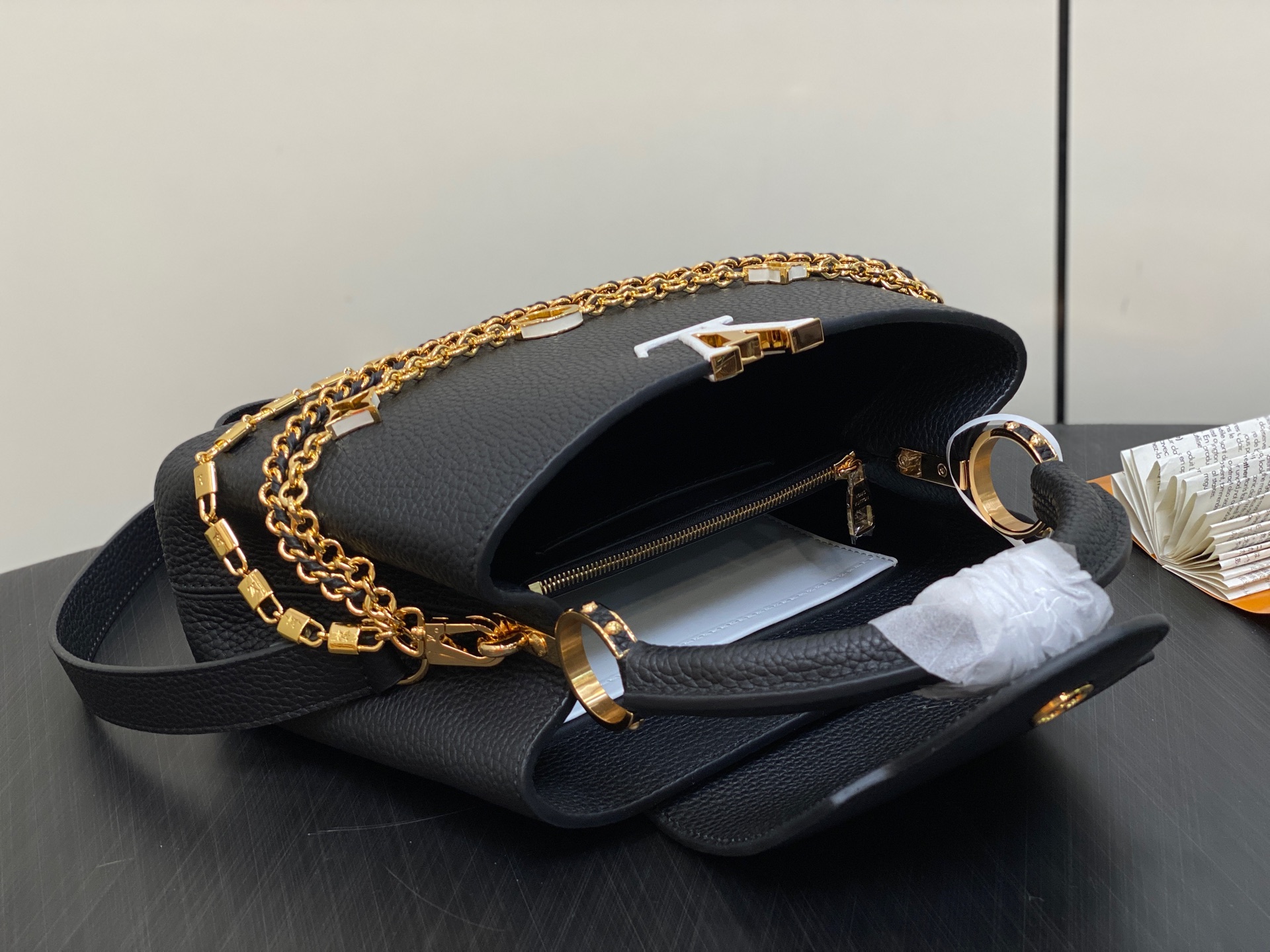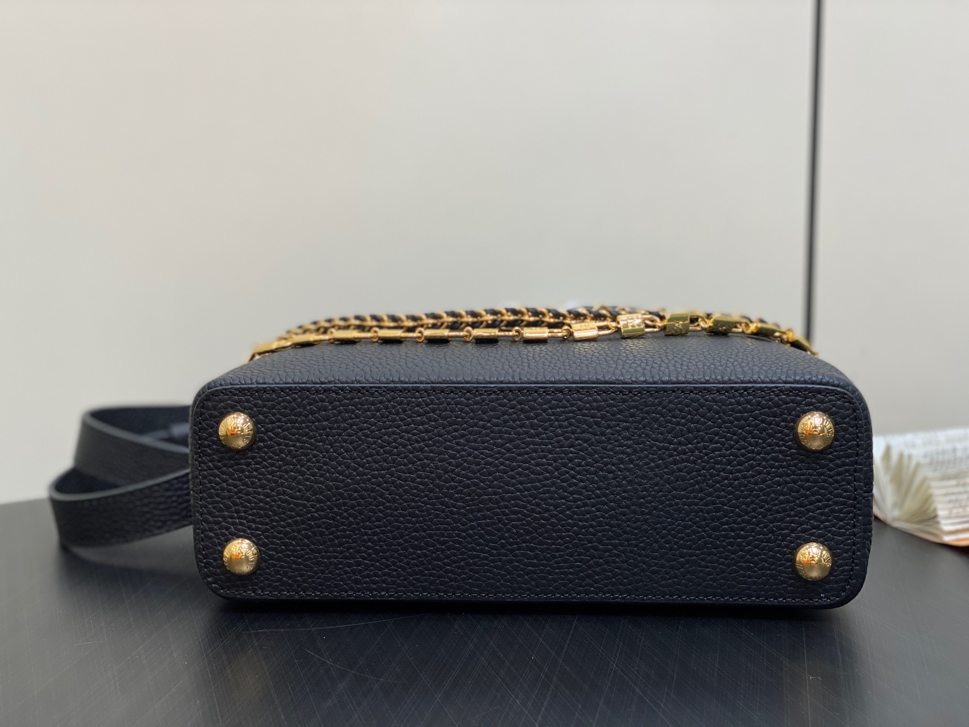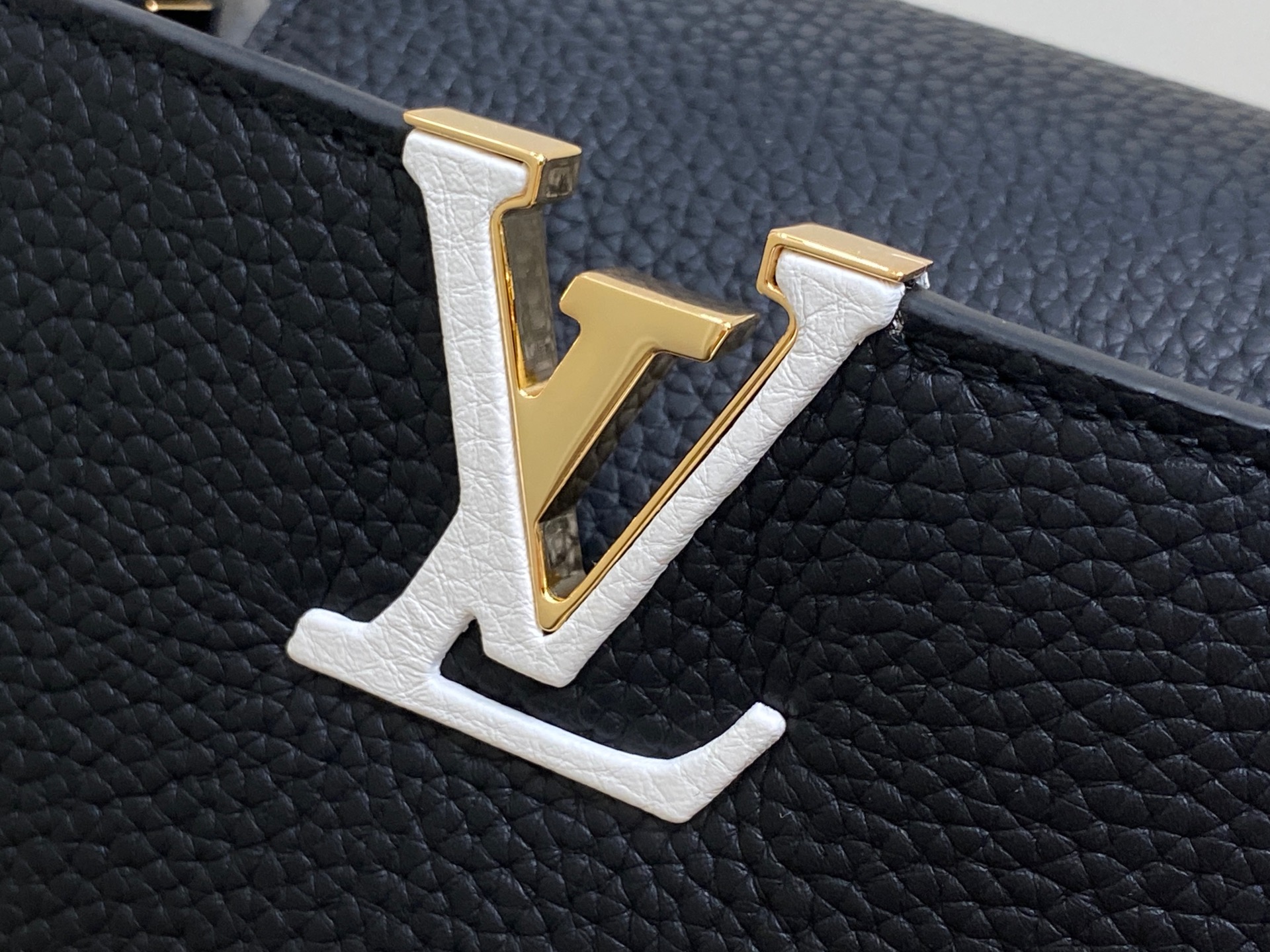 Part of the Trilogy line, this Capucines BB is the epitome of sophistication with its triple chain adornment. Look closely to notice the jewel-like chain details, including signature mini padlocks and enameled Monogram flowers. This double-carry style is crafted from iconic Taurillon leather and is accented with gold-toned hardware. It is fitted with multiple interior pockets and can be worn several ways.