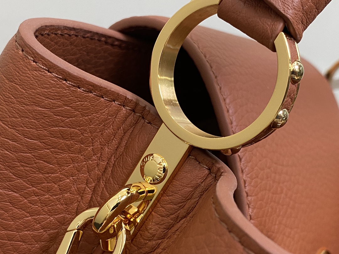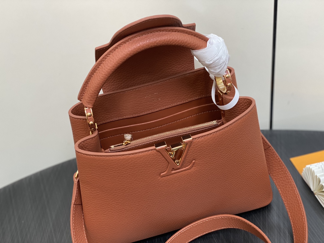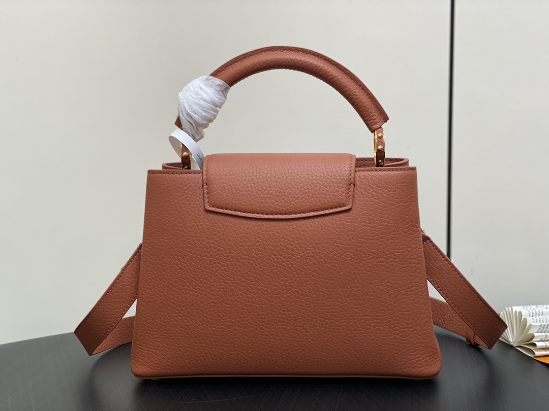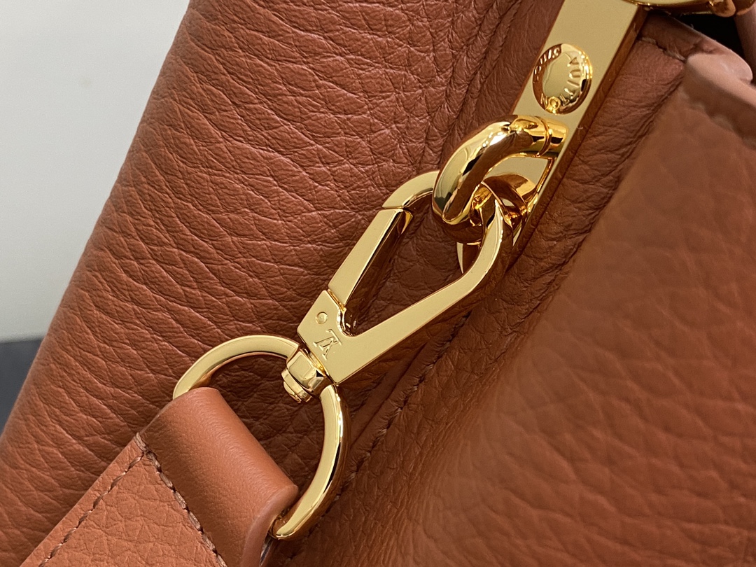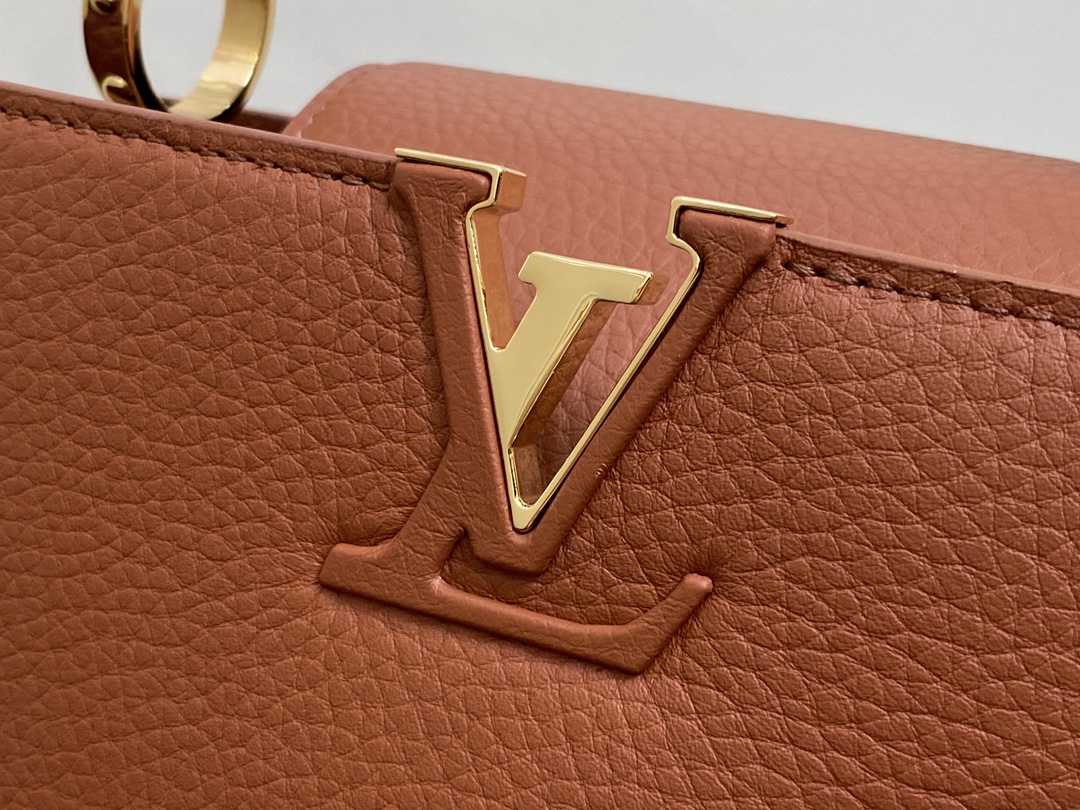 Fashioned from full-grain Taurillon leather, the now-classic Capucines BB handbag displays a host of House signatures: leather-wrapped LV Initials, jewel-like handle mounts inspired by historic trunks, and a distinctive flap with a Monogram Flower motif. Timelessly elegant, this charming model can be carried by hand or worn cross-body on its detachable strap. First launched in 2013, the Capucines is named for the Parisian street where Louis Vuitton first opened shop, in 1854.