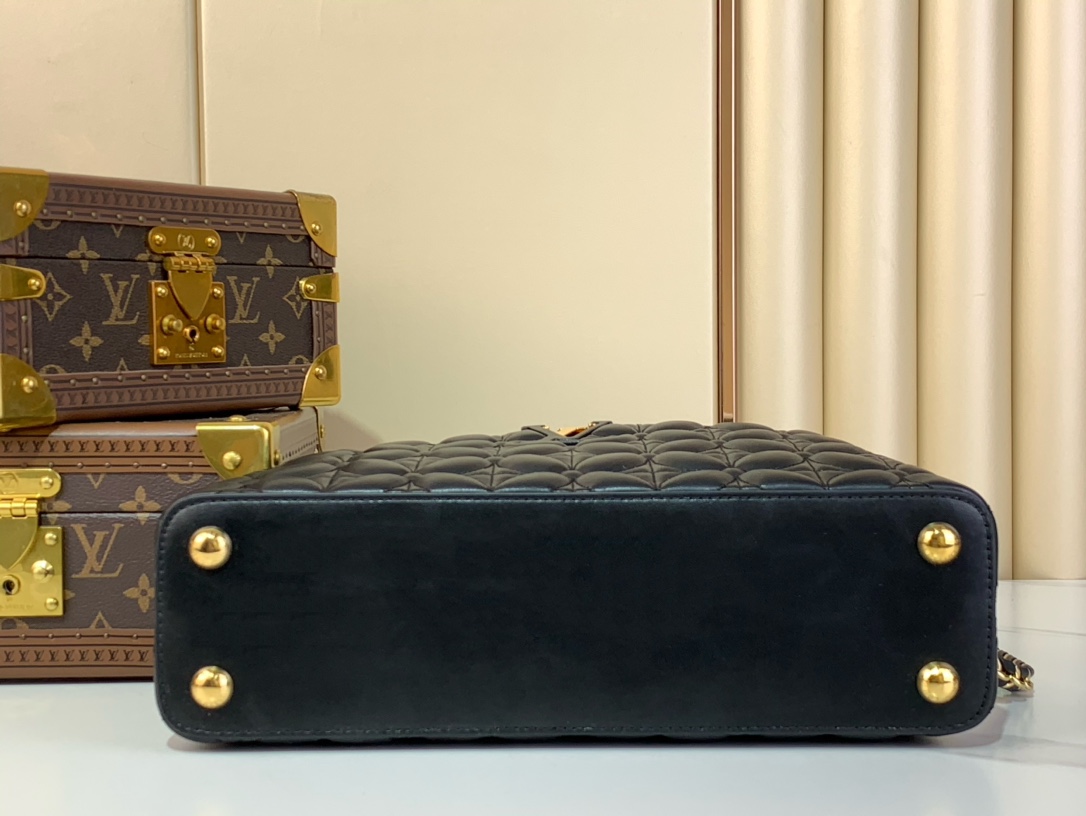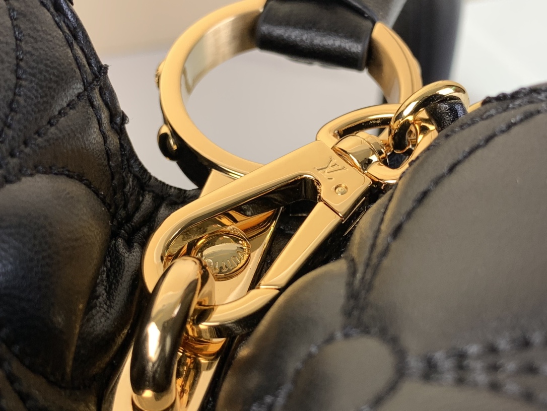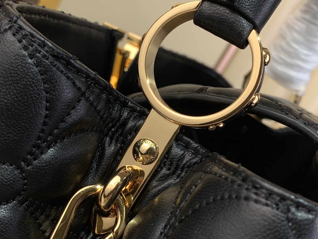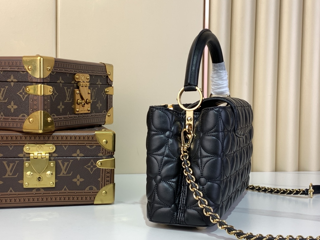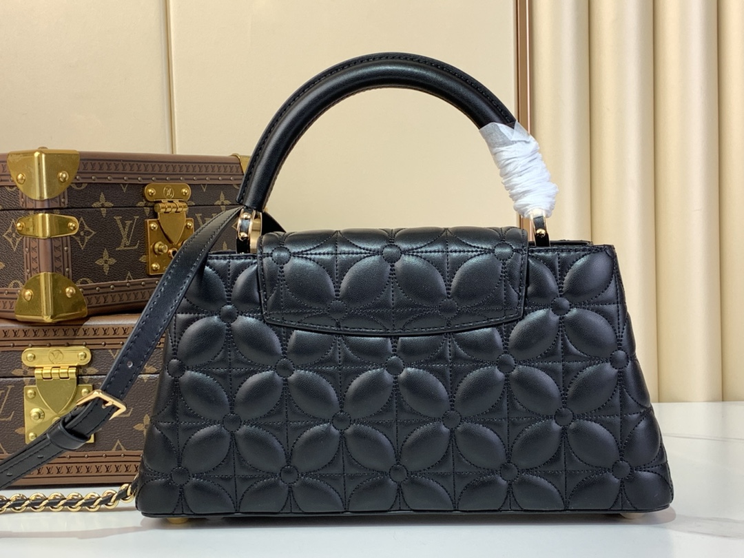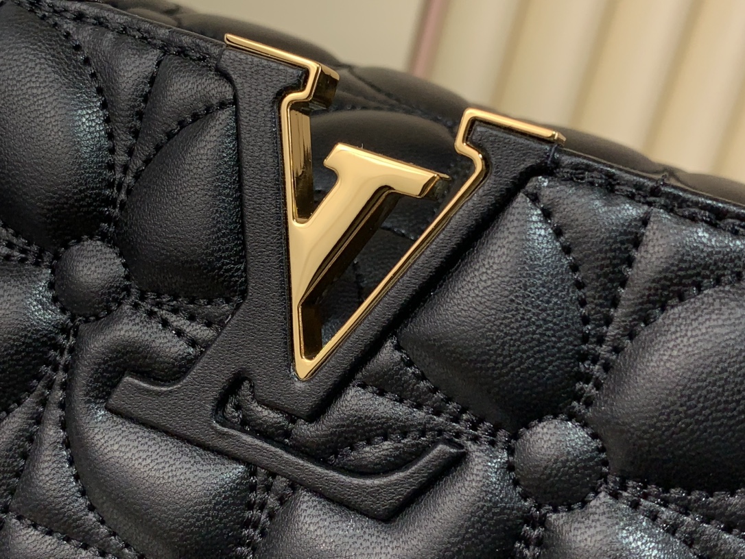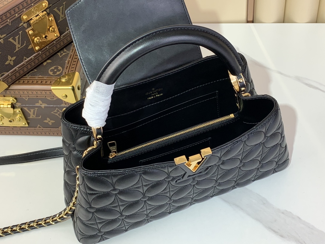 The Capucines East-West MM is reimagined for the season in a graphic but feminine animation It is crafted from lambskin leather accented with a quilted bloom effect that pays tribute to the signature Monogram Flower motif.