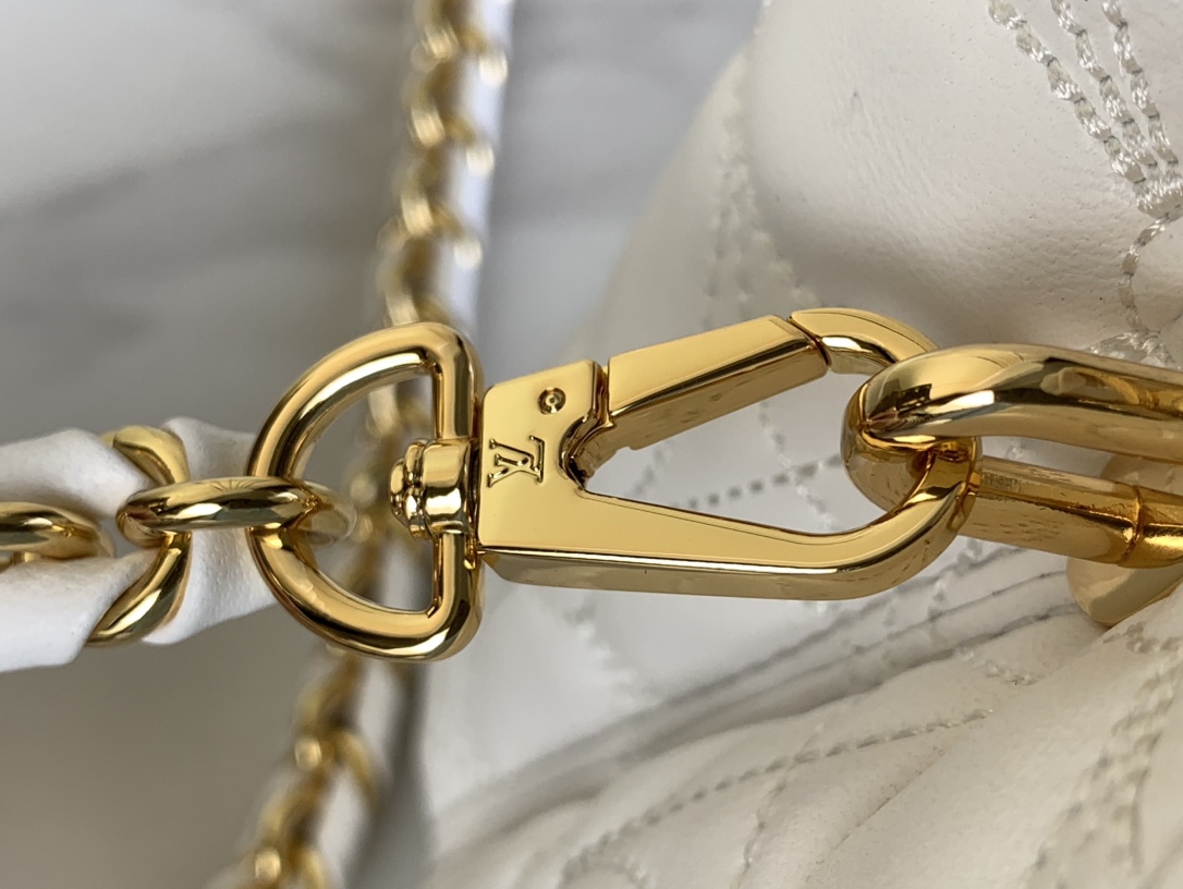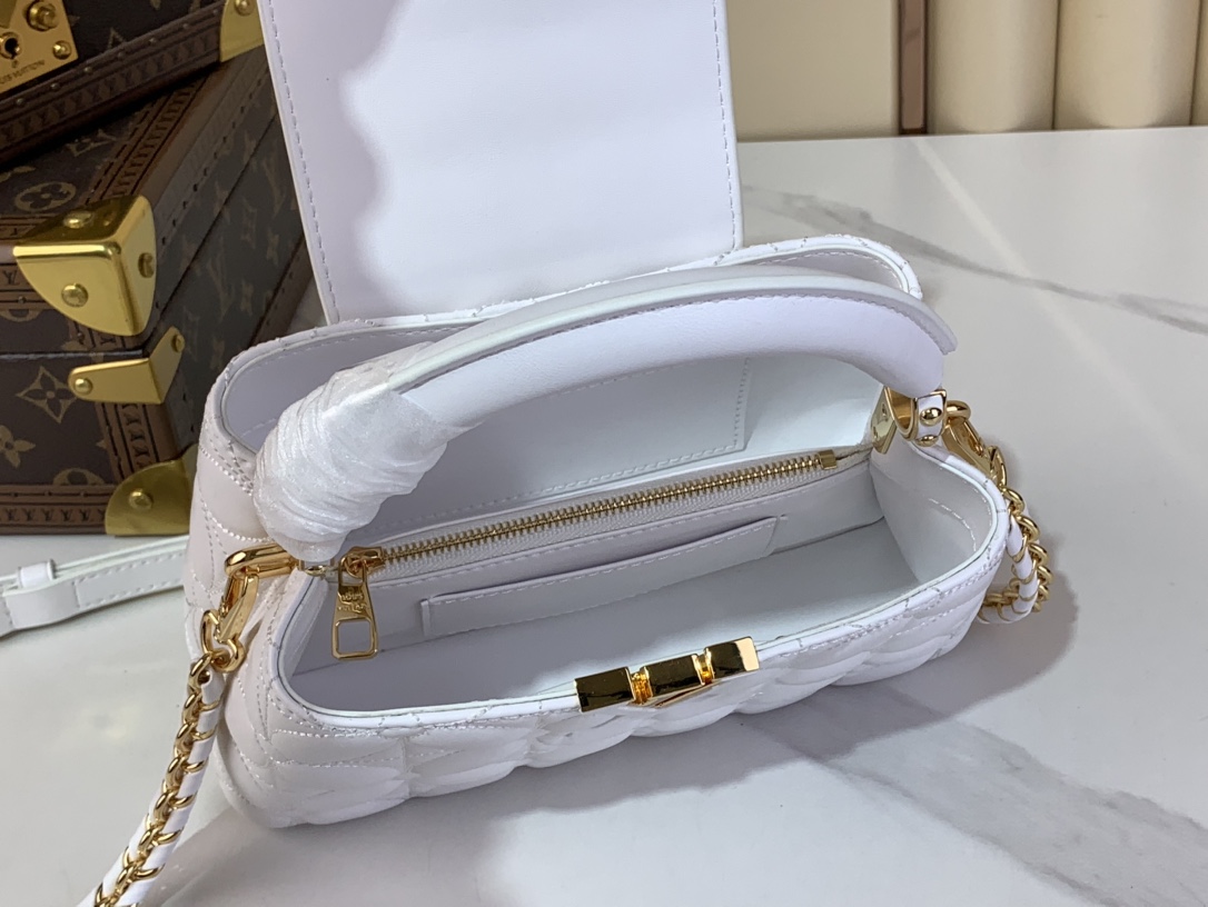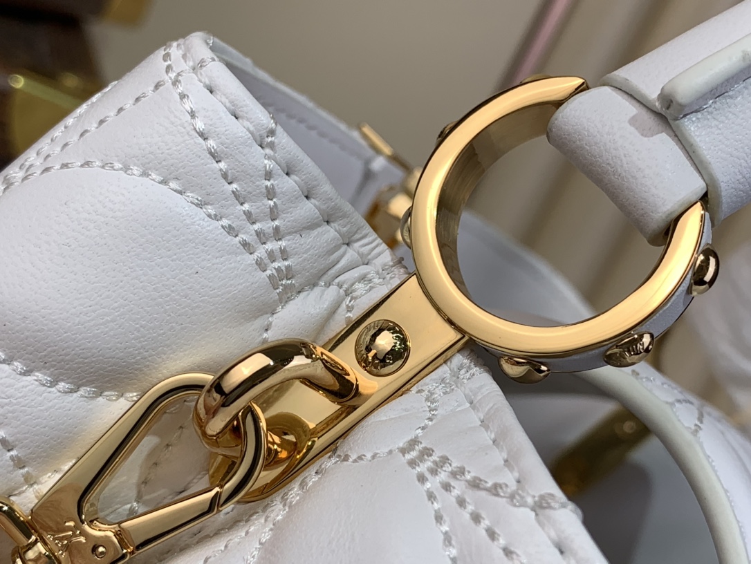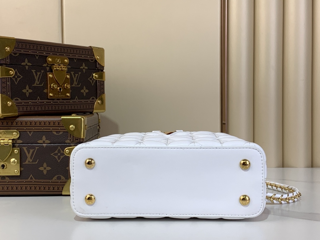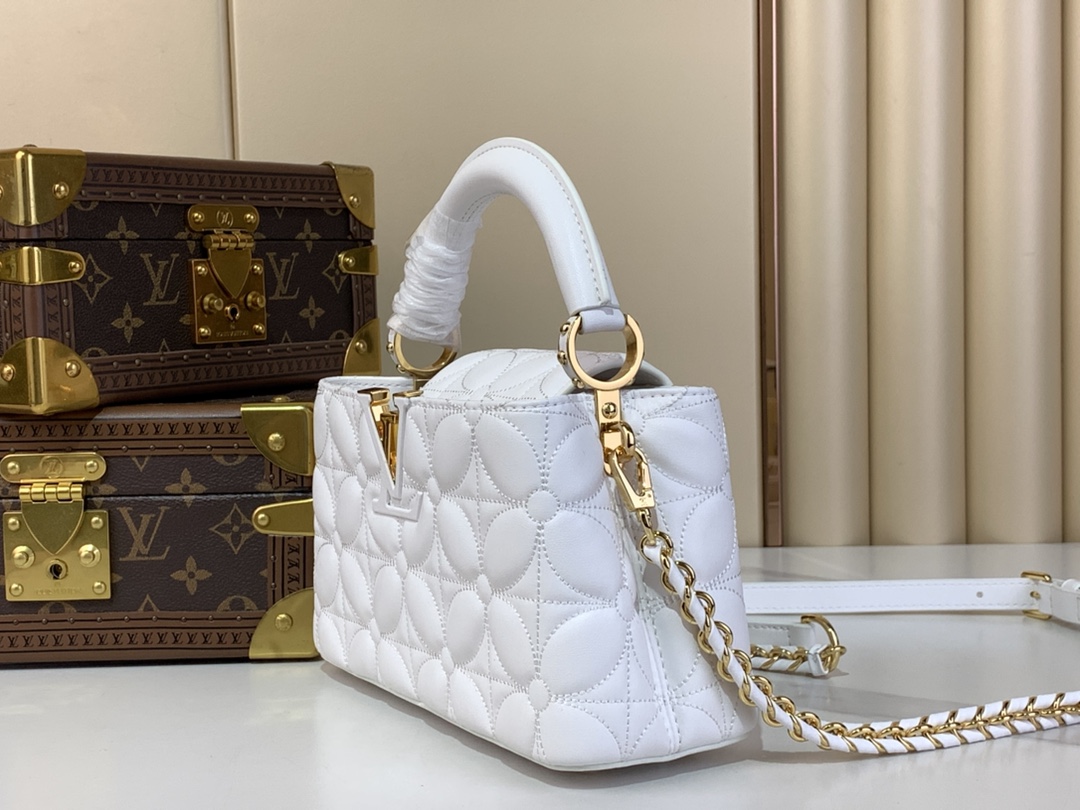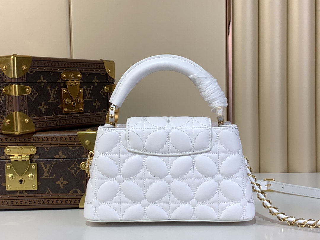 The Capucines East-West Mini is reimagined for the season with a quilted bloom effect, paying homage to the signature Monogram Flowers motif. It is crafted from lambskin leather accented with gleaming gold-toned hardware, including LV initials and a removable braided strap. The versatile design can be carried with the flap inside or out.