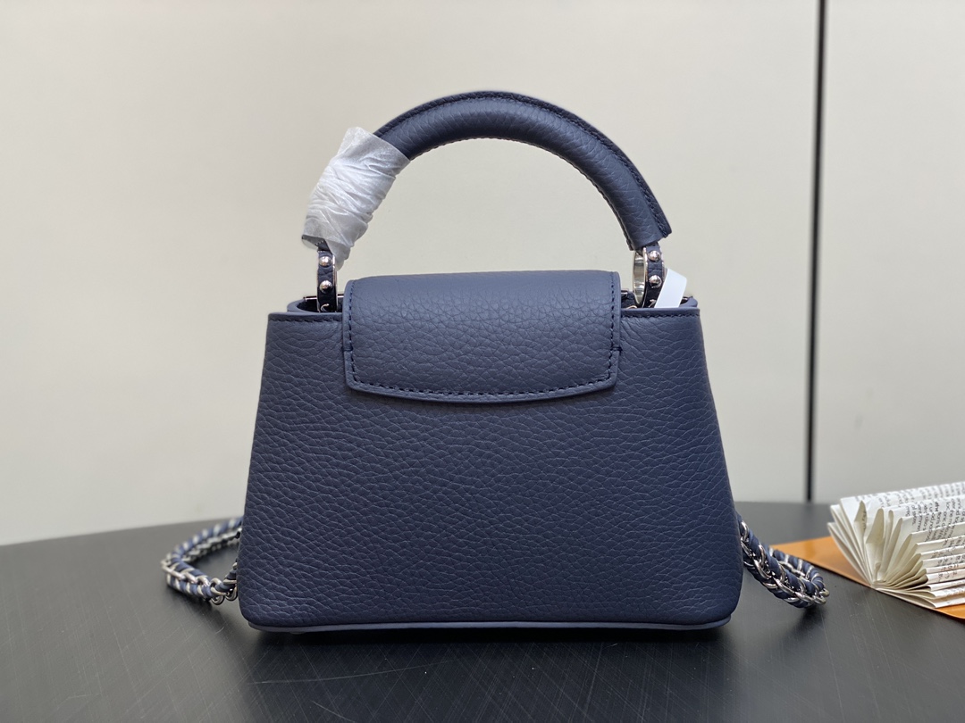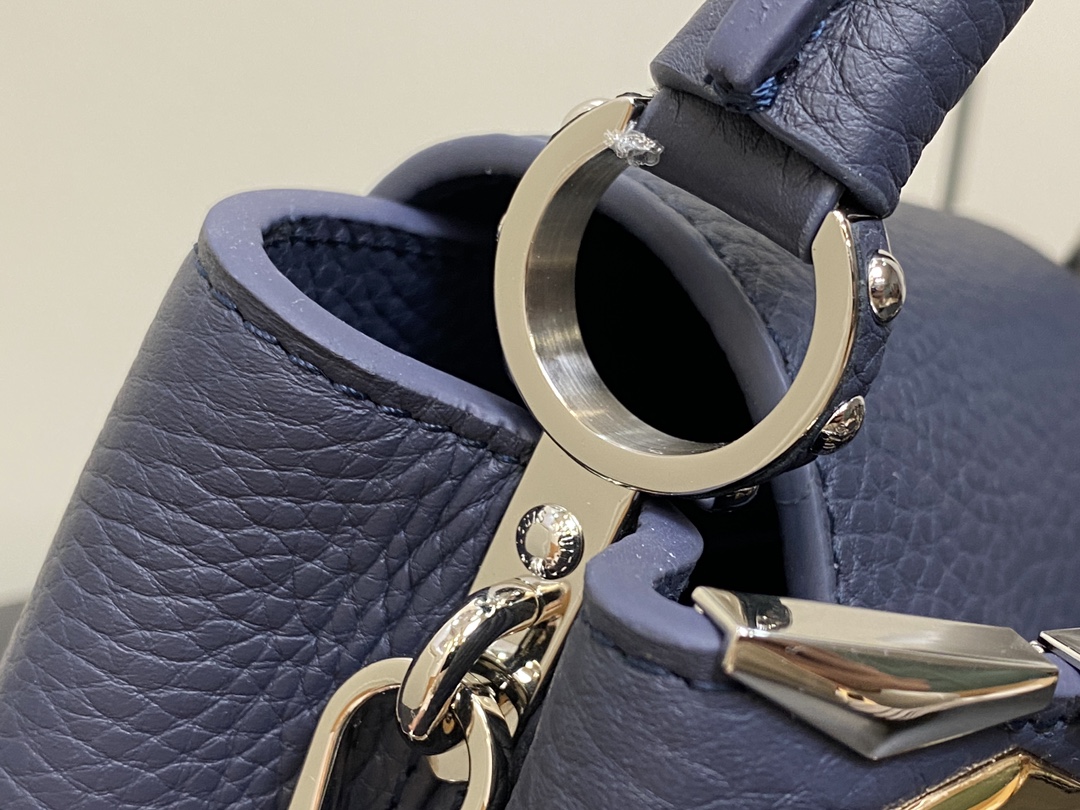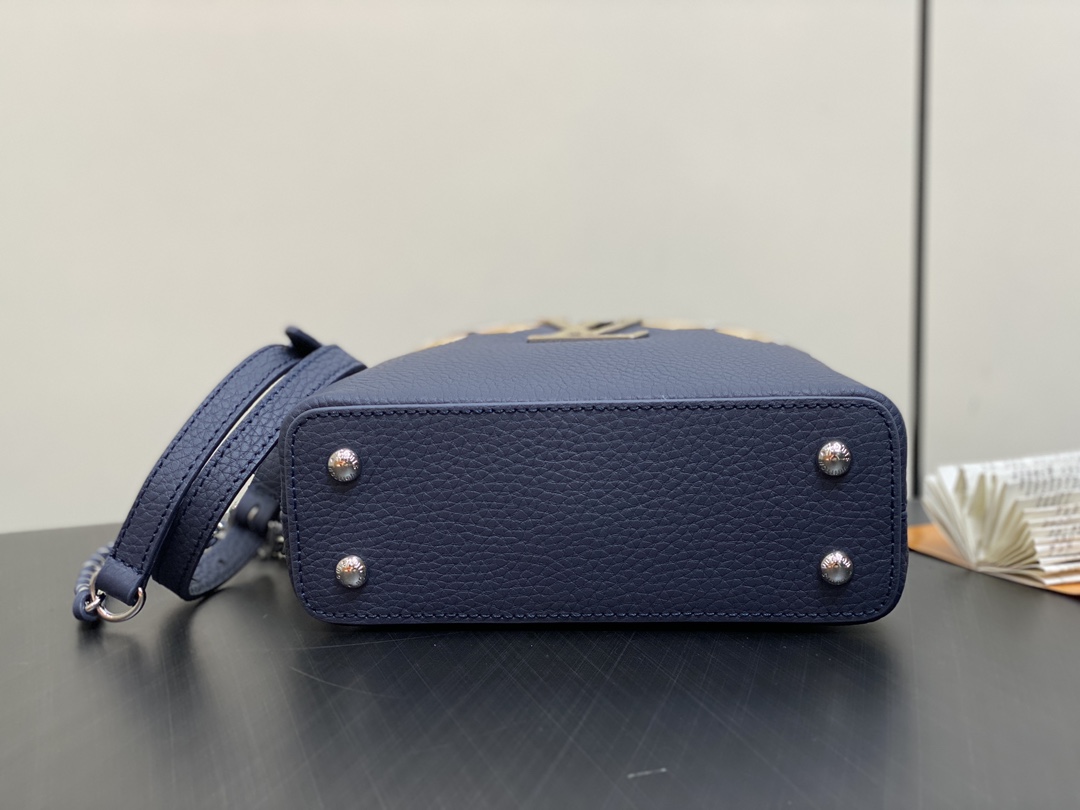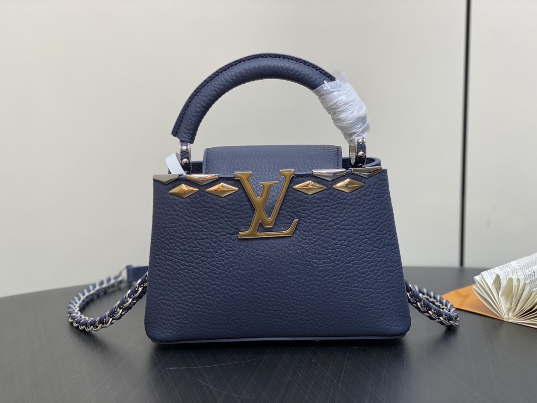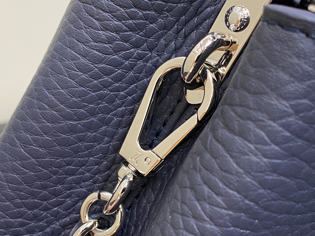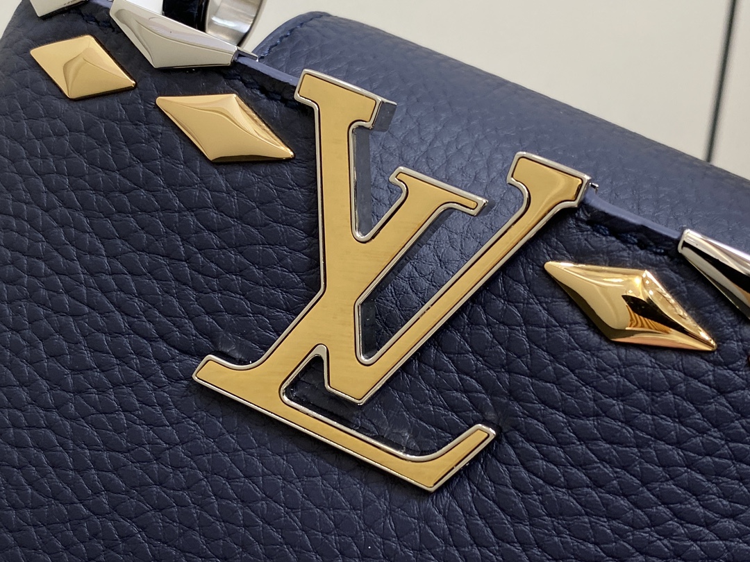 This seasonal iteration of the Capucines Mini reveals a new Malletage crown signature with striking diamond-shaped embellishments. It is crafted from Taurillon leather, offset with a mix of gold- and silver-toned hardware. The double-carry design can be styled with the flap tucked inside or outside, and opens to a compartmented interior with enough space to fit all the essentials.