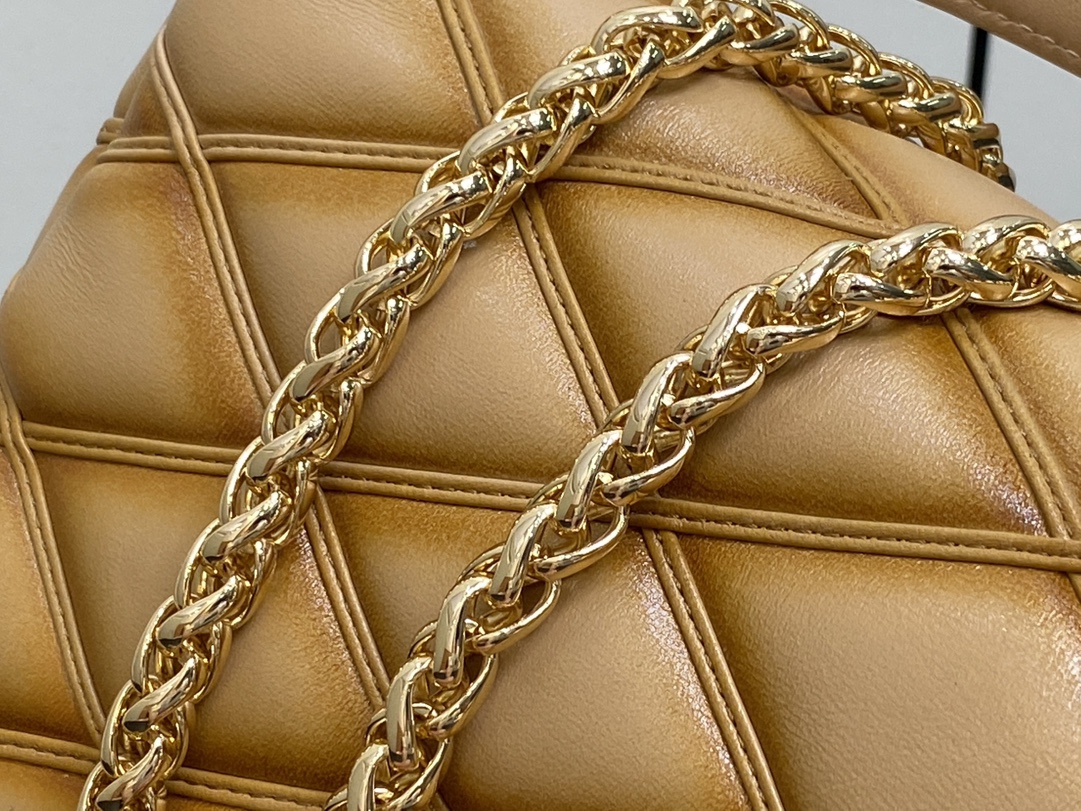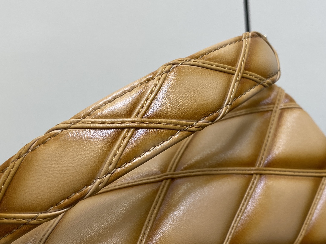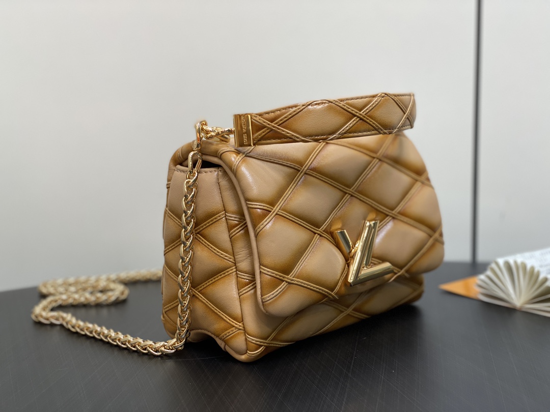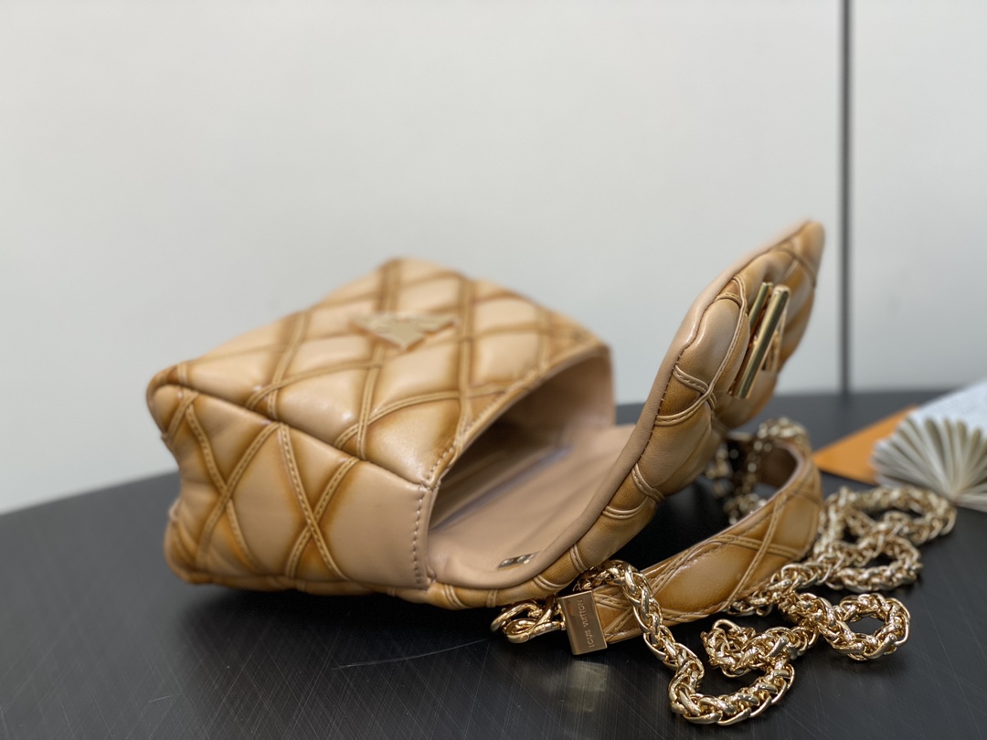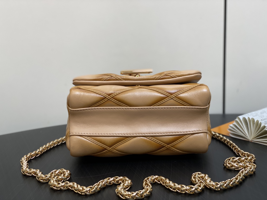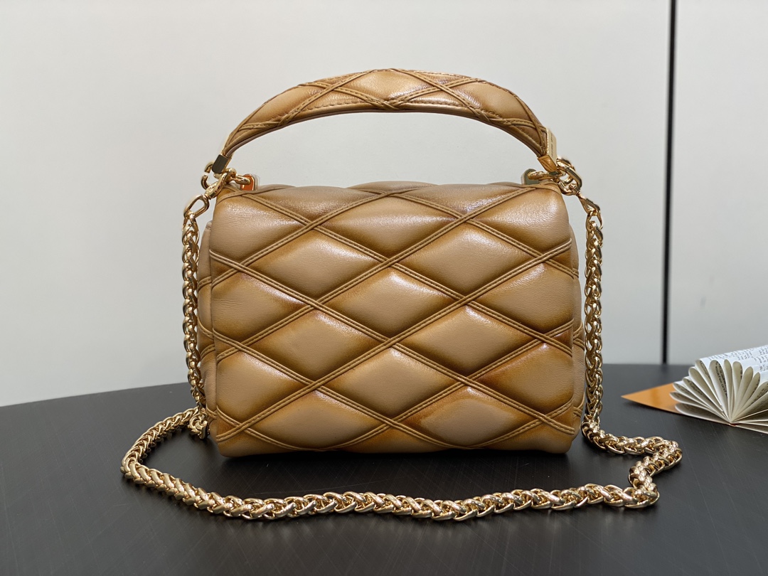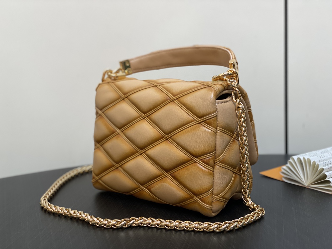 Part of the Fall-Winter 24 collection, this new compact edition of the GO-14 PM is set to become a day-to-night icon. Crafted from supple lambskin, it is adorned with the House's refined signature Malletage quilting and has less padding and a thinner chain compared to other GO-14 styles. The roomy interior is fitted with a flat pocket and mirror for makeup touch-ups.