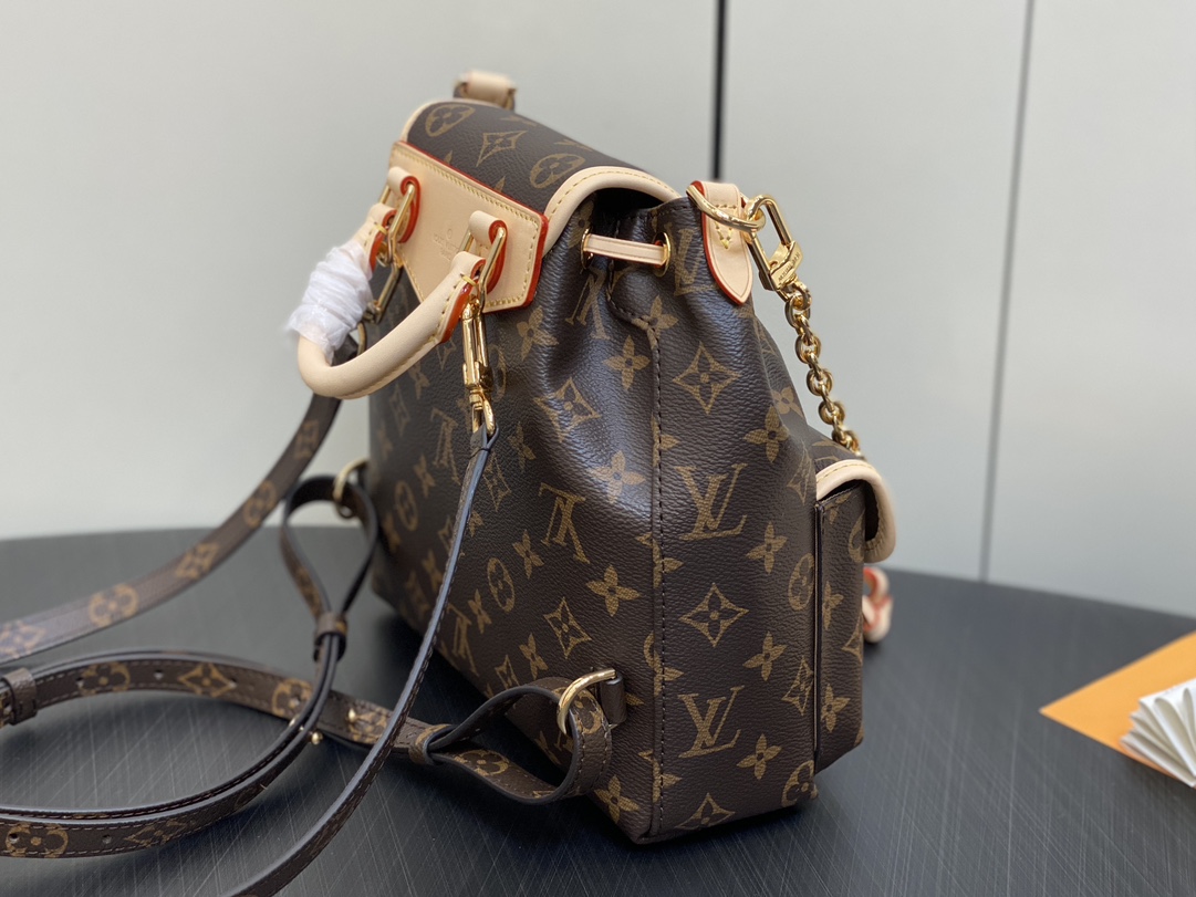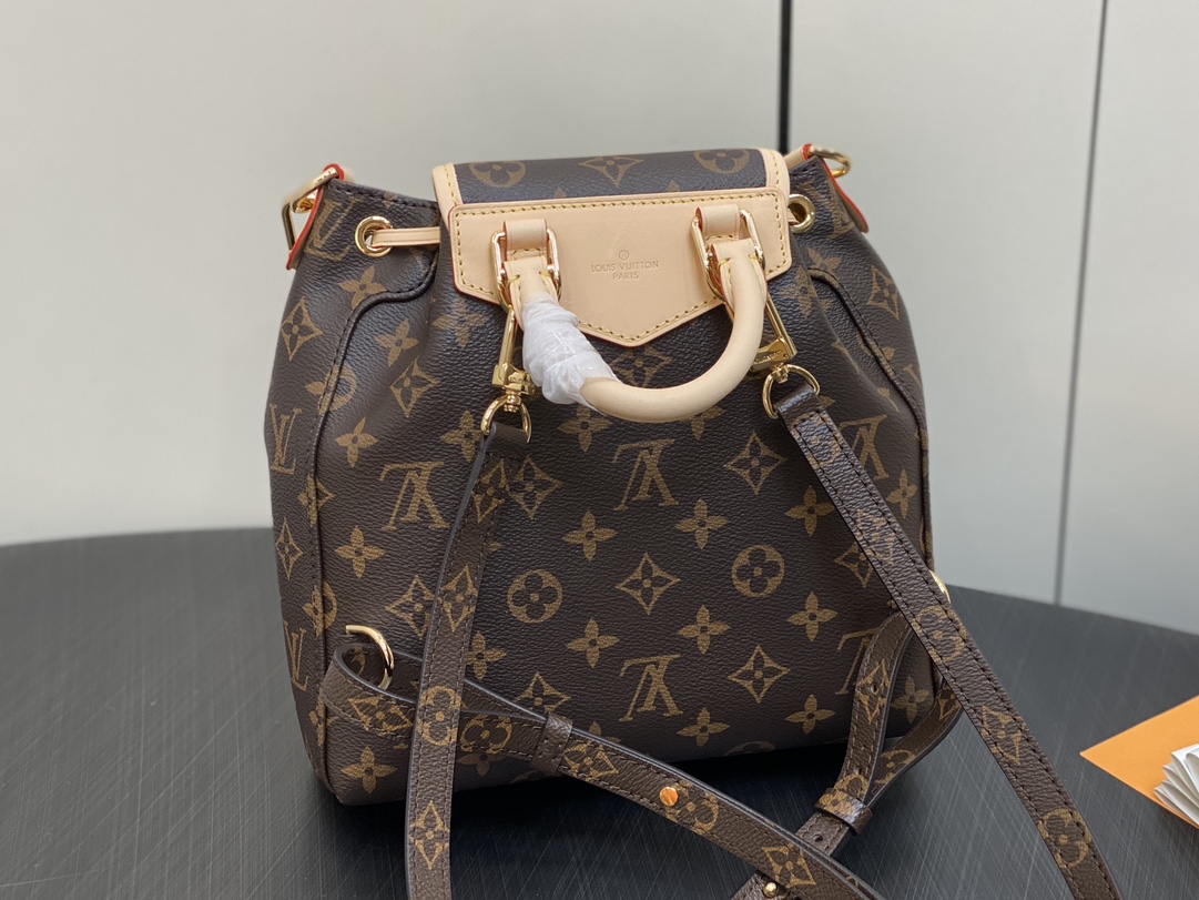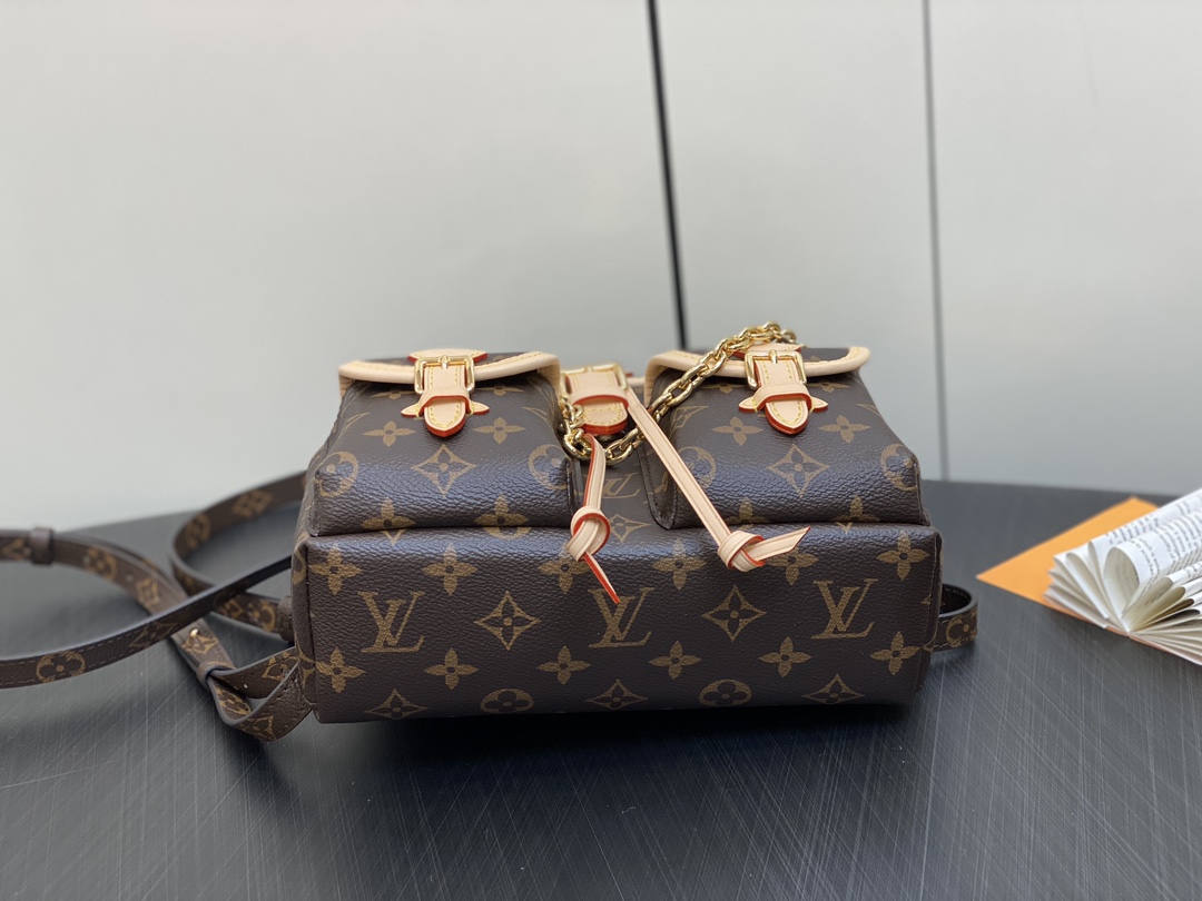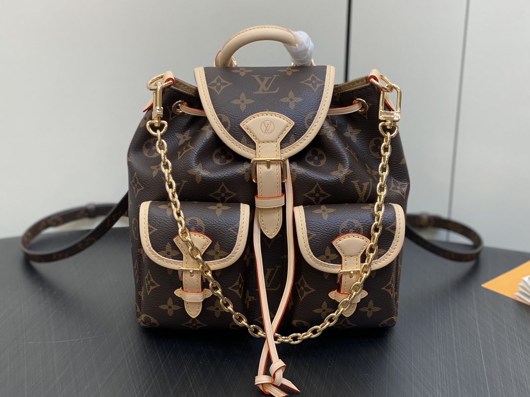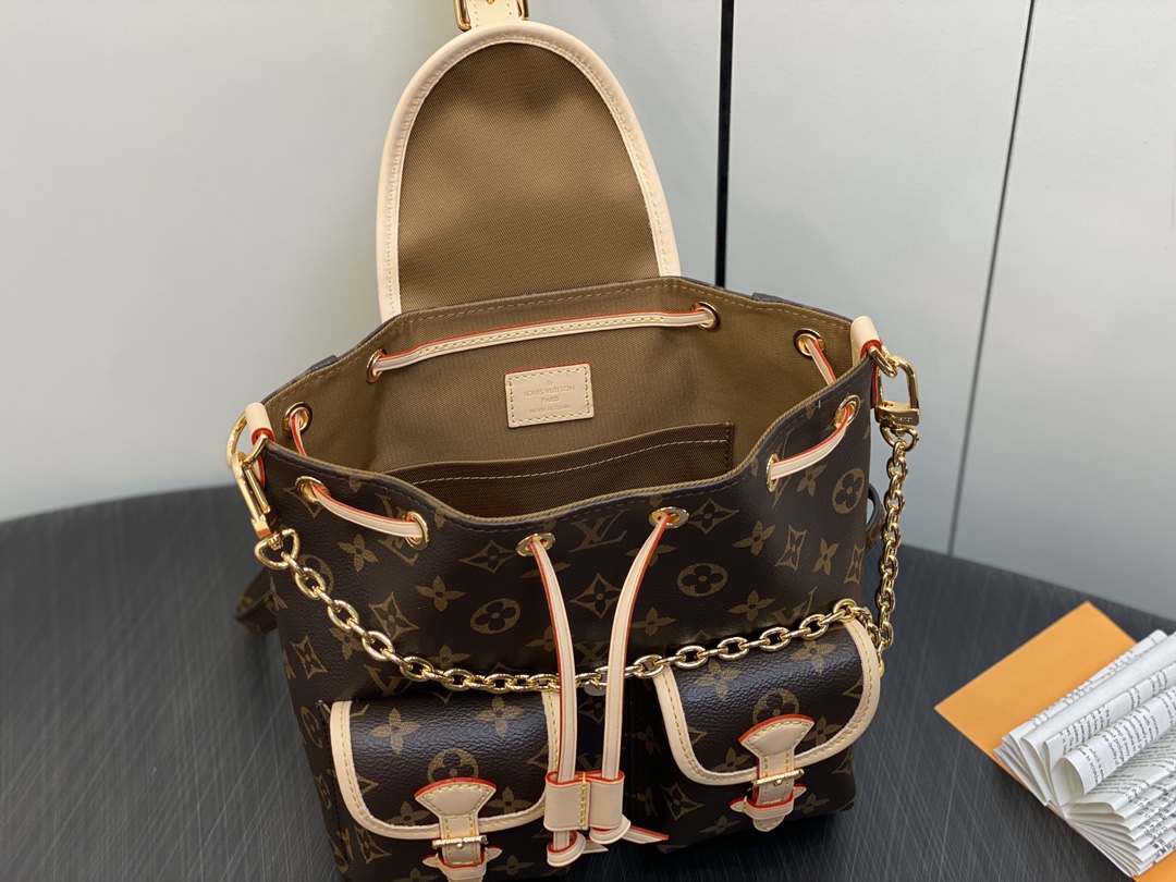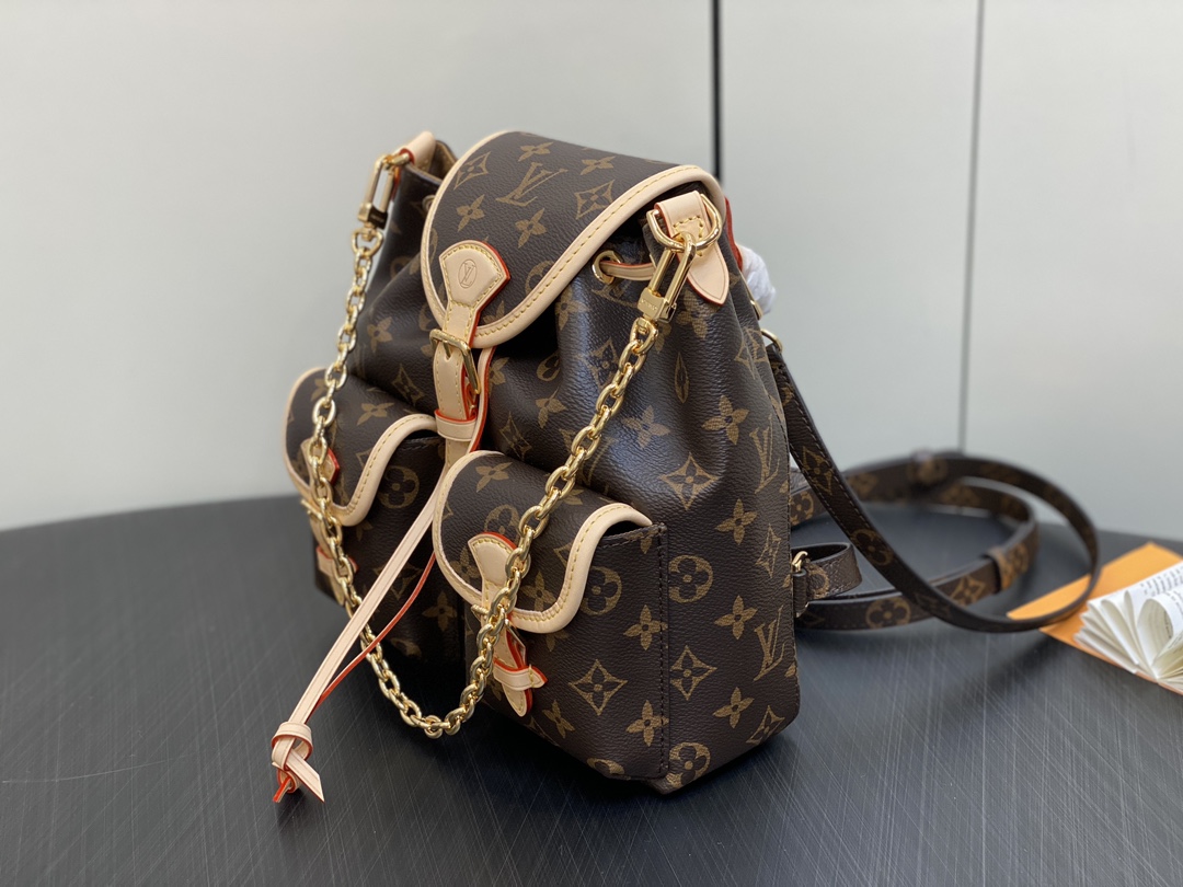 Made from Monogram canvas with leather trim, the super-cute, super-functional Excursion PM backpack has a design clearly influenced by the world of hiking. The main compartment closes with an adjustable sliding buckle and there are two pockets with buckles on the front. A gold-color chain, in addition to the top handle, enable different carries.