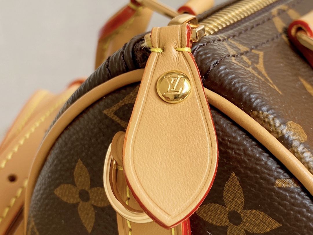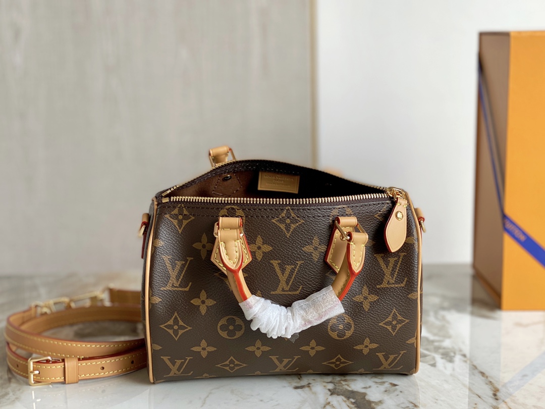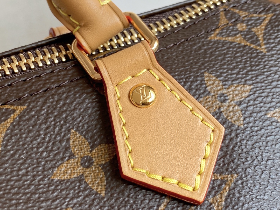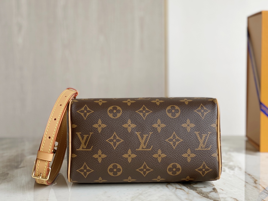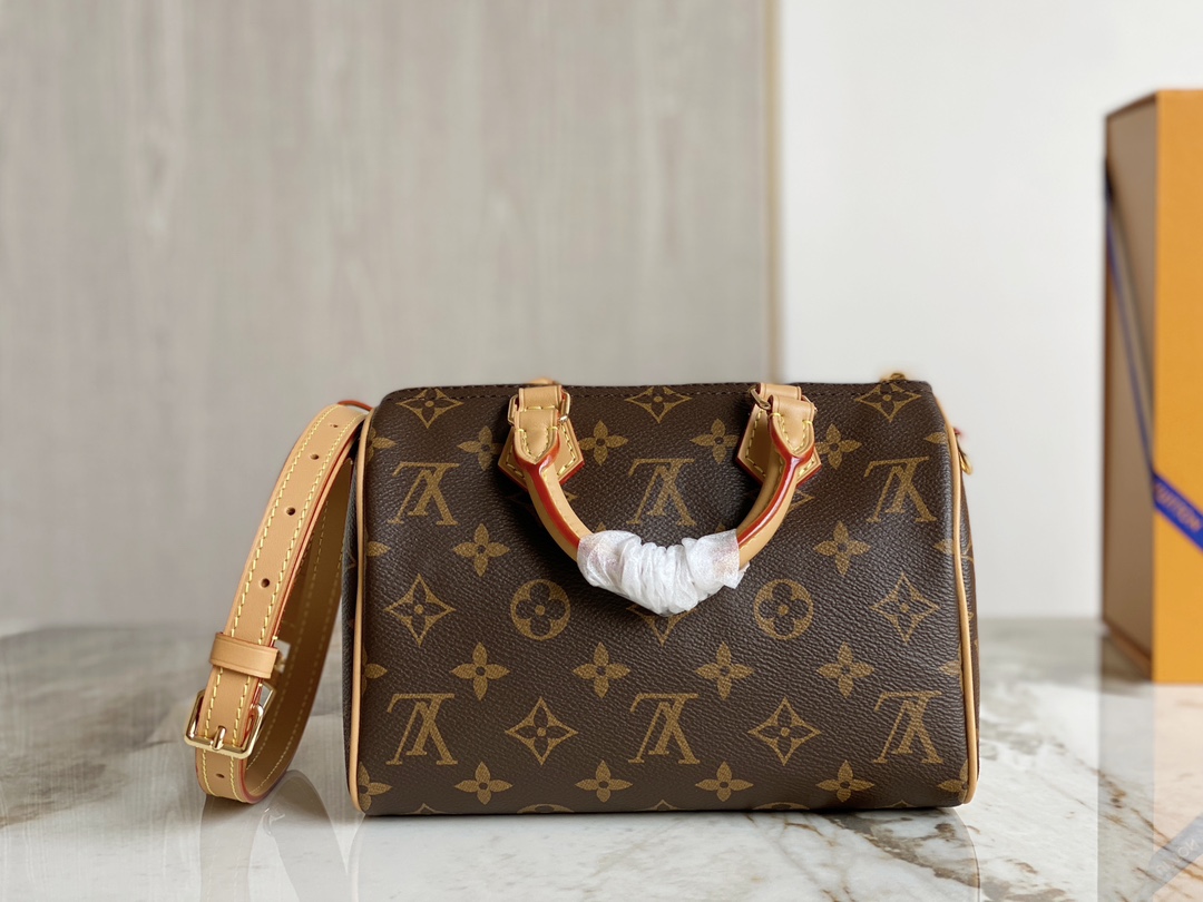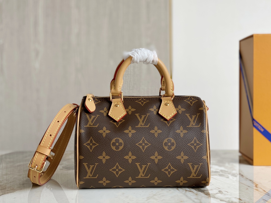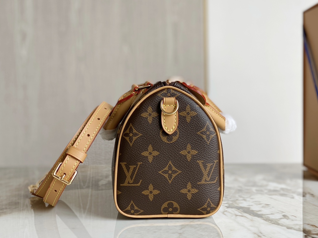 The Nano Speedy revamped in Monogram canvas is the perfect miniature version of Louis Vuitton's iconic Speedy bag, and the ideal way to carry essentials. This beautifully crafted design is complemented by aged natural cowhide leather and gold-tone hardware. In addition to its two handles, it has a removable, adjustable shoulder strap for different carry options.