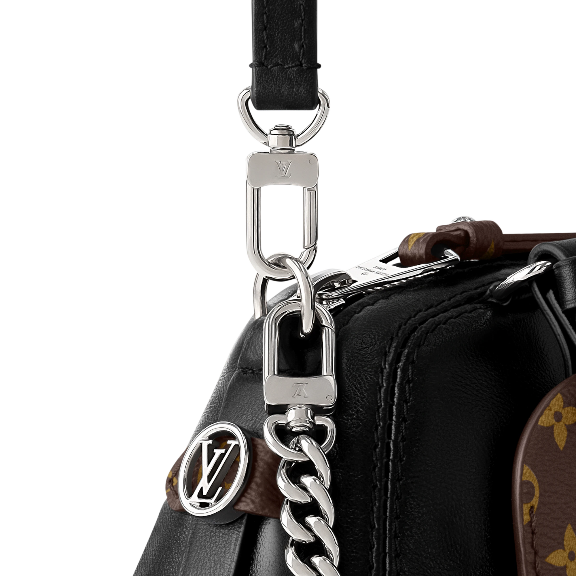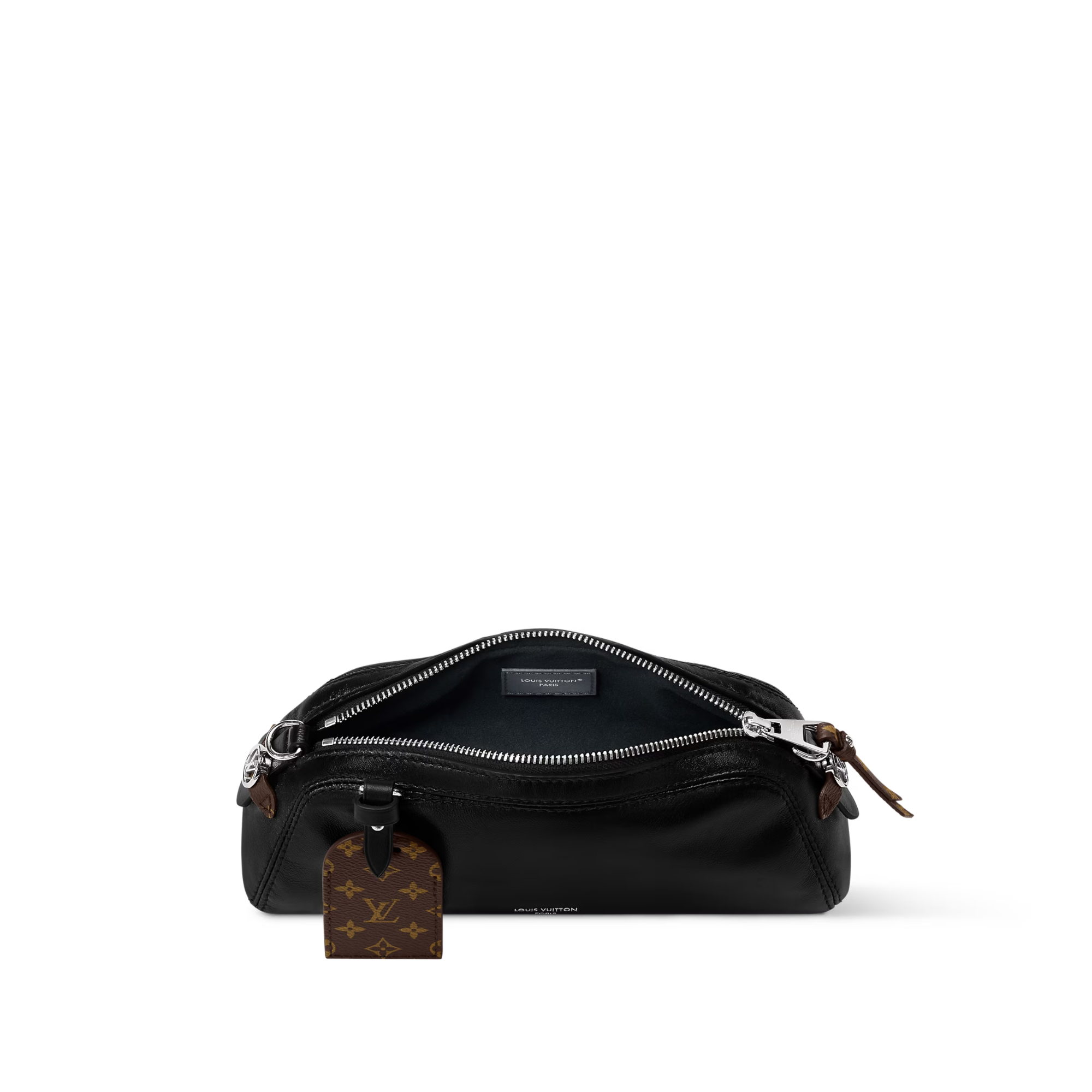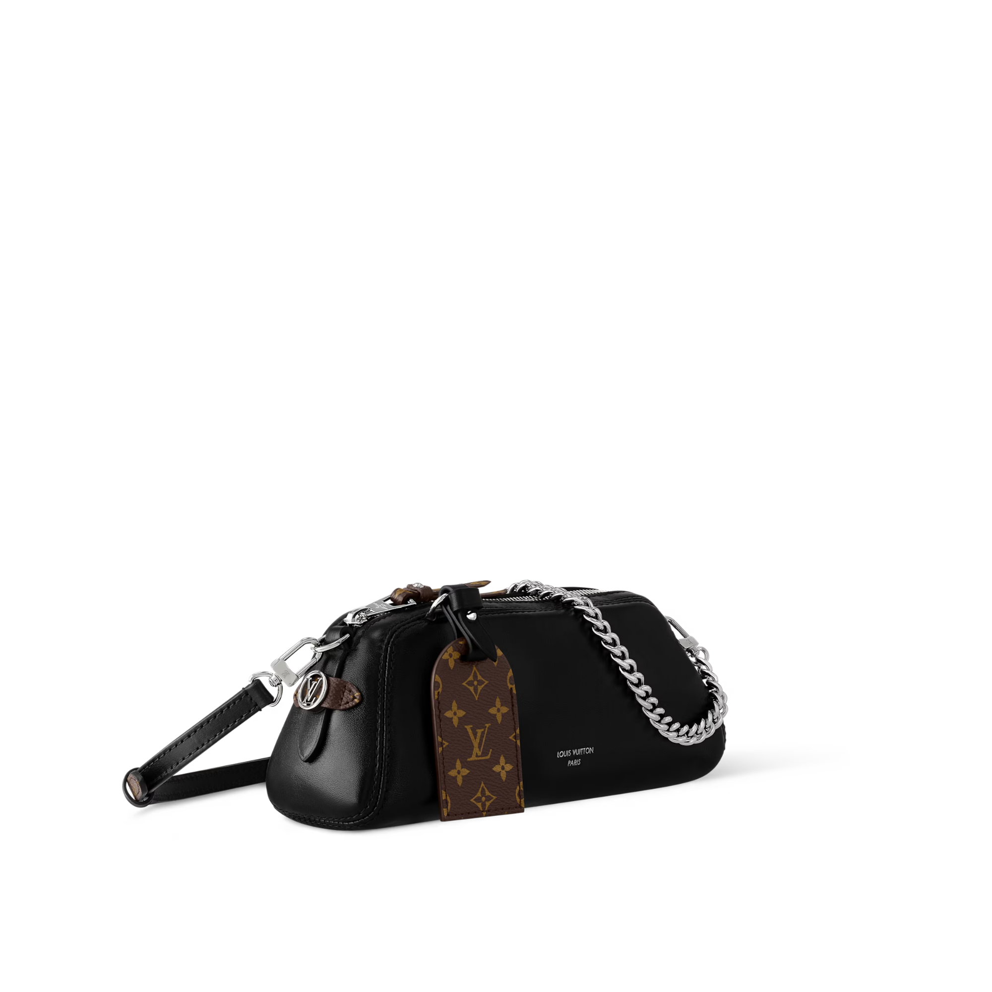 The iconic LV Vibe line introduces this pochette edition, designed as the perfect day-to-evening handbag. Crafted from supple lambskin with a glossy finish, it is adorned with a bold silver-toned chain and signature Monogram details – note the contrasting address tag and LV Circle. The reversible strap is a reinterpretation of the original Carryall LV Vibe, offering versatile styling options.