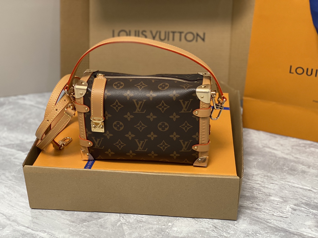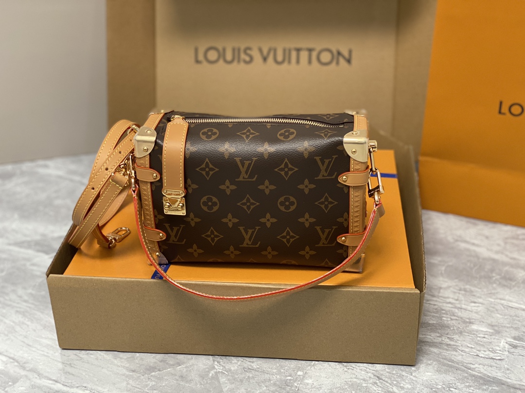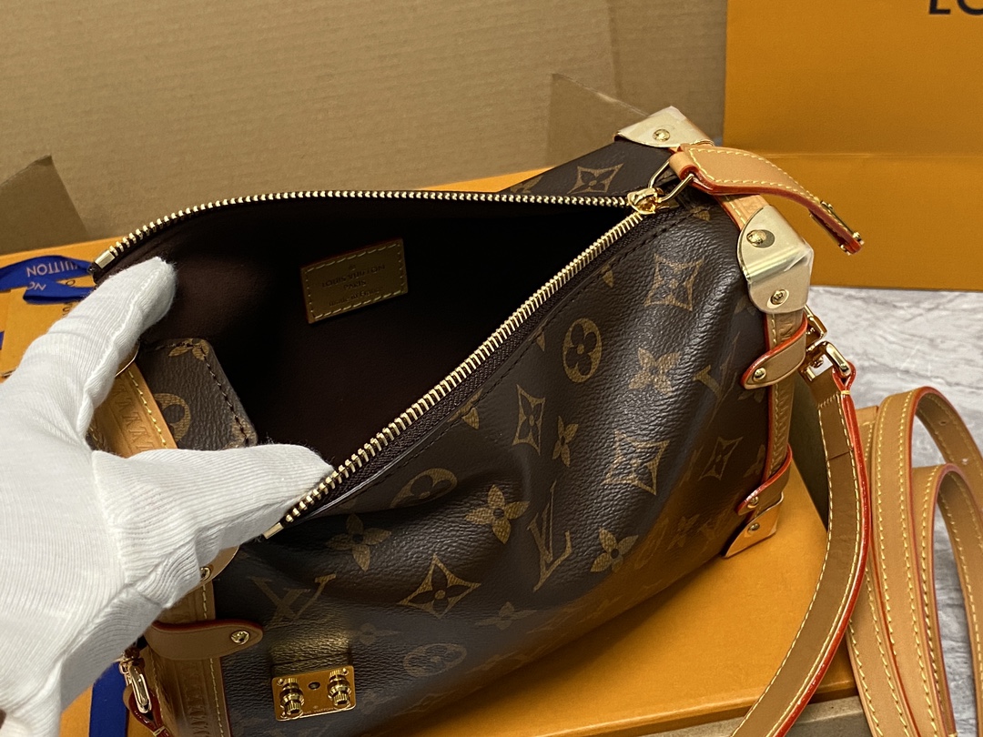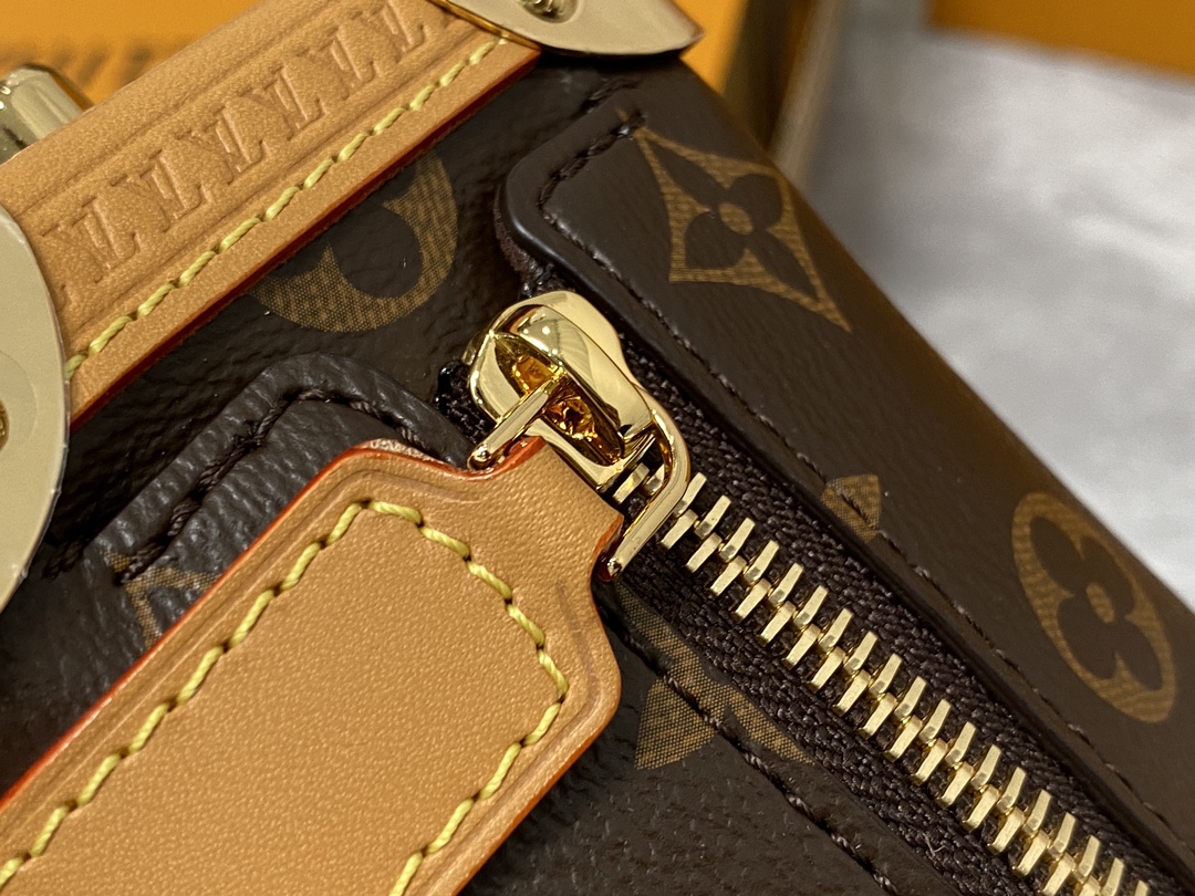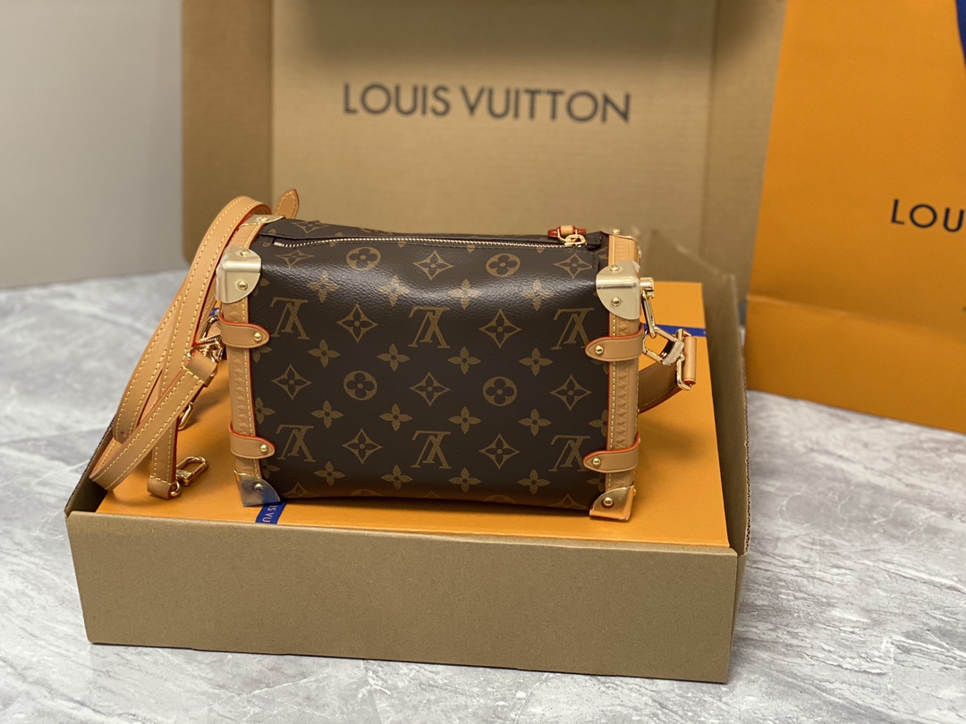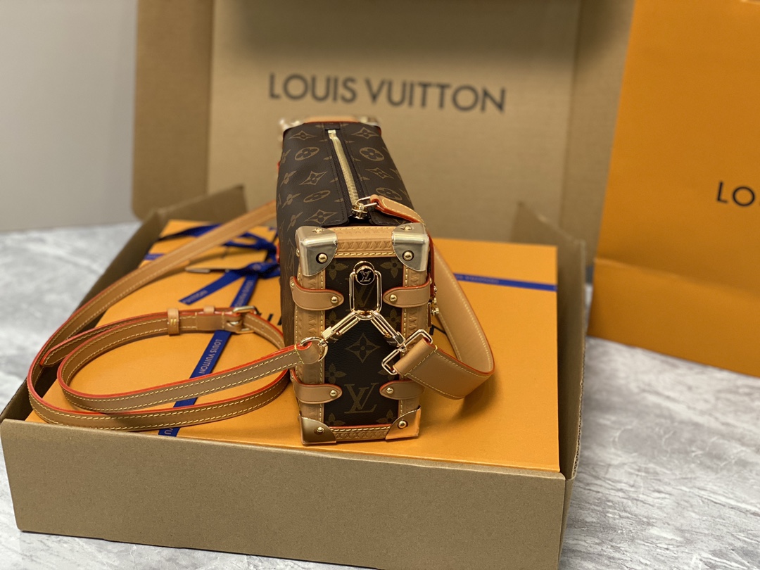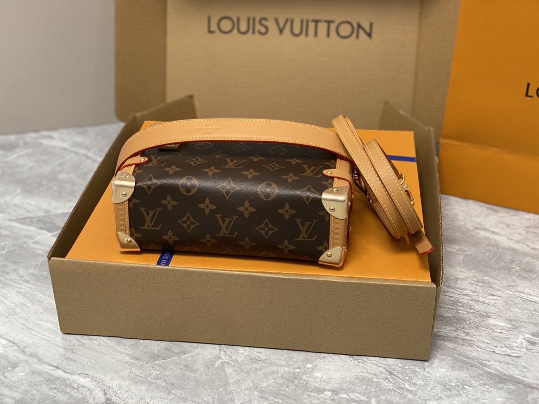 Returning to the House’s trunkmaking beginnings, Nicolas Ghesquière creates the Side Trunk MM bag in Monogram canvas with a leather trim. What strikes the eye is the singularity of the leather zip tab fitted with the iconic S-lock and the reinforced metallic corners. The wide top handle is removable as is the thin leather shoulder strap.