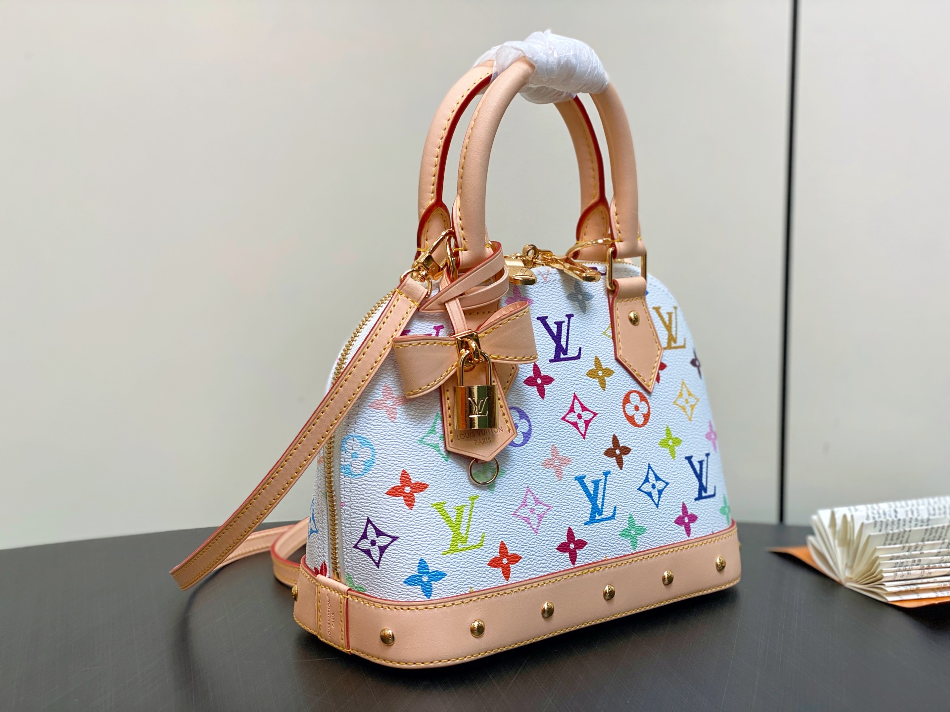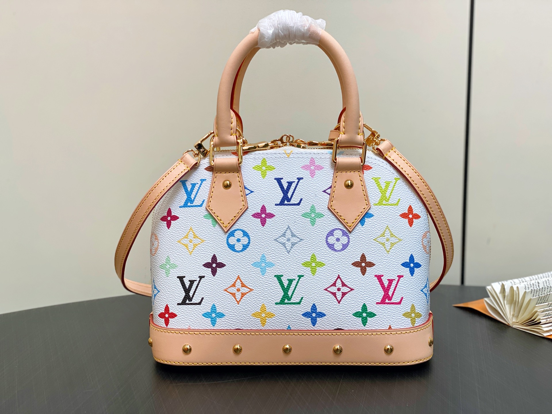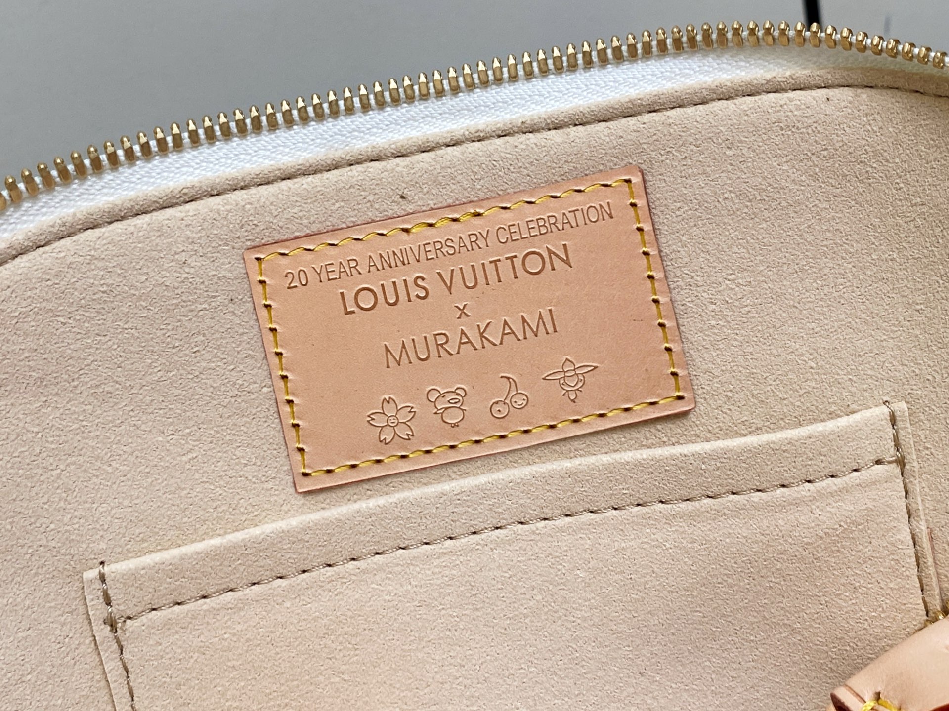 Originally inspired by a 1930s Art Deco design, this edition of the Alma BB has a celebratory spirit in the Louis Vuitton x Murakami collection’s multicolored Monogram coated canvas, which draws on the Japanese artist’s playful palette. The House’s natural cowhide leather adds an emblematic touch to the refined Toron top handles, the bottom, the removable strap, and the exclusive LV x TM keybell.