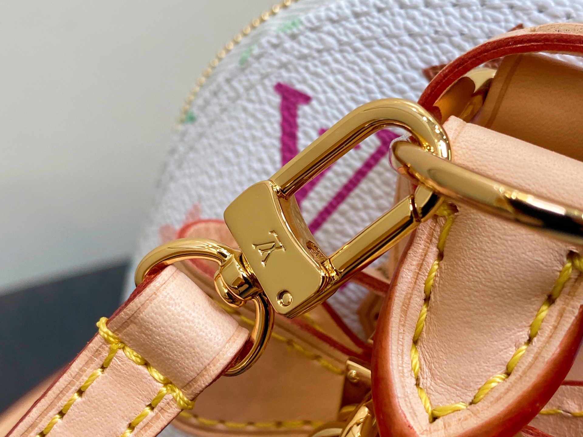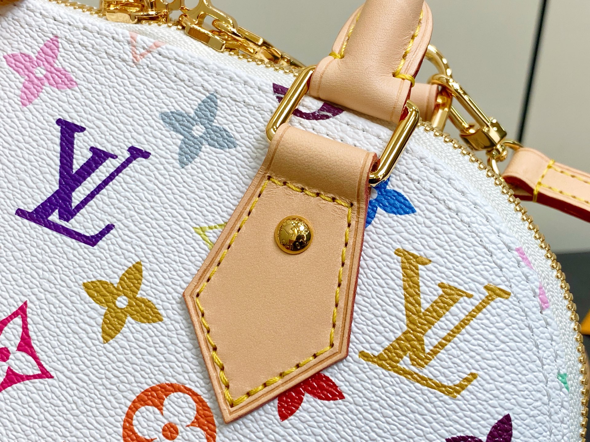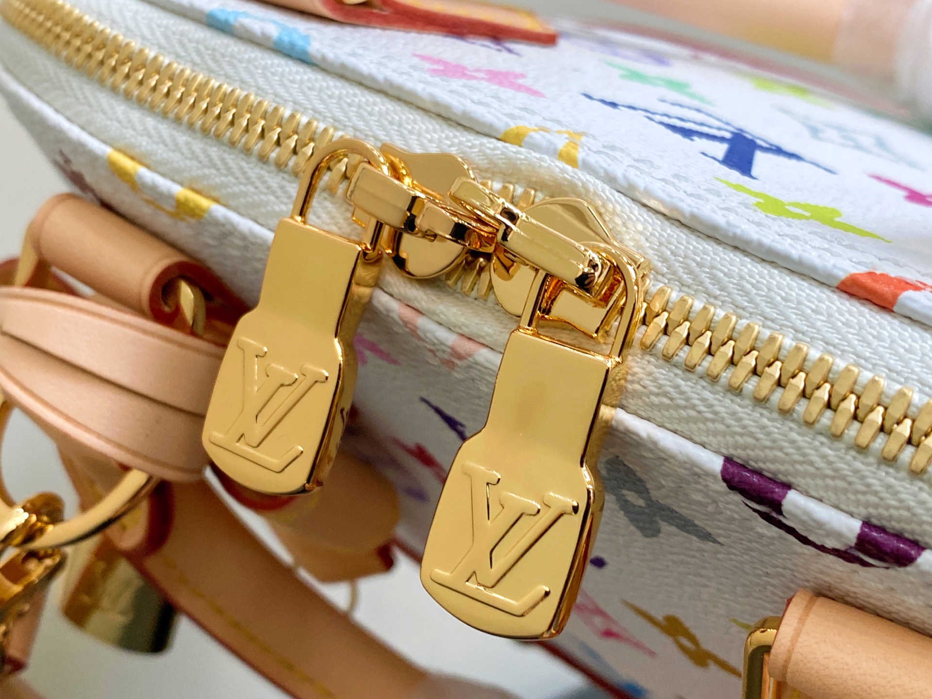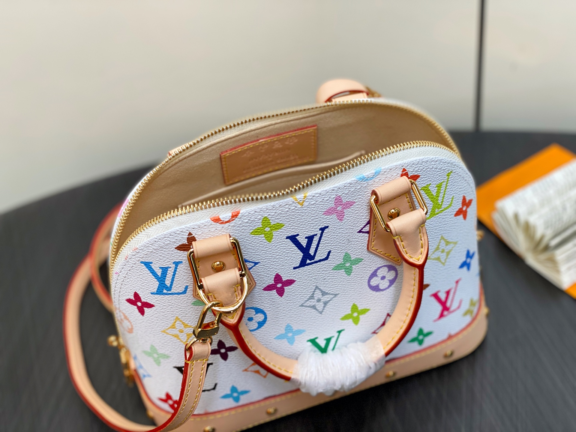 Originally inspired by a 1930s Art Deco design, this edition of the Alma BB has a celebratory spirit in the Louis Vuitton x Murakami collection’s multicolored Monogram coated canvas, which draws on the Japanese artist’s playful palette. The House’s natural cowhide leather adds an emblematic touch to the refined Toron top handles, the bottom, the removable strap, and the exclusive LV x TM keybell.