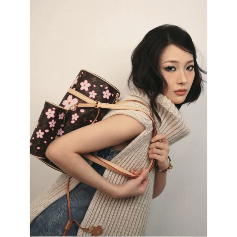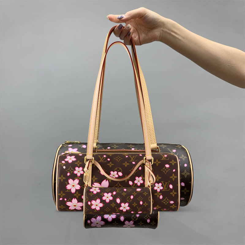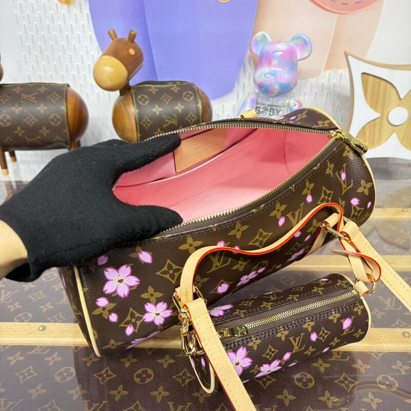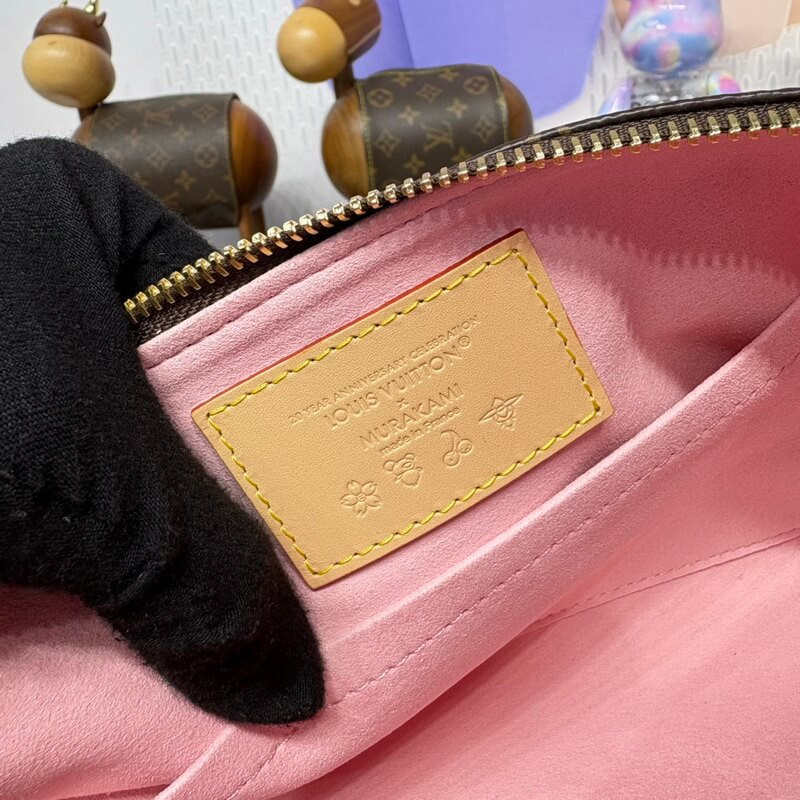 Projecting a fresh attitude in a rounded lateral silhouette, the Papillon handbag is playfully adorned with a miniature version looped through the hardware. It is crafted from the House’s iconic Monogram coated canvas with emblematic natural leather trims, while Cherry Blossom motifs from the re-edition of the Louis Vuitton x Murakami collection add a joyful statement, and studded straps complete the look with a hint of rebellion.