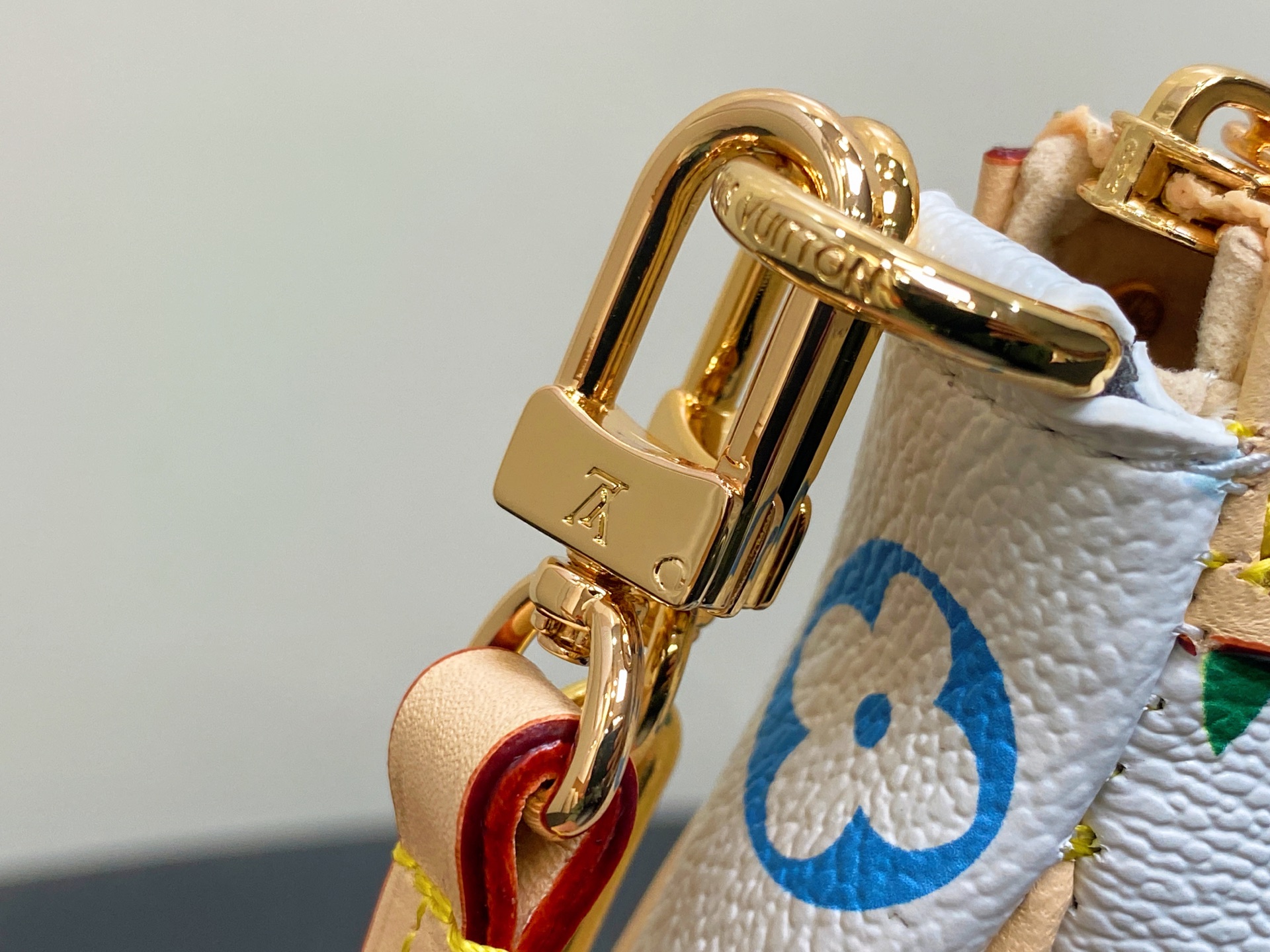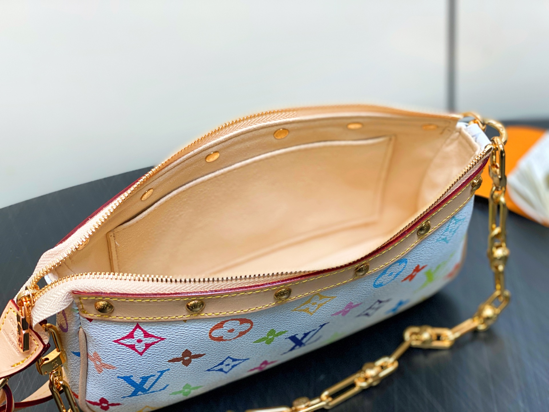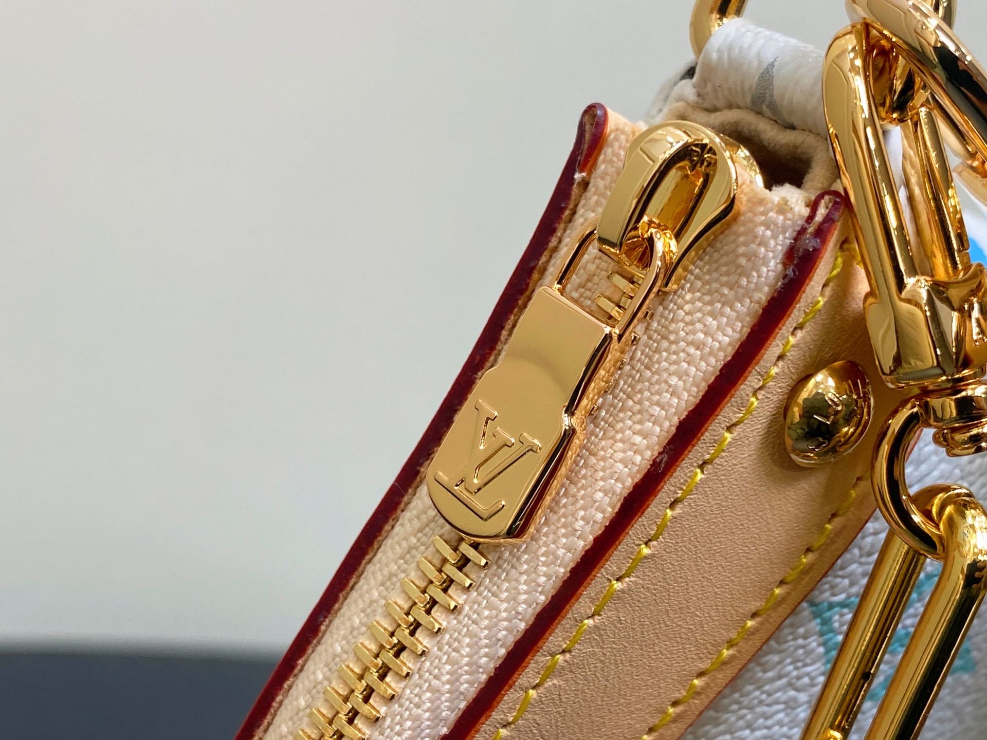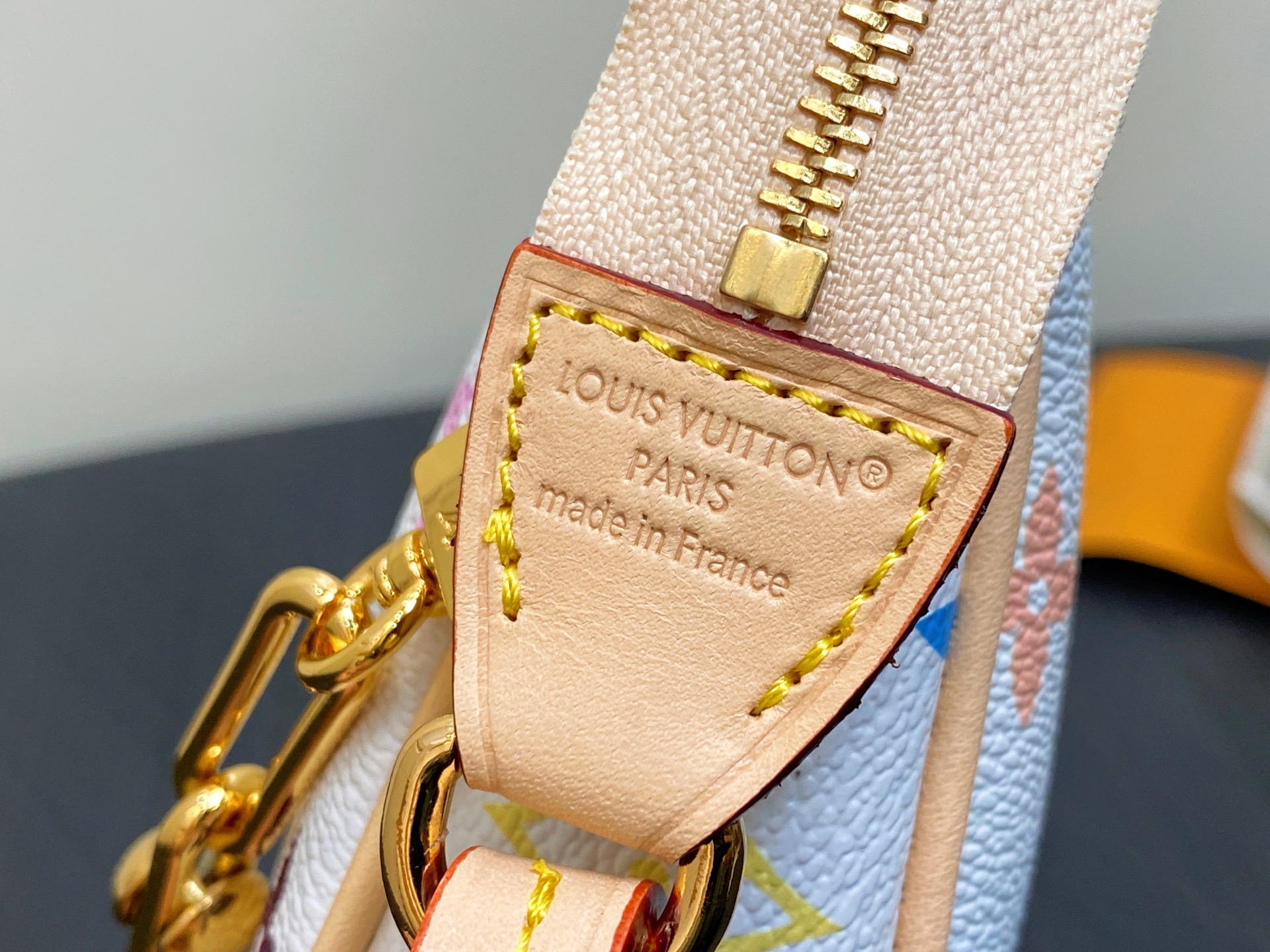 This playful edition of the classic Pochette Accessoires bag is joyfully reimagined with a multicoloured Monogram motif as part of the cross-category Louis Vuitton x Murakami Collection. Crafted from coated canvas in a petite pouch shape, a natural cowhide leather trim adds an emblematic House touch, while golden hardware introduces a chic polished accent. Complete with a removable strap and chain for versatile styling options.
