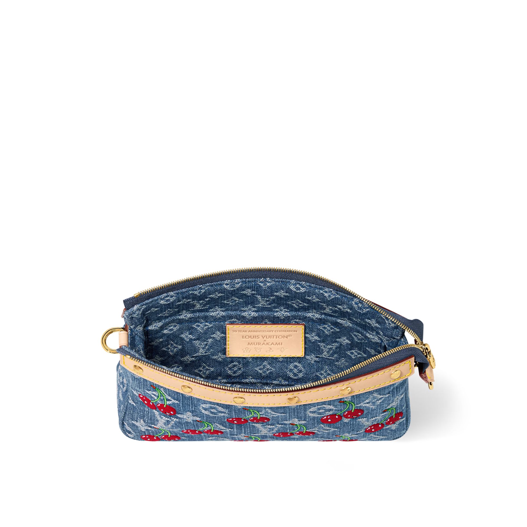 The Pochette Accessoires makes a chic statement as part of the celebratory second edition of the Louis Vuitton x Murakami collection. It is crafted from Monogram denim detailed with vibrant embroidered cherry motifs in the Japanese artist’s signature playful aesthetic, while studded leather trims and gleaming golden hardware complete the look.