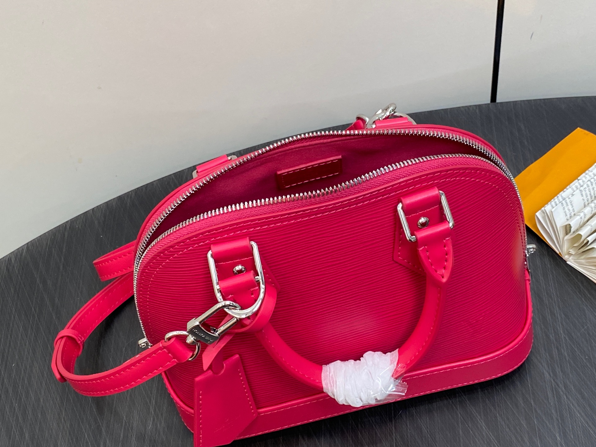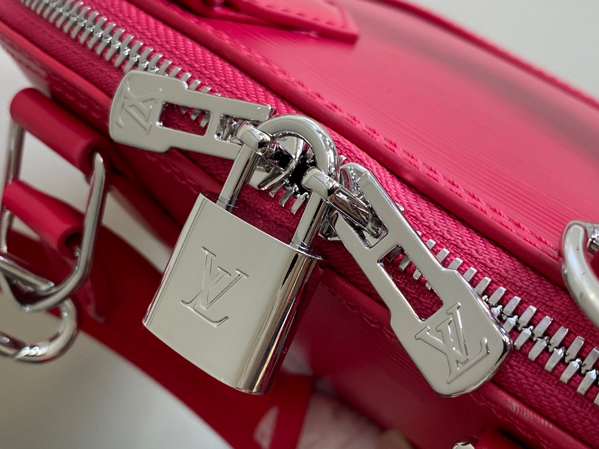 This Alma BB handbag is made from grained Epi leather with silver-color hardware. Classic House details such as the padlock and key bell elevate its Art Deco design. The microfiber-lined interior includes a flat pocket to keep things organized. The two top handles and removable and adjustable leather strap give carry options.