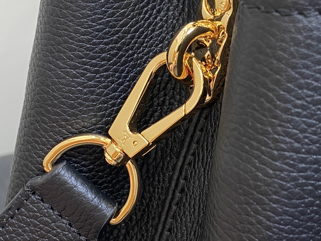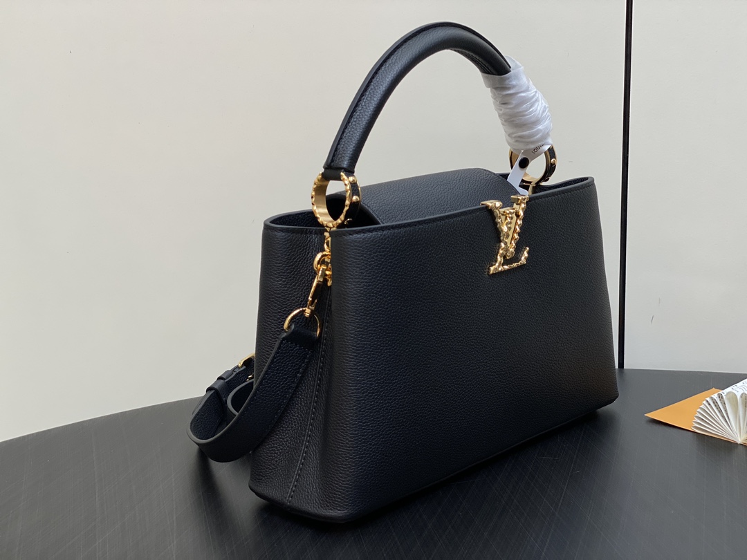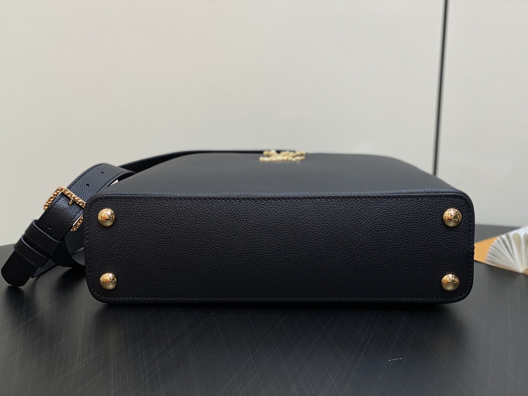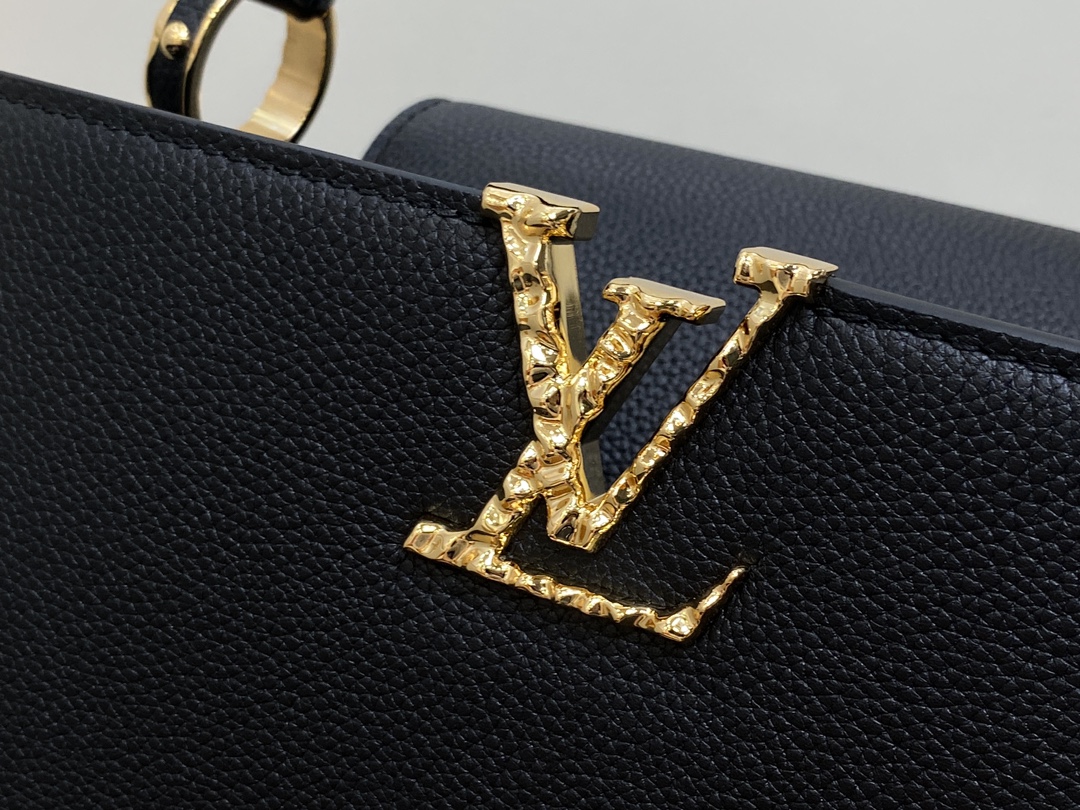 Part of the LV Crush collection, this Capucines East West MM handbag is made from grained calf leather and features LV Initials with a hammered aspect, bringing a bold feel to this classic handbag. The rolled-leather top handle enables hand or elbow carry while a thin adjustable strap – also removable – allows shoulder wear.