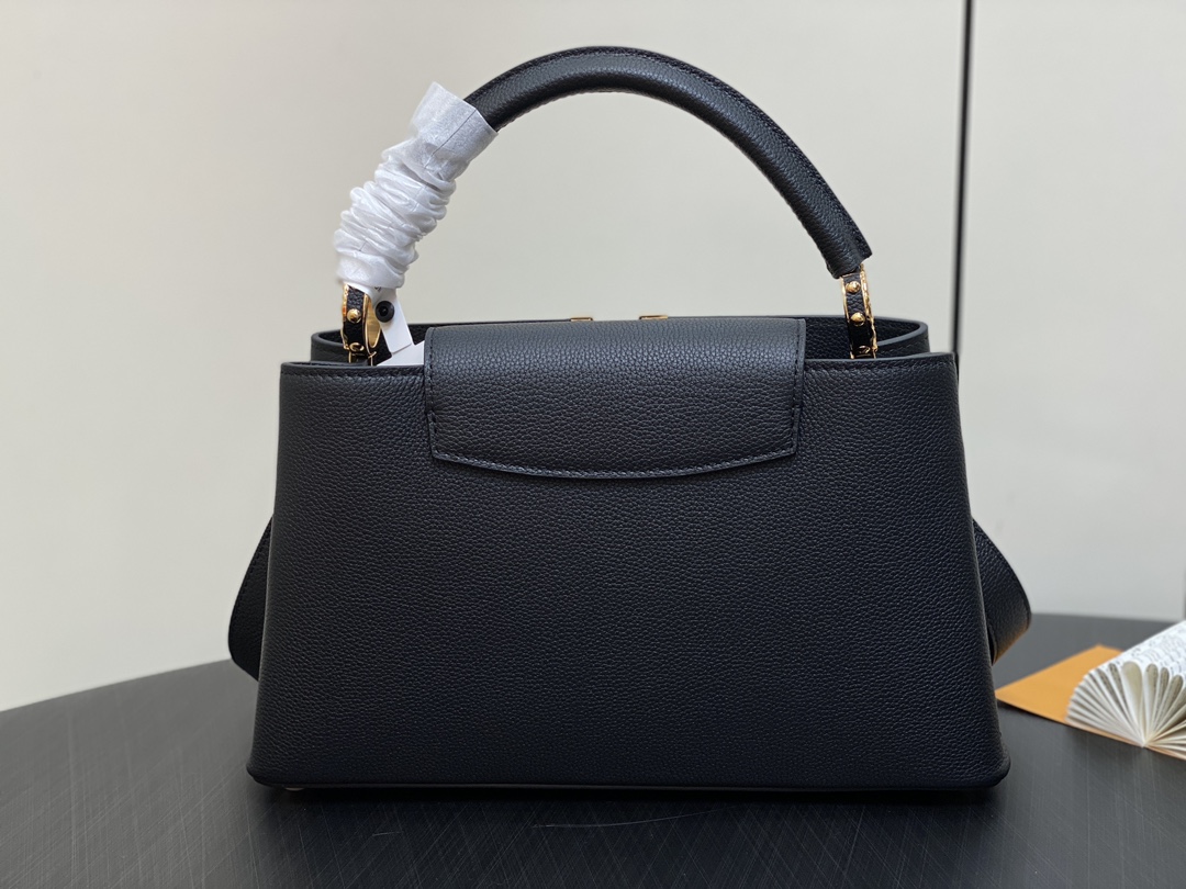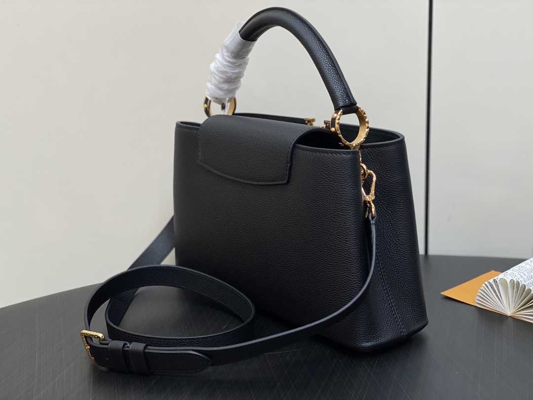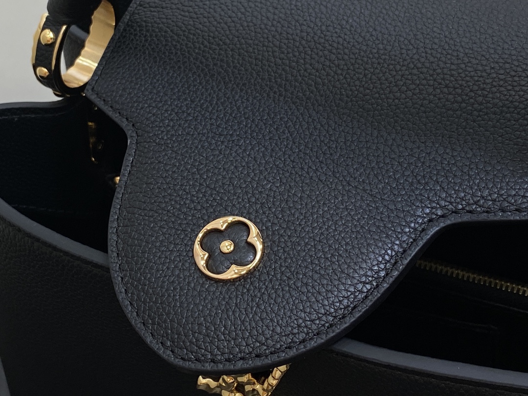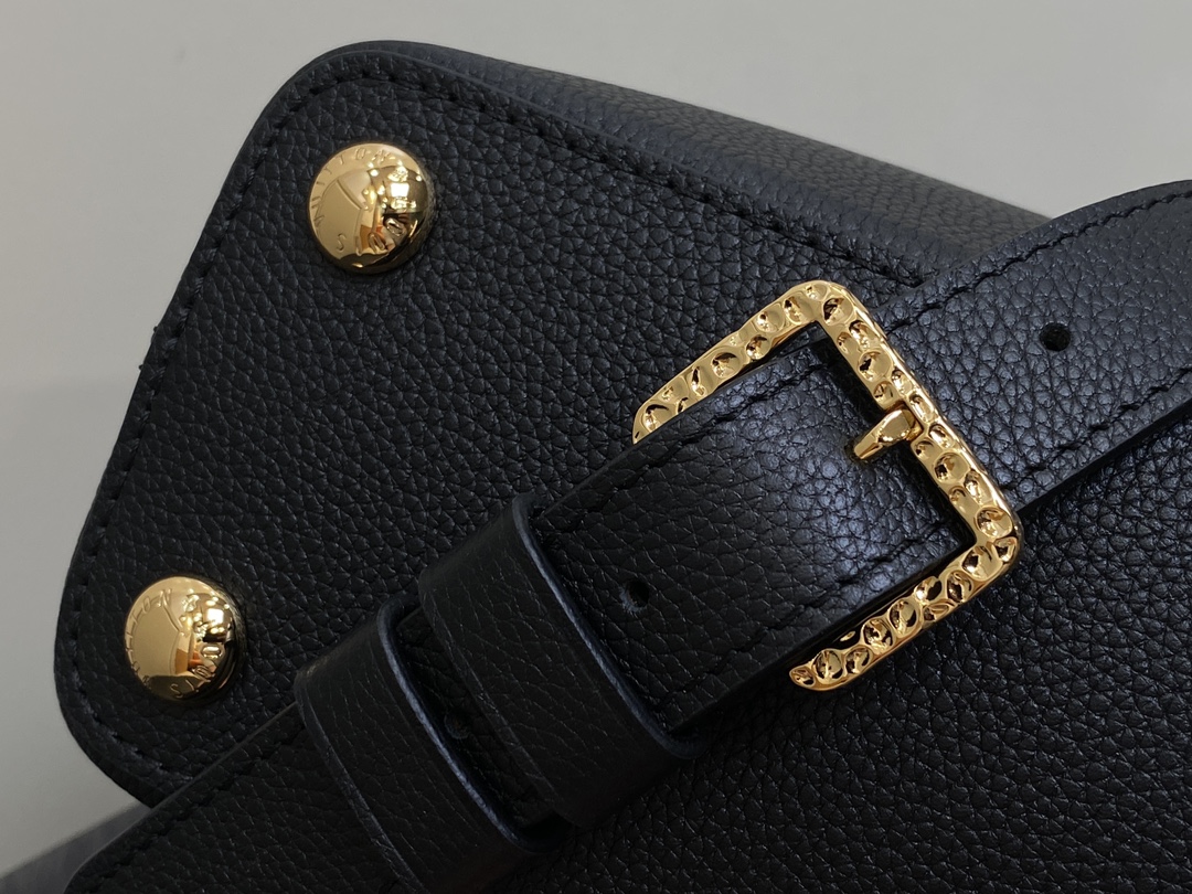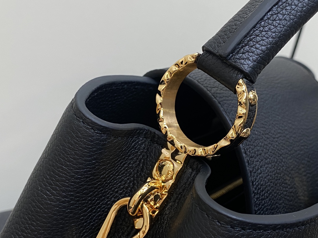 Part of the LV Crush collection, this Capucines East West MM handbag is made from grained calf leather and features LV Initials with a hammered aspect, bringing a bold feel to this classic handbag. The rolled-leather top handle enables hand or elbow carry while a thin adjustable strap – also removable – allows shoulder wear.