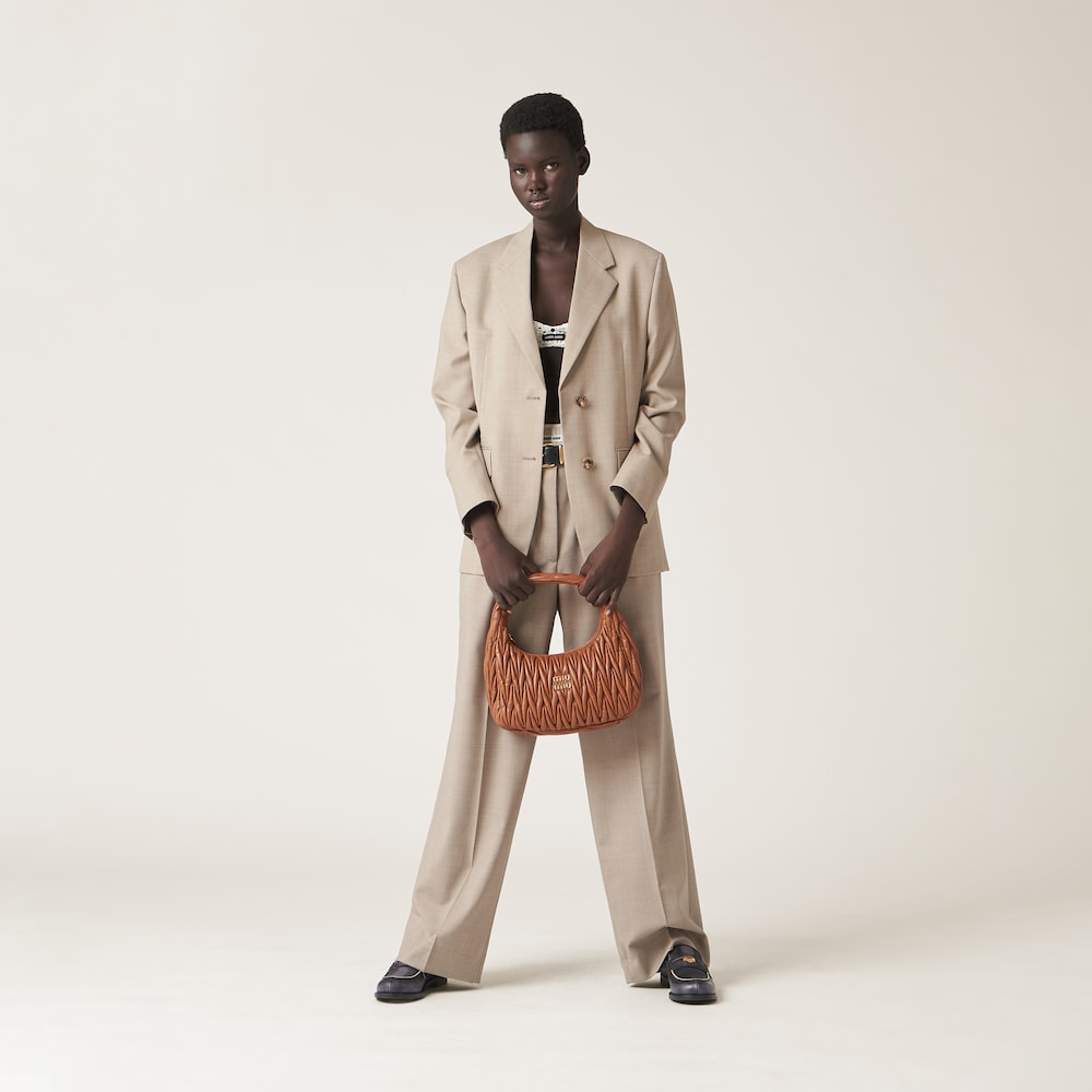 The Wander bag, reinterpreted season after season, has become an iconic accessory of Miu Miu collections. $ Made in matelassé nappa leather, the bag is characterized by the sophisticated, three-dimensional created by the fine workmanship. The hobo shape, blending retro inspirations and contemporary elegance, becomes a new synonym of modern femininity.