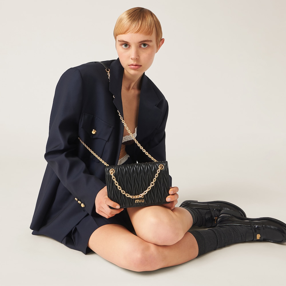 Fine matelassé workmanship creates an extremely sophisticated, textured, and three-dimensional effect on this new nappa leather mini-bag. The lettering logo on the flap, which echoes the different metallic finishes of the hardware, stands out against the refined artisan workmanship with an iconic and immediately recognizable feel. The elegant and compact silhouette, the chain shoulder strap with shoulder pad, and the magnet closure complete the design of this bag with functional and aesthetic details.