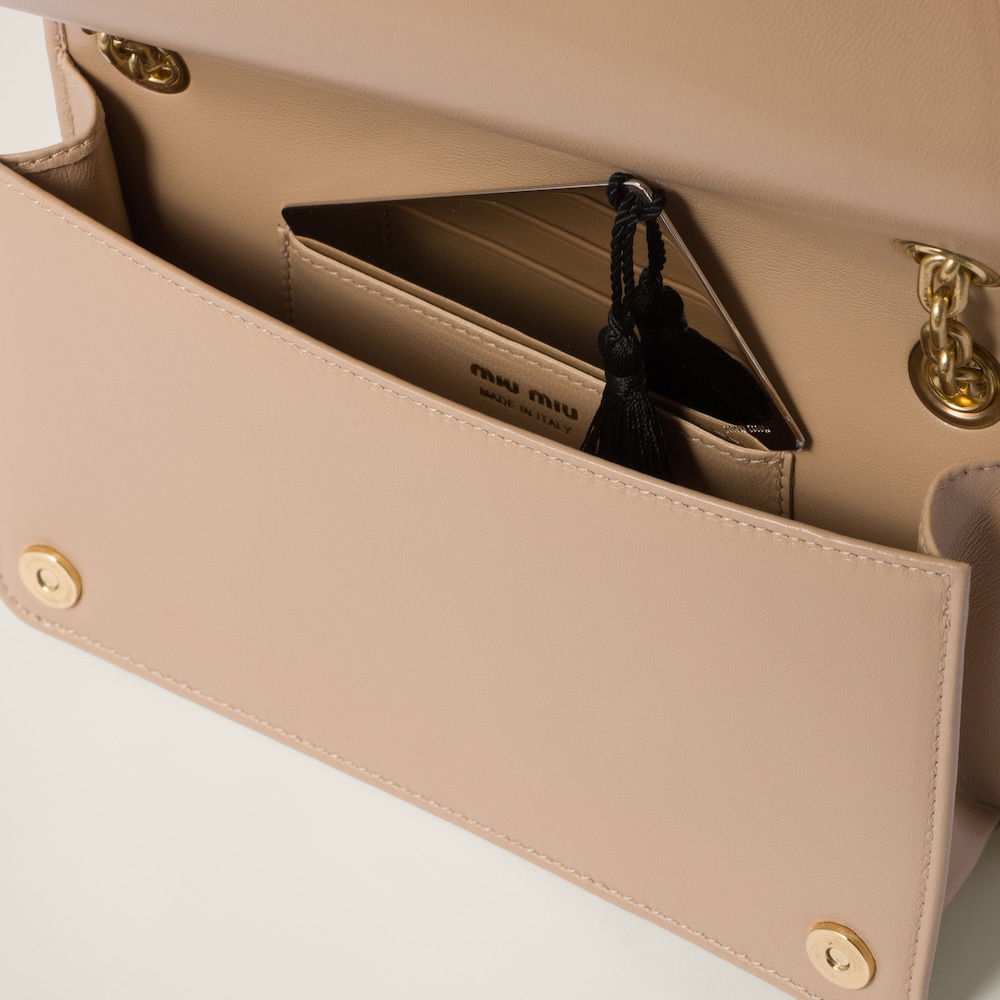 Fine matelassé workmanship creates an extremely sophisticated, textured, and three-dimensional effect on this new nappa leather mini-bag. The lettering logo on the flap, which echoes the different metallic finishes of the hardware, stands out against the refined artisan workmanship with an iconic and immediately recognizable feel. The elegant and compact silhouette, the chain shoulder strap with shoulder pad, and the magnet closure complete the design of this bag with functional and aesthetic details.