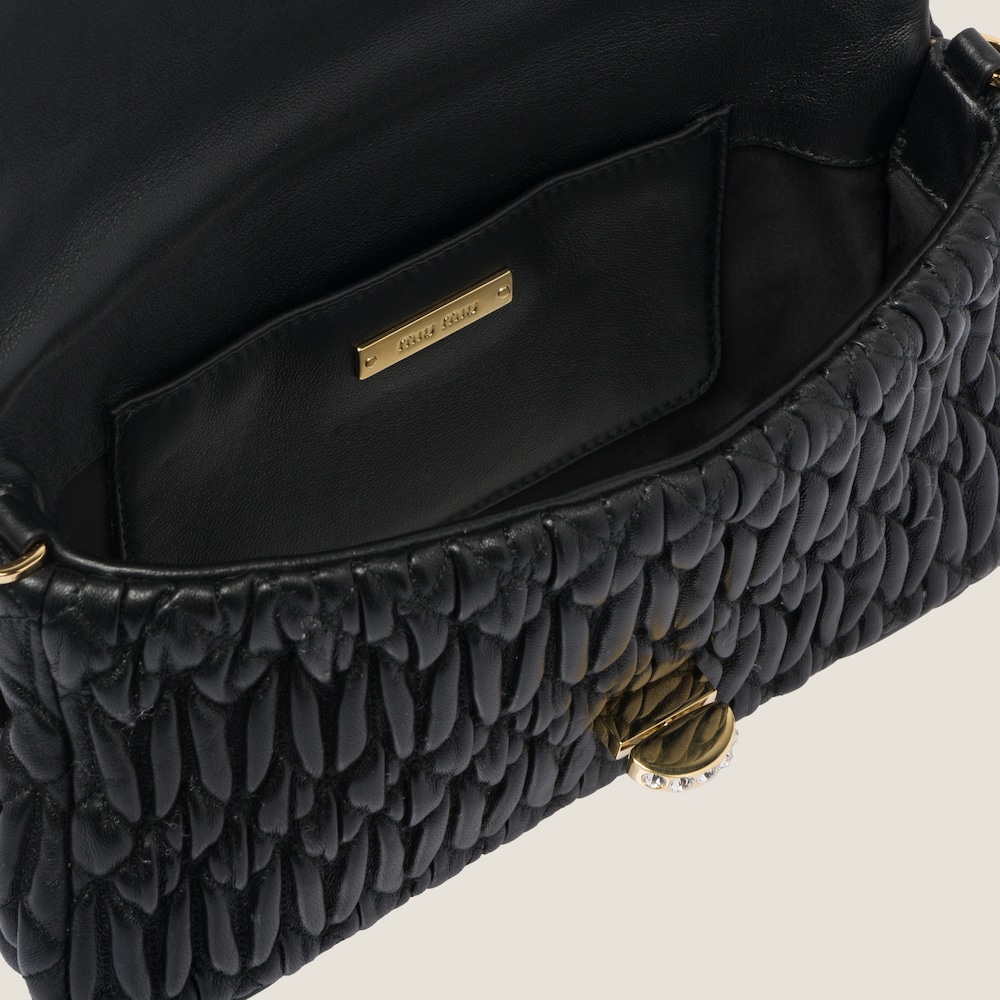 The iconic Cloquet motif distinguishes the design of the Miu Crystal bag, here with double shoulder strap: with crystals and woven nappa leather. $ The accessory is illuminated by the crystal-studded clasp.