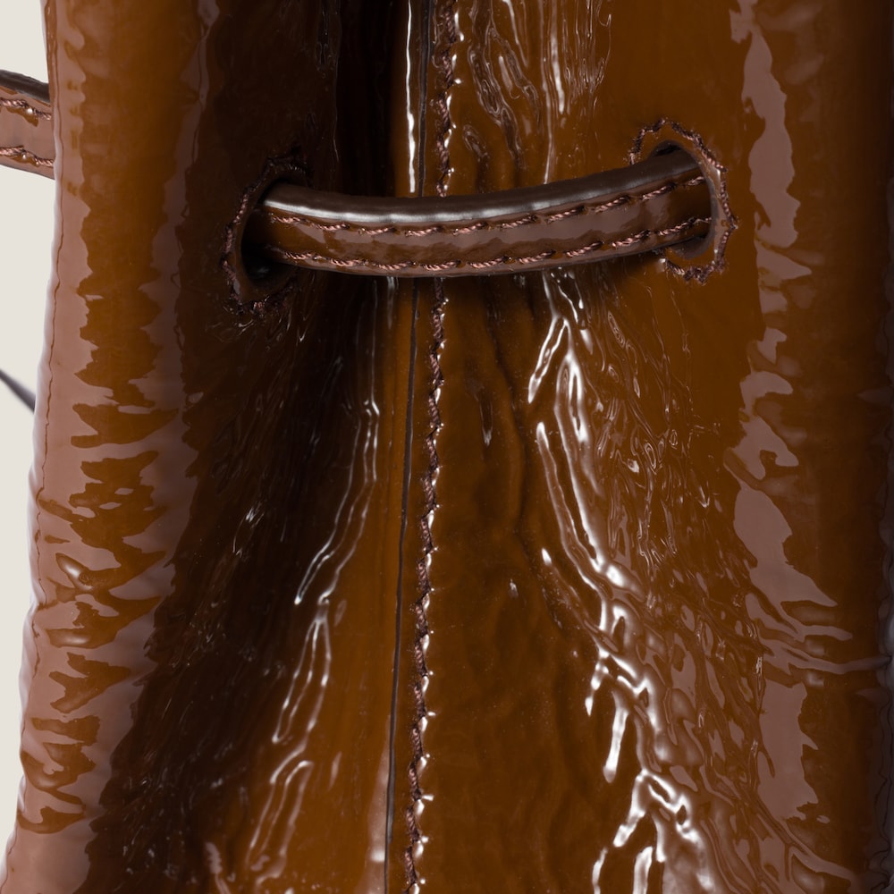 Retro inspiration defines this naplak patent leather pouch. The special treatment of leather and metal lettering logo embody the experimental and bold elegance of Miu Miu.