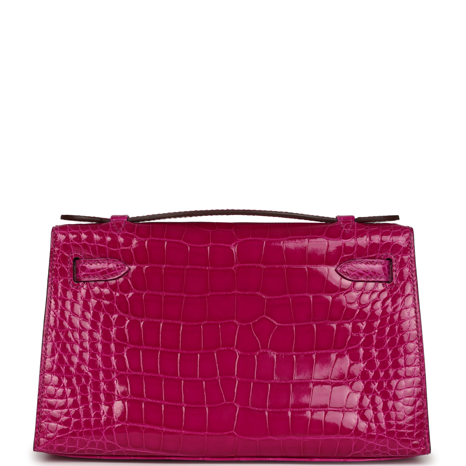 This Mini Kelly Pochette is in Rose Scheherazade shiny Mississippiensis alligator with gold hardware and has tonal stitching, front flap, two straps with center toggle closure and a top flat handle.