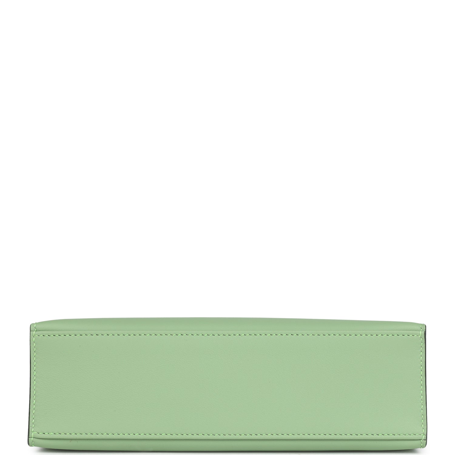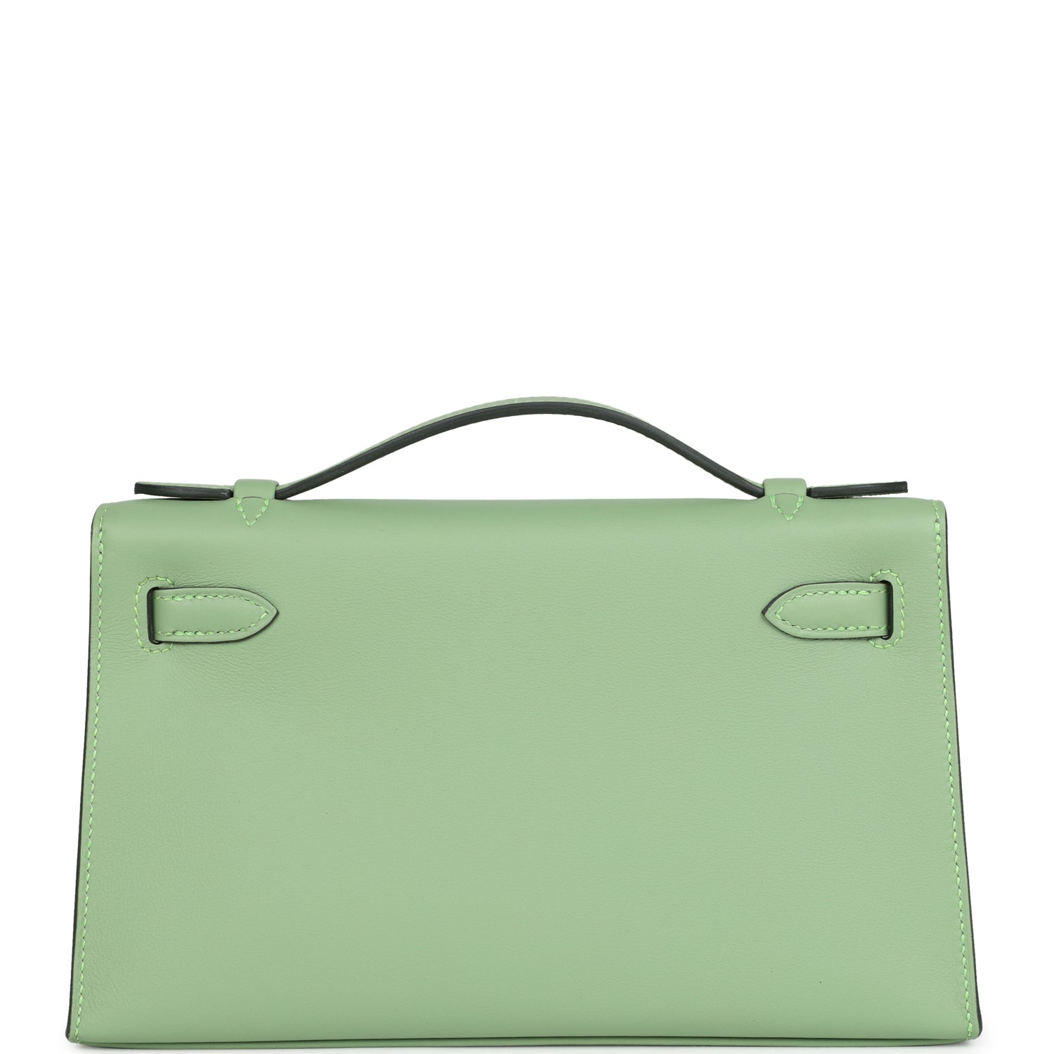 This Kelly Pochette is in Vert Criquet swift leather with palladium hardware and has tonal stitching, front flap, two straps with center toggle closure and a top flat handle.