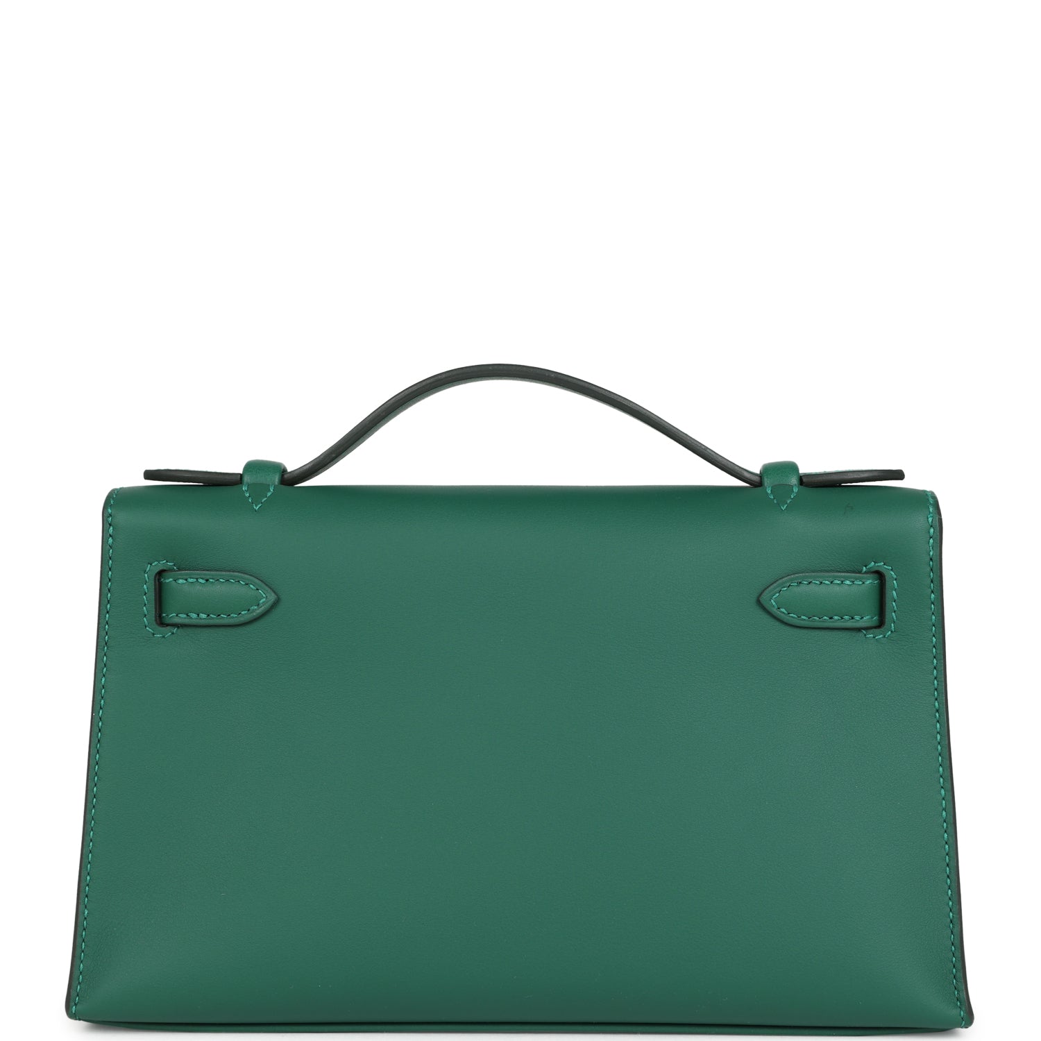 This Kelly Pochette is in Vert Moyen swift leather with palladium hardware and has tonal stitching, front flap, two straps with center toggle closure and a top flat handle.
