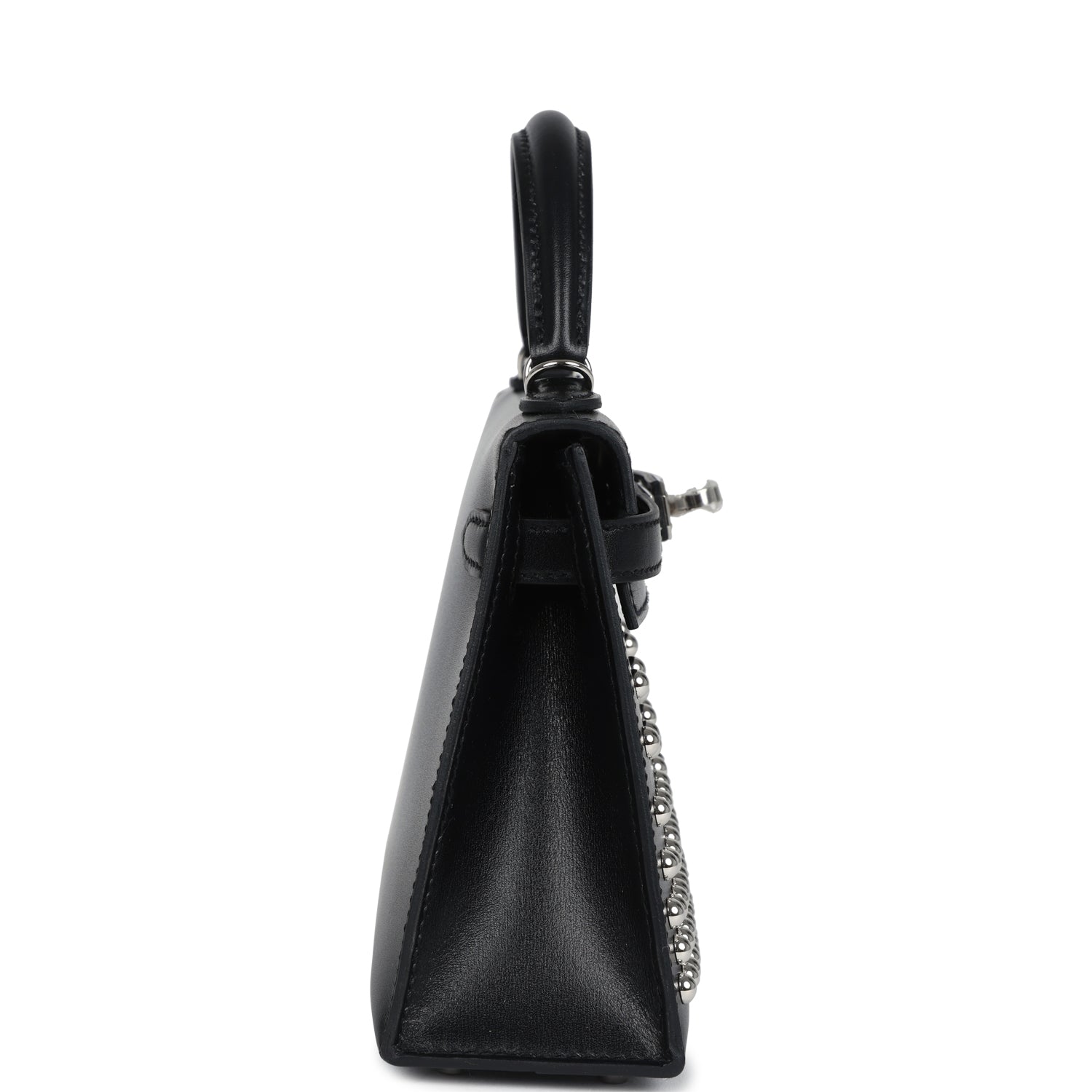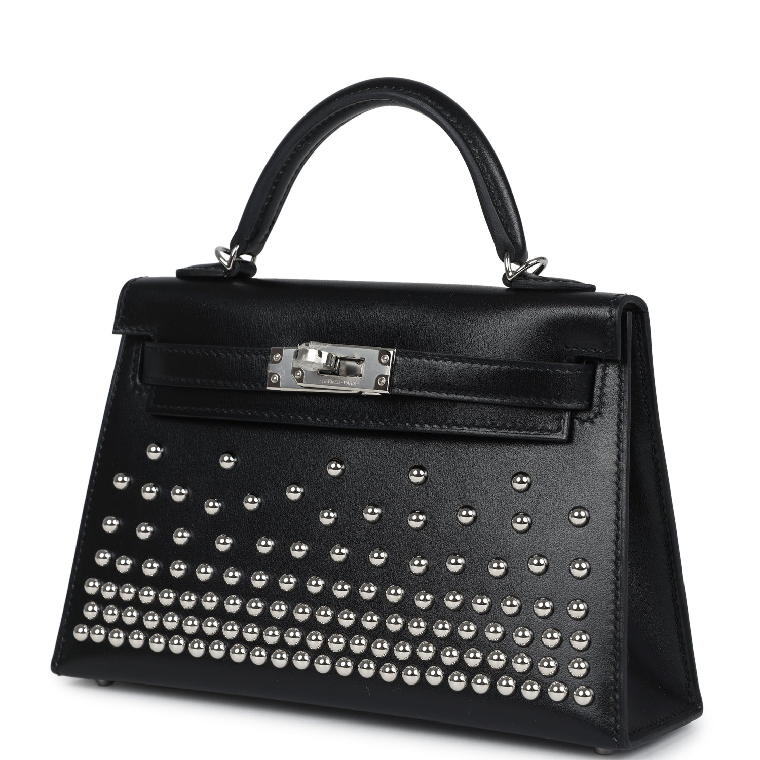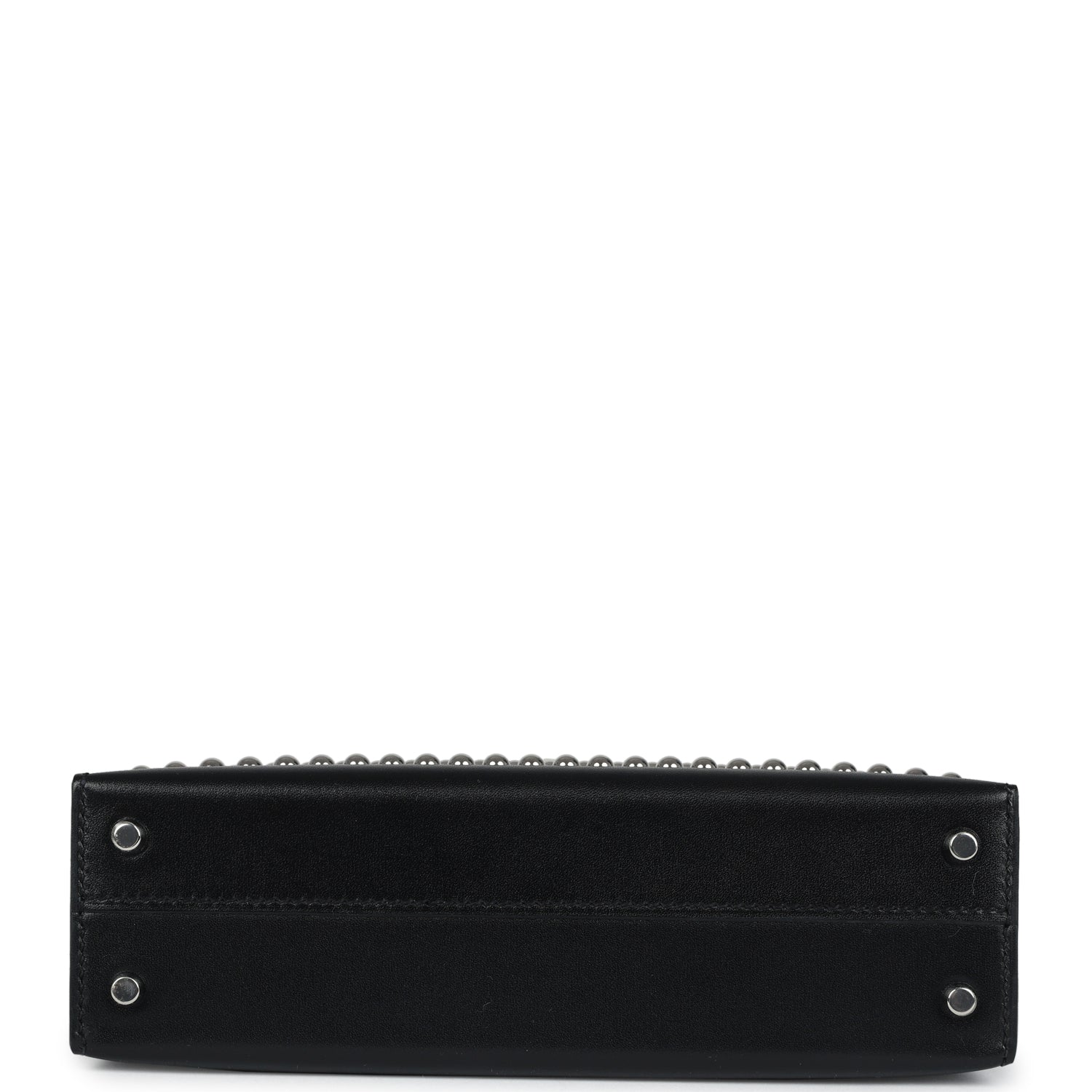This limited edition Kelly, in the Sellier style, is in Black boxcalf leather with palladium hardware and has palladium rounds studs, tonal stitching, two front straps with front toggle closure, single rolled handle and removable shoulder strap.