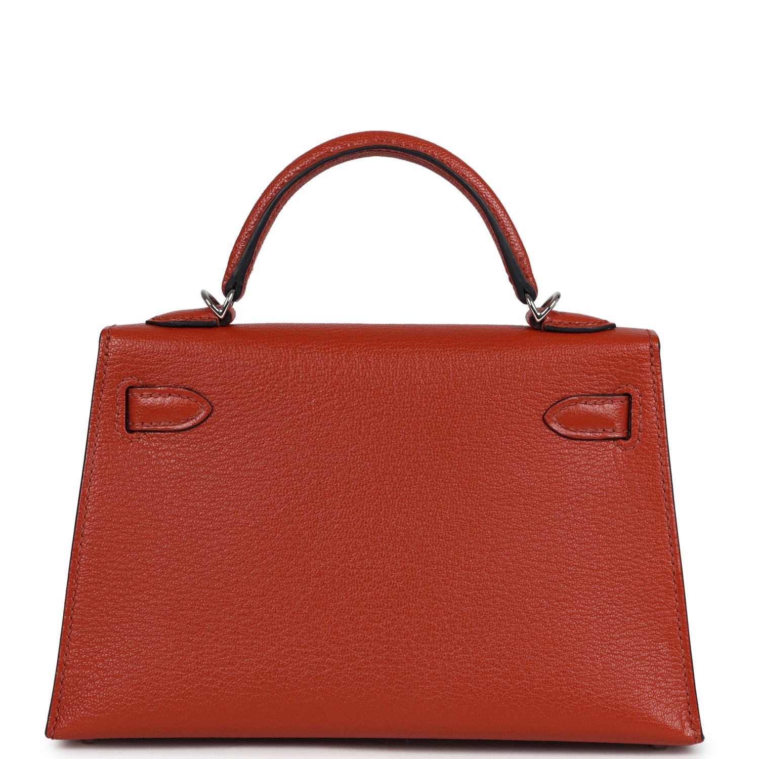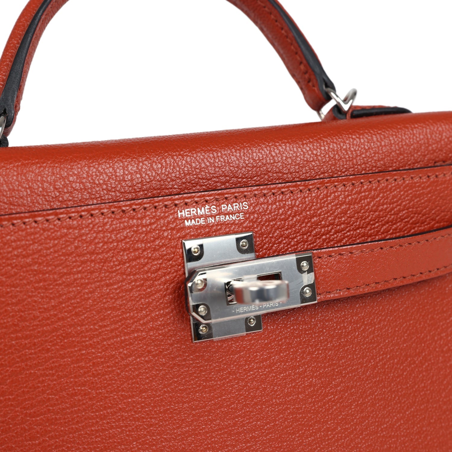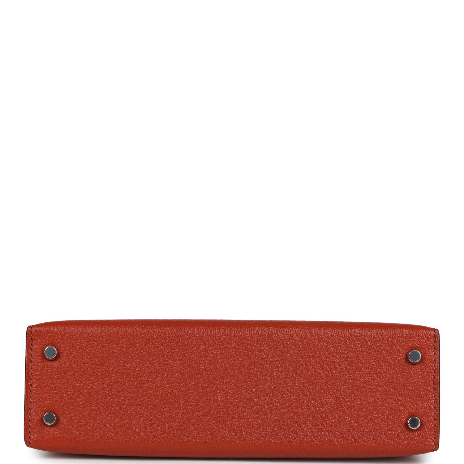 This Kelly, in the Sellier style, is in Cuivre chevre mysore leather with palladium hardware and has tonal stitching, two straps with front toggle closure, single rolled handle and a Rose Mexico removable shoulder strap.