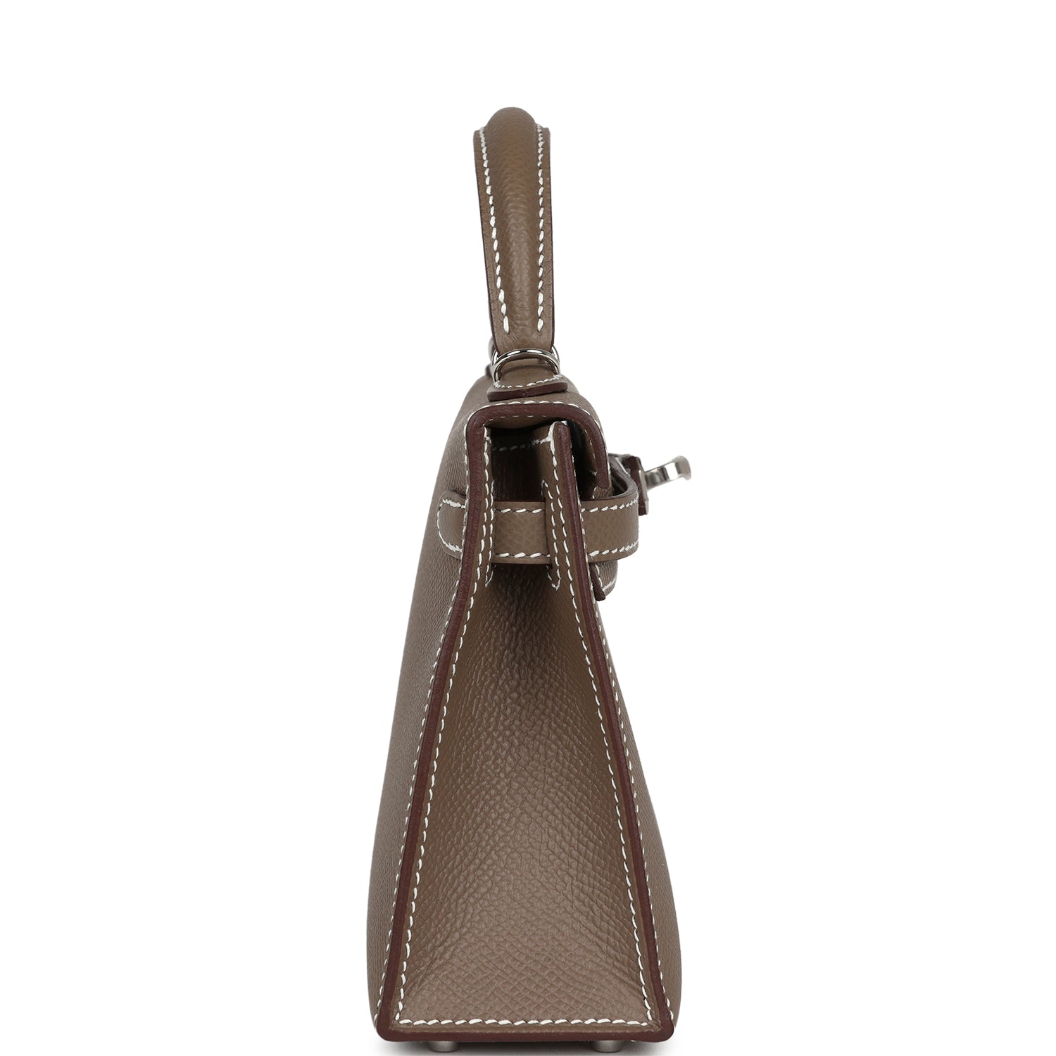 This Kelly, in the Sellier style, is in Etoupe epsom leather with palladium hardware and has contrast stitching, two straps with front toggle closure, single rolled handle and removable shoulder strap.