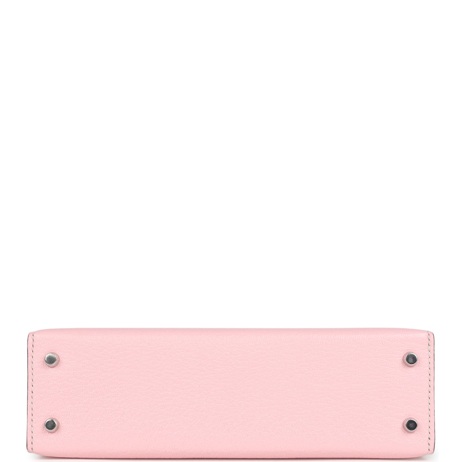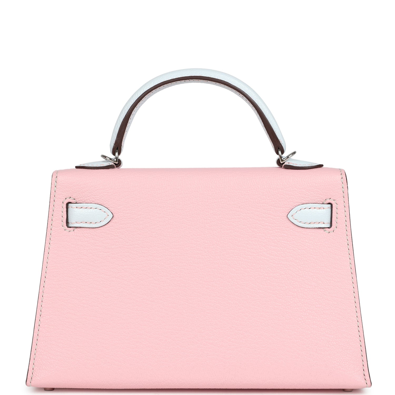 This Special Order Kelly, in the Sellier style, is in Rose Sakura and Bleu Brume chevre mysore leather with palladium hardware, has tonal stitching, two front straps with front toggle closure, single rolled handle and removable shoulder strap.