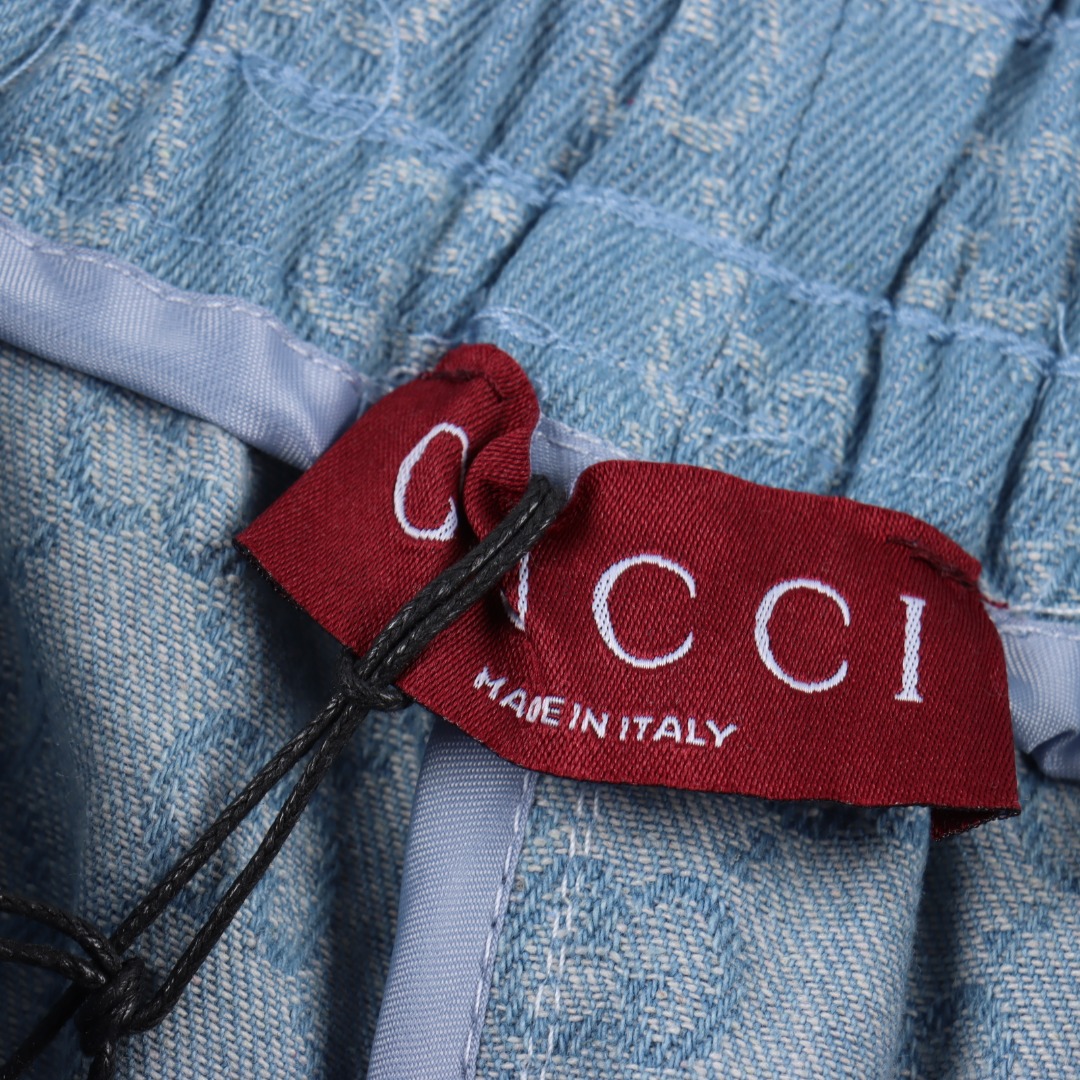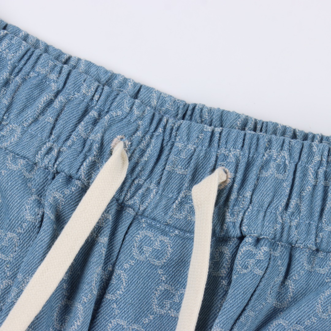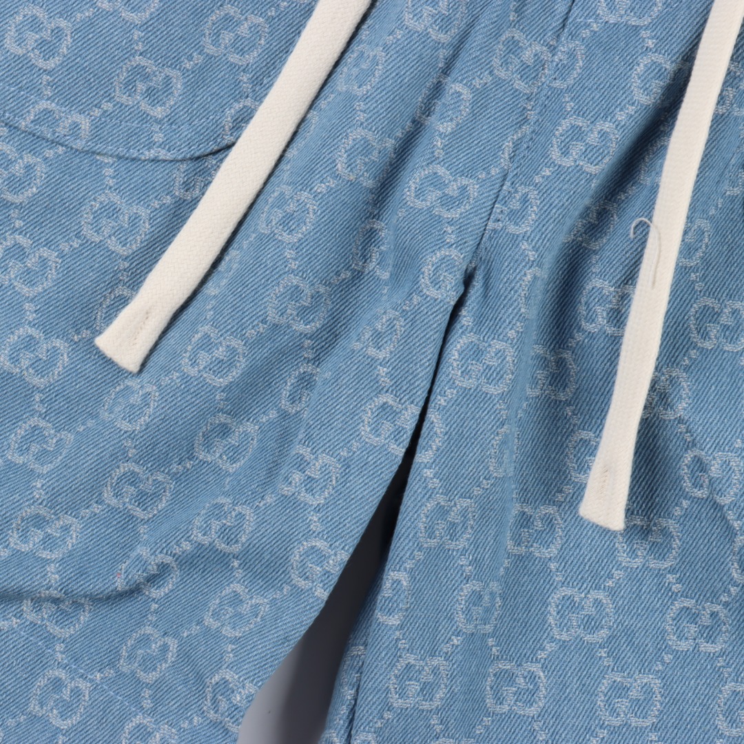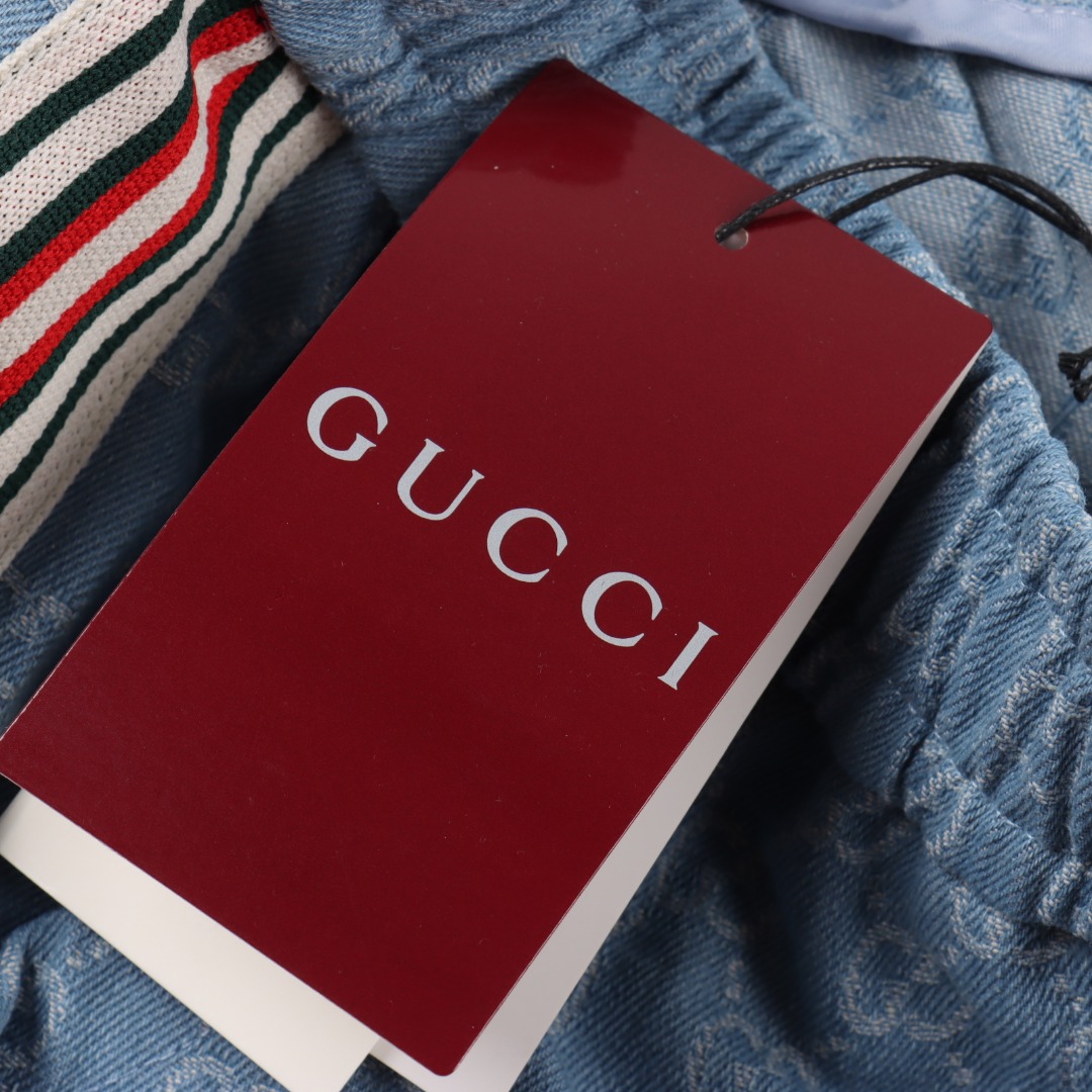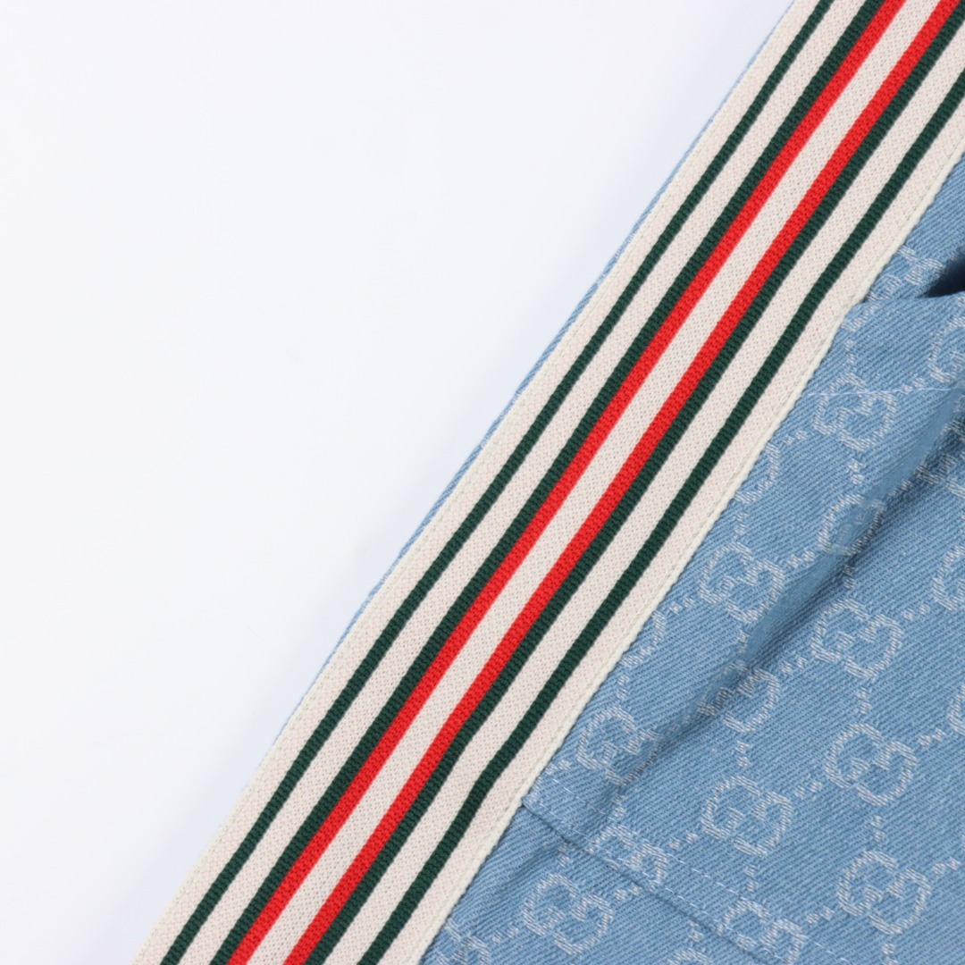 Interlocking double G print, drawstring elastic waistband, straight shorts style, full set of accessories! Polyester fiber is a blended fabric, and the contrasting color fabric is fixed and dyed environmentally friendly. It also has good light resistance, and its sun resistance is better than natural fiber fabrics. It uses three-level bird's eye cloth fabric, which is a functional weft knitted fabric with moisture absorption and perspiration function. The principle of perspiration is through the small holes on its surface. Due to the existence of these small holes, it can achieve the effect of moisture absorption and perspiration. The double G pattern is made of thick glue material, and the glue is specially adjusted with environmentally friendly glue. The front end of the elastic waist rope has a metal bell with engraving, the front trouser line is stitched, and the trouser legs are closed with visible lines, which are strong and durable.