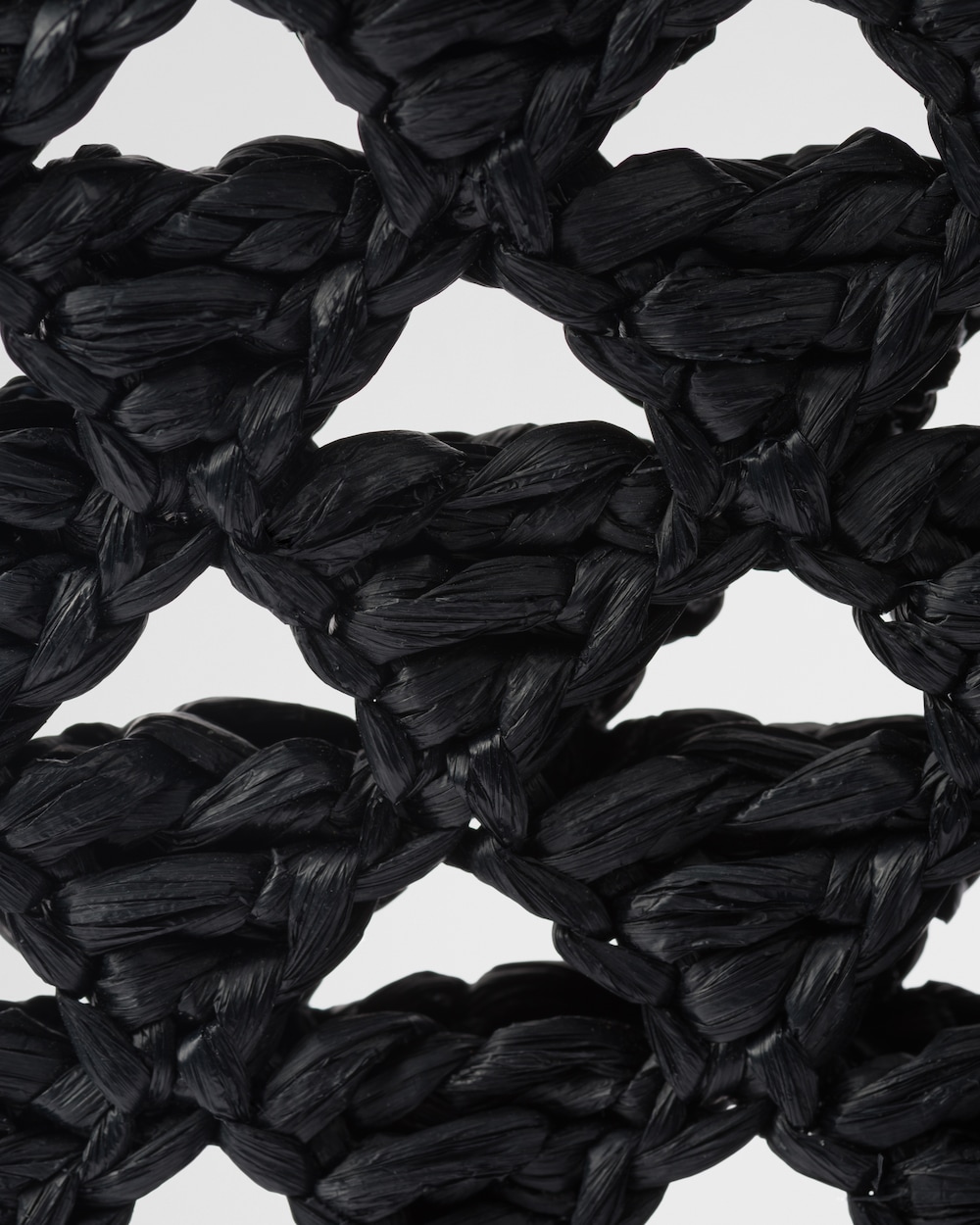 This tote bag with a summery mood reinterprets classic styles in crochet with a modern, sophisticated design. The light, roomy accessory is enhanced by a refined geometric motif inspired by the iconic Prada triangle, while the embroidered lettering logo in a contrasting color completes it with a distinctive touch.