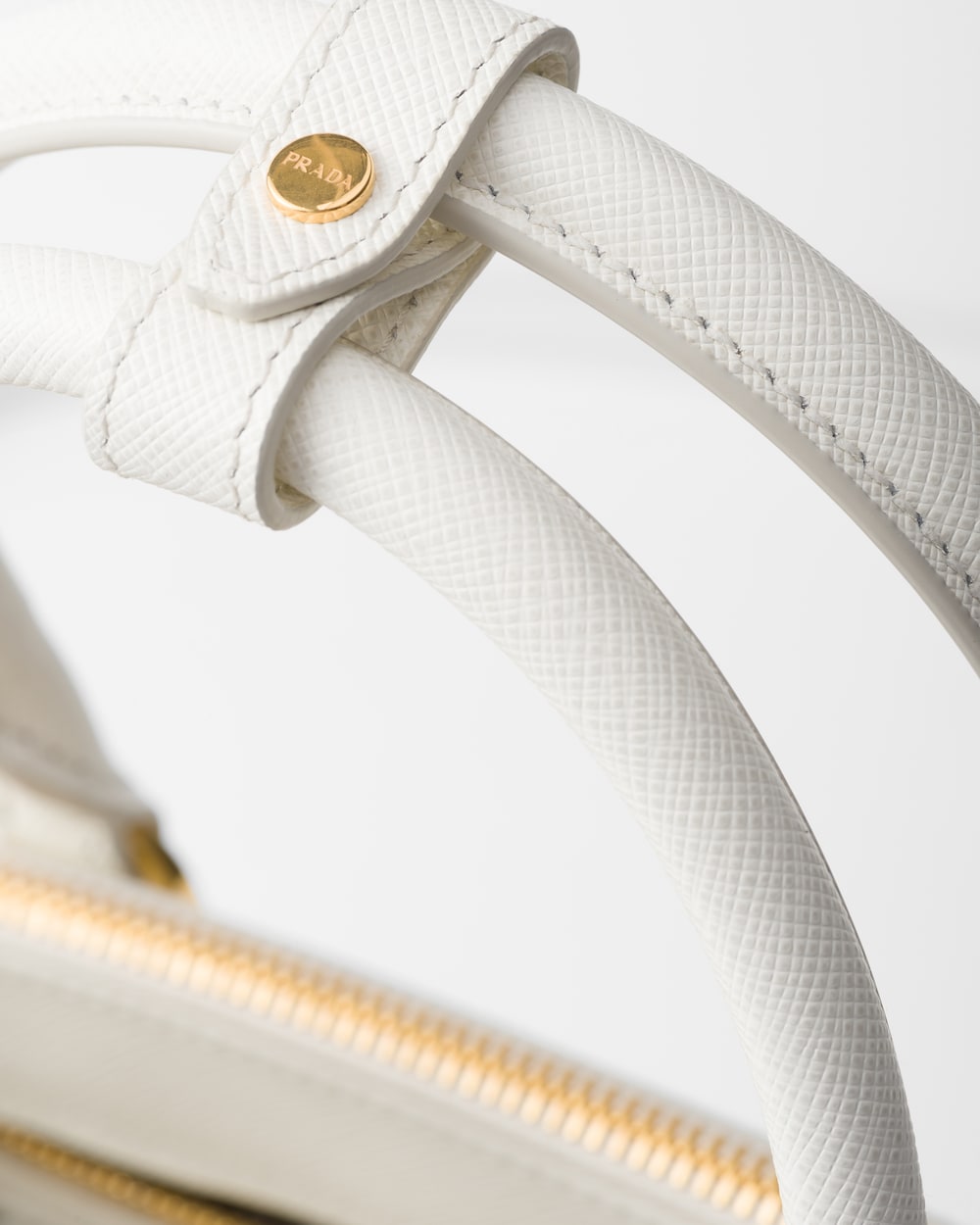 Production of the Prada Galleria bag, composed of 83 pieces, is an authentic fusion between industrial precision and the refined accuracy of craftsmanship that can only be performed by hand. The design is clean and elegant yet innately pragmatic, an aesthetic language blending form and function that combines history and modernity. Originating the definition of “timeless”, the Galleria bag has become a hallmark of Prada’s identity in the twenty-first century. The accessory, presented in the medium version, is made of iconic Saffiano, a calf leather patented by Mario Prada that is resistant to scratches and water and defined by its crosshatch texture.