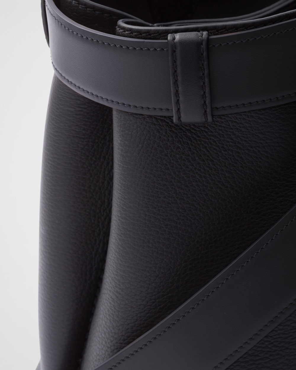 Clean lines and refined elements tell the story of Prada’s dual aesthetic that moves between simplicity and detail, functionality and elegance. This leather bag with nappa interior summarizes the stylistic codes of the brand in a pragmatic yet sophisticated design. The silhouette is characterized by a multifaceted soul, expressed by the interchangeable belt that enriches the accessory with a unique and contemporary touch. The lettering logo, embossed in 22 karat gold leaf, decorates the modern, versatile style.