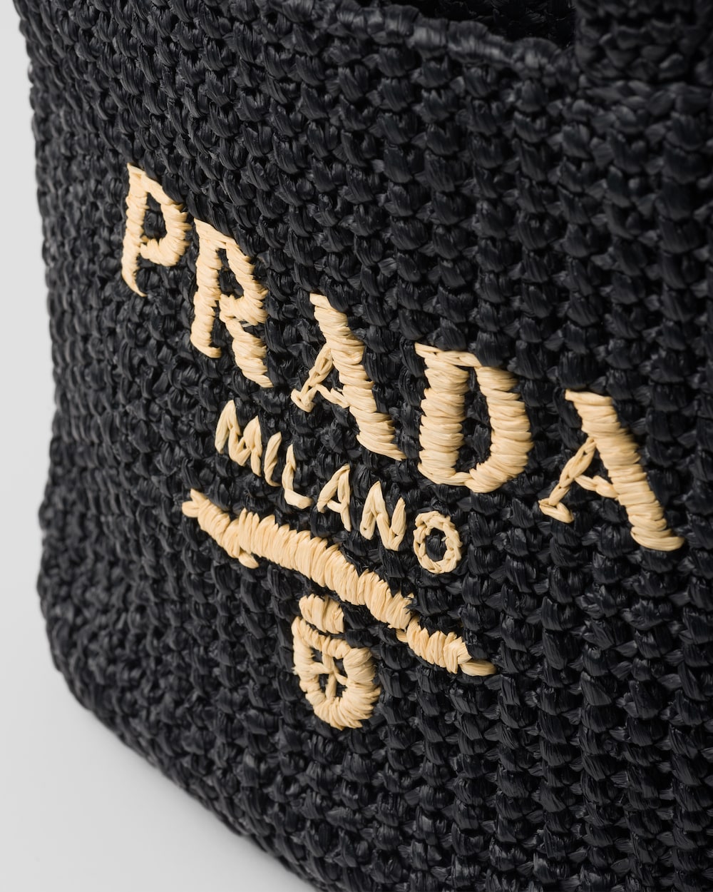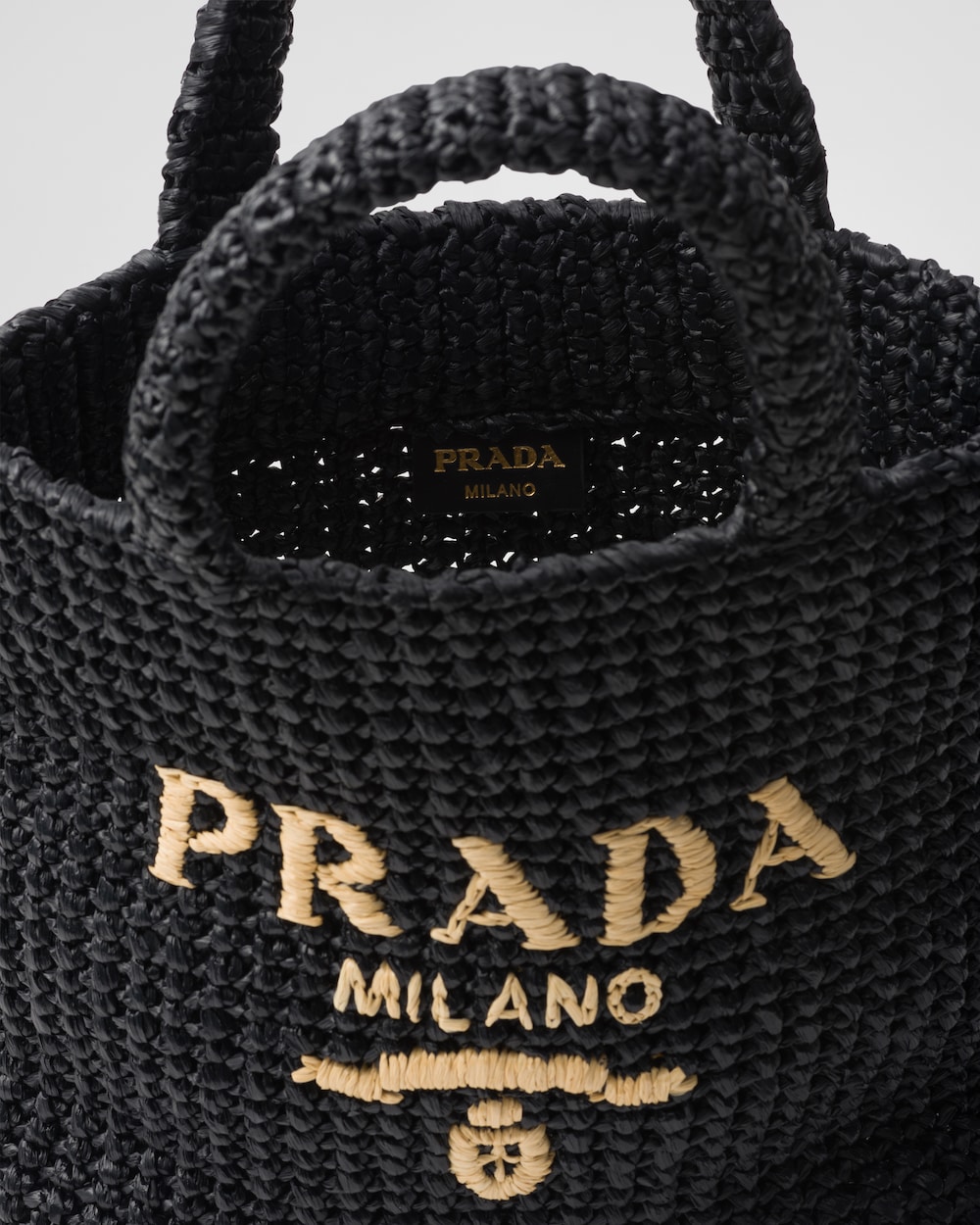 This tote bag with a soft, deconstructed design is made of raffia-effect yarn, a light material with a summery mood. The embroidered lettering logo decorates the front, while the emblematic triangle in enameled metal embellishes the side.