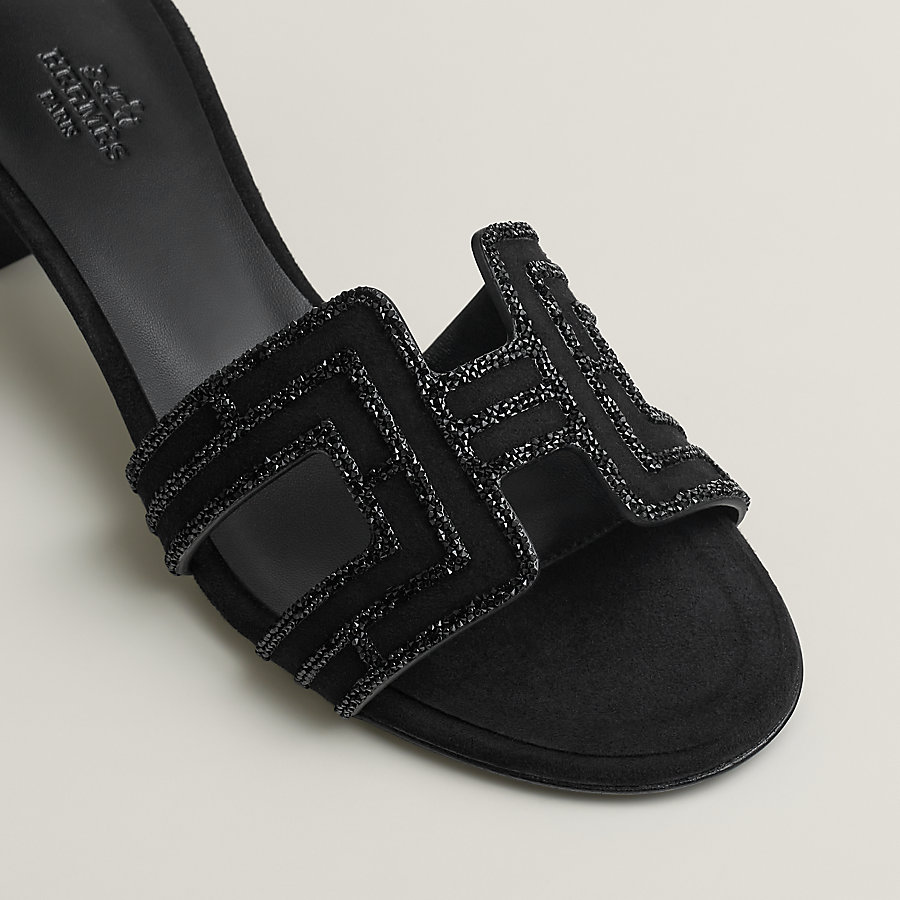 High heel sandal in suede goatskin with iconic “H” cut-out and “Arcane” rhinestone motif.